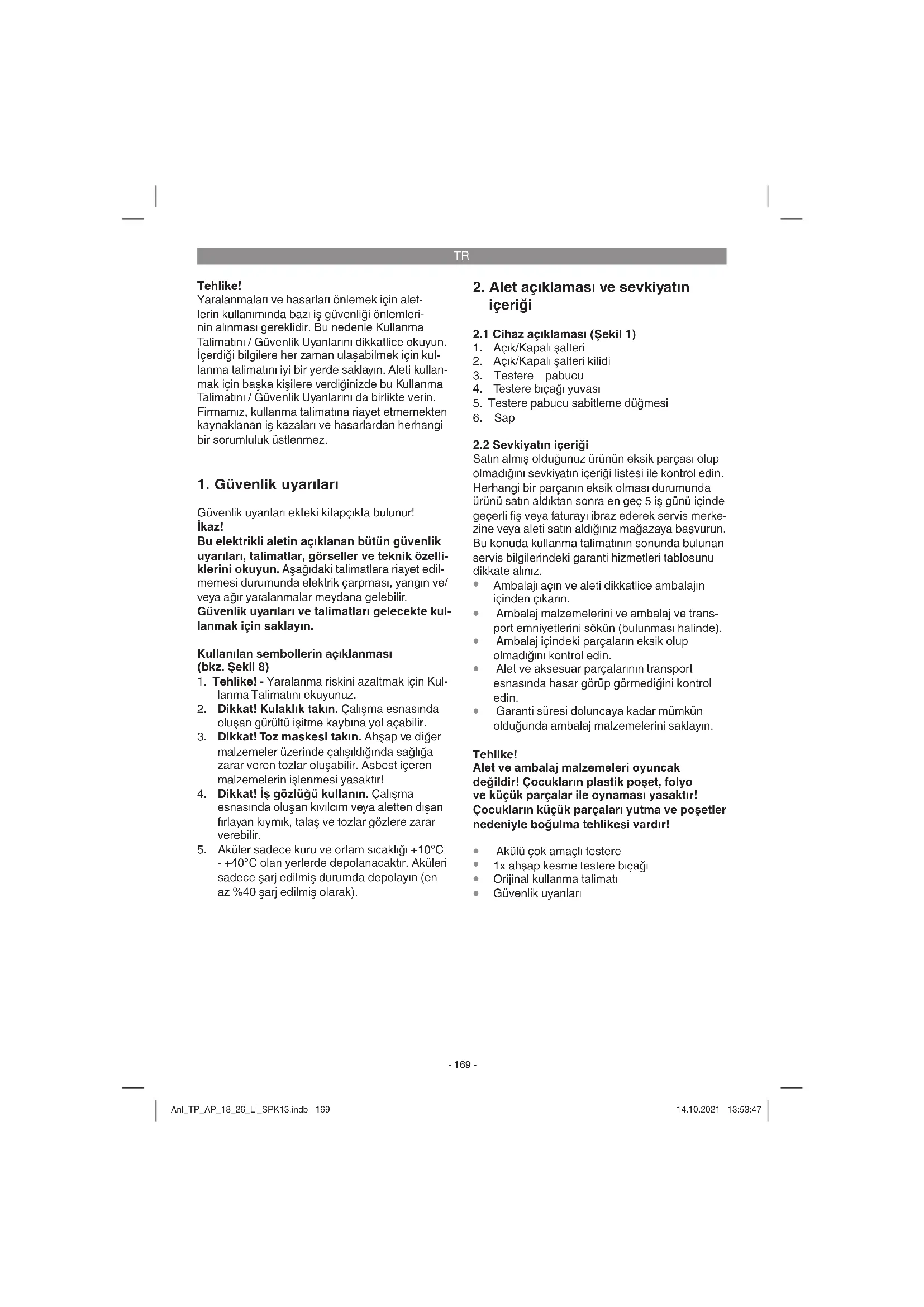 talimatlara göre kullanılmadığında veya bakımı düzgün şekilde yapılmadığında el-kol titreşiminden kaynaklanan sağlık hasarlarının oluşması. Anl_TP_AP_18_26_Li_SPK13.indb 170Anl_TP_AP_18_26_Li_SPK13.indb 170 14.10.2021 13:53:4714.10.2021 13:53:47TR