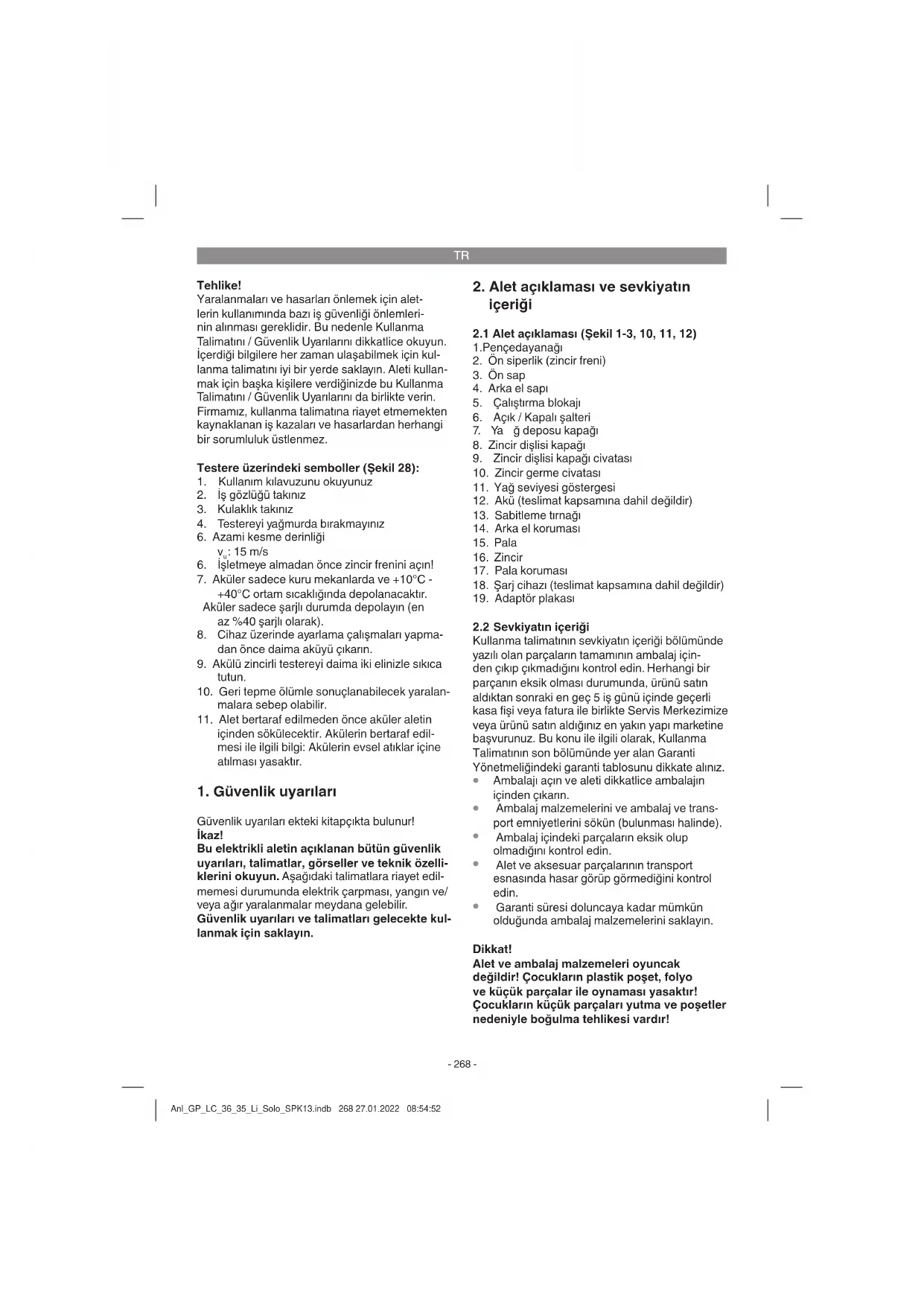 Garanti süresi doluncaya kadar mümkün olduğunda ambalaj malzemelerini saklayın. Dikkat! Alet ve ambalaj malzemeleri oyuncak değildir! Çocukların plastik poşet, folyo ve küçük parçalar ile oynaması yasaktır! Çocukların küçük parçaları yutma ve poşetler nedeniyle boğulma tehlikesi vardır! Anl_GP_LC_36_35_Li_Solo_SPK13.indb 268 27.01.2022 08:54:52TR