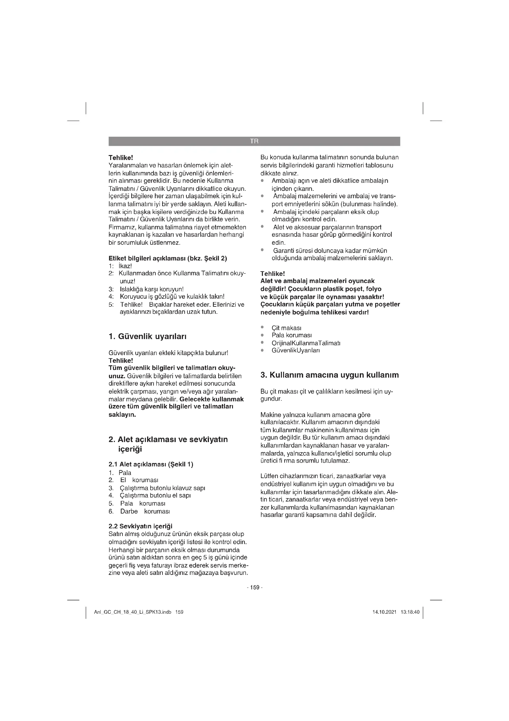 Bu çit makası çit ve çalılıkların kesilmesi için uy- gundur. Makine yalnızca kullanı m amacına göre kullanılacaktır. Kullanım amacının dışındaki tüm kullanımlar makinenin kullanılması için uygun değildir. Bu tür kullanım amacı dışındaki kullanımlardan kaynaklanan hasar ve yaralan- malarda, yalnızca kullanıcı/işletici sorumlu olup üretici fi rma sorumlu tutulamaz. Lütfen cihazlarımızın ticari, zanaatkarlar veya endüstriyel kullanım için uygun olmadığını ve bu kullanımlar için tasarlanmadığını dikkate alın. Ale- tin ticari, zanaatkarlar veya endüstriyel veya ben- zer kullanımlarda kullanılmasından kaynaklanan hasarlar garanti kapsamına dahil değildir. Anl_GC_CH_18_40_Li_SPK13.indb 159Anl_GC_CH_18_40_Li_SPK13.indb 159 14.10.2021 13:18:4014.10.2021 13:18:40TR