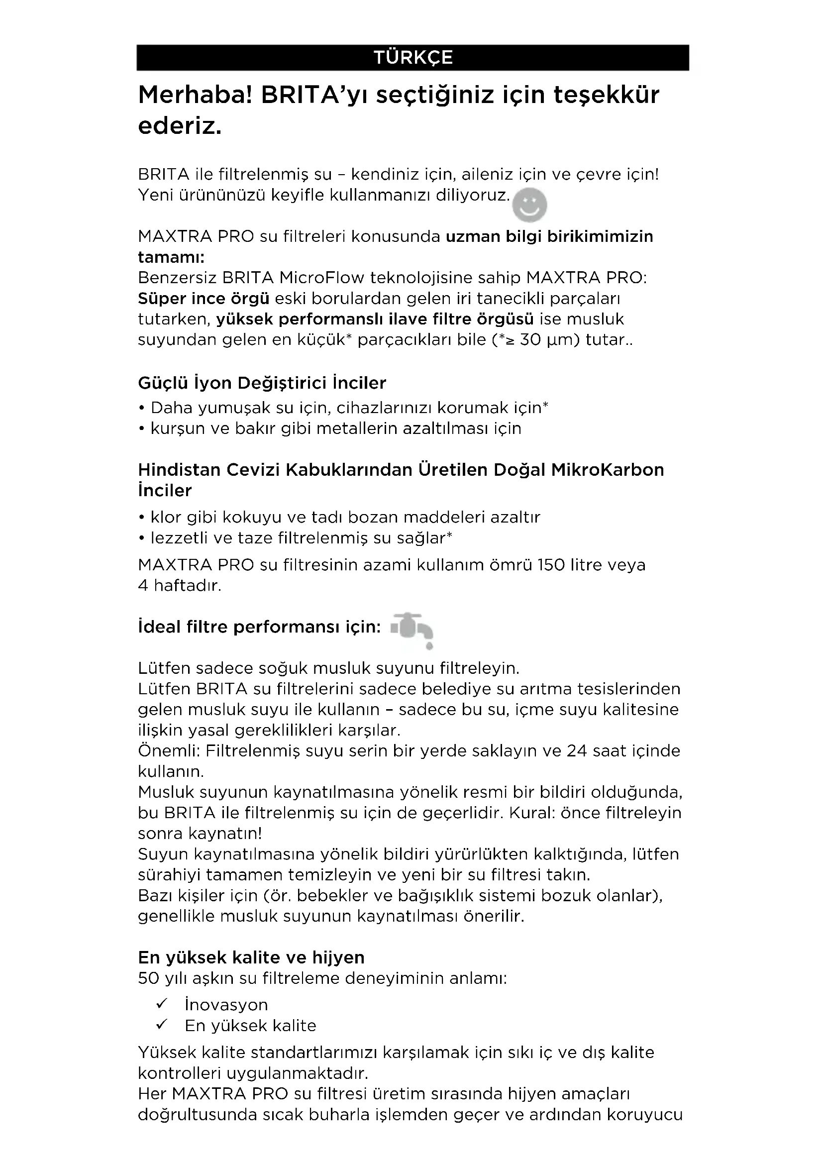 - lezzetli ve taze filtrelenmiş su sağlar* MAXTRA PRO su filtresinin azami kullanım ömrü 150 litre veya 4 haftadır. İdeal filtre performansı için: Lütfen sadece soğuk musluk suyunu filtreleyin. Lütfen BRITA su filtrelerini sadece belediye su arıtma tesislerinden gelen musluk suyu ile kullanın – sadece bu su, içme suyu kalitesine ilişkin yasal gereklilikleri karşılar. Önemli: Filtrelenmiş suyu serin bir yerde saklayın ve 24 saat içinde kullanın. Musluk suyunun kaynatılmasına yönelik resmi bir bildiri olduğunda, bu BRITA ile filtrelenmiş su için de geçerlidir. Kural: önce filtreleyin sonra kaynatın! Suyun kaynatılmasına yönelik bildiri yürürlükten kalktığında, lütfen sürahiyi tamamen temizleyin ve yeni bir su filtresi takın. Bazı kişiler için (ör. bebekler ve bağışıklık sistemi bozuk olanlar), genellikle musluk suyunun kaynatılması önerilir. En yüksek kalite ve hijyen 50 yılı aşkın su filtreleme deneyiminin anlamı: 9 İnovasyon 9 En yüksek kalite Yüksek kalite standartlarımızı karşılamak için sıkı iç ve dış kalite kontrolleri uygulanmaktadır. Her MAXTRA PRO su filtresi üretim sırasında hijyen amaçları doğrultusunda sıcak buharla işlemden geçer ve ardından koruyucubir folyo ile paketlenir. (Not: su filtresi, buhar işleminden sonra yoğuşma nedeniyle nemli olabilir). MAXTRA PRO su filtresinin filtre malzemesi, hijyenik sebeplerle gümüşle özel bir işleme tabi tutulur. Suya az miktarda gümüş salınabilir. Bu, Dünya Sağlık Örgütü (DSÖ) önerileri ile uyumludur. BRITA, su filtresinin düzenli olarak değiştirilmesini önerir. Lütfen önerilen temizlik prosedürlerini ve filtrenin hazırlanmasına ilişkin tavsiyeyi izleyin (bölüm 1 – 7). Sürahi düzenli olarak temizlenmelidir. Not: Sürahi bir süre kullanılmayacaksa, su filtresini çıkarın, sürahiyi boşaltın ve su filtresini boş huniye gevşek bir şekilde yerleştirin. Lütfen bölüm 7 “MAXTRA PRO su filtresini değiştirme” kapsamına bakın. Çalıştırma – çok kolay