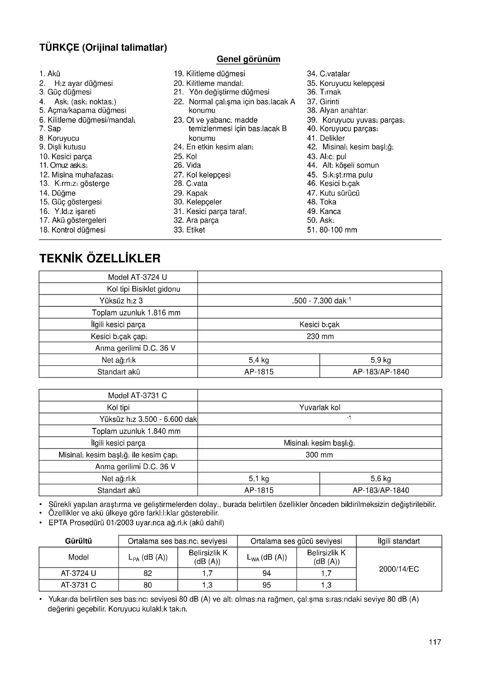 Toplam uzunluk 1.840 mm İlgili kesici parça Misinalı kesim başlığı Misinalı kesim başlığı ile kesim çapı 300 mm Anma gerilimi D.C. 36 V Net ağırlık 5,1 kg 5,6 kg Standart akü AP-1815 AP-183/AP-1840 Gürültü Ortalama ses basıncı seviyesi Ortalama ses gücü seviyesi İlgili standart Model L