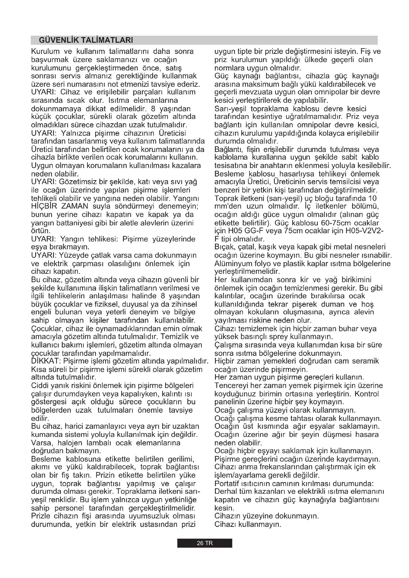 814 g/h 220-240V 50/60Hz -26 TR UYARI: Yalnızca pişirme cihazının Üreticisi tarafından tasarlanmış veya kullanım talimatlarında Üretici tarafından belirtilen ocak korumalarını ya da cihazla birlikte verilen ocak korumalarını kullanın. Uygun olmayan korumaların kullanılması kazalara neden olabilir. UYARI: Gözetimsiz bir şekilde, katı veya sıvı yağ ile ocağın üzerinde yapılan pişirme işlemleri tehlikeli olabilir ve yangına neden olabilir. Yangını HİÇBİR ZAMAN suyla söndürmeyi denemeyin; bunun yerine cihazı kapatın ve kapak ya da yangın battaniyesi gibi bir aletle alevlerin üzerini örtün. UYARI: Yangın tehlikesi: Pişirme yüzeylerinde eşya bırakmayın. UYARI: Yüzeyde çatlak varsa cama dokunmayın ve elektrik çarpması olasılığını önlemek için cihazı kapatın. DİKKAT: Pişirme işlemi gözetim altında yapılmalıdır. Kısa süreli bir pişirme işlemi sürekli olarak gözetim altında tutulmalıdır. Kurulum ve kullanım talimatlarını daha sonra başvurmak üzere saklamanızı ve ocağın kurulumunu gerçekleştirmeden önce, satış sonrası servis almanız gerektiğinde kullanmak üzere seri numarasını not etmenizi tavsiye ederiz. UYARI: Cihaz ve erişilebilir parçaları kullanım sırasında sıcak olur. Isıtma elemanlarına dokunmamaya dikkat edilmelidir. 8 yaşından küçük çocuklar, sürekli olarak gözetim altında olmadıkları sürece cihazdan uzak tutulmalıdır. Ciddi yanık riskini önlemek için pişirme bölgeleri çalışır durumdayken veya kapalıyken, kalıntı ısı göstergesi açık olduğu sürece çocukların bu bölgelerden uzak tutulmaları önemle tavsiye edilir. Bu cihaz, harici zamanlayıcı veya ayrı bir uzaktan kumanda sistemi yoluyla kullanılmak için değildir. Besleme kablosuna etikette belirtilen gerilimi, akımı ve yükü kaldırabilecek, toprak bağlantısı olan bir fiş takın. Prizin etikette belirtilen yüke uygun, toprak bağlantısı yapılmış ve çalışır durumda olması gerekir. Topraklama iletkeni sarı- yeşil renklidir. Bu işlem yalnızca uygun yetkinliğe sahip personel tarafından gerçekleştirilmelidir. Prizle cihazın fişi arasında uyumsuzluk olması durumunda, yetkin bir elektrik ustasından prizi Bu cihaz, gözetim altında veya cihazın güvenli bir şekilde kullanımına ilişkin talimatların verilmesi ve ilgili tehlikelerin anlaşılması halinde 8 yaşından büyük çocuklar ve fiziksel, duyusal ya da zihinsel engeli bulunan veya yeterli deneyim ve bilgiye sahip olmayan kişiler tarafından kullanılabilir. Çocuklar, cihaz ile oynamadıklarından emin olmak amacıyla gözetim altında tutulmalıdır. Temizlik ve kullanıcı bakımı işlemleri, gözetim altında olmayan çocuklar tarafından yapılmamalıdır. Varsa, halojen lambalı ocak elemanlarına doğrudan bakmayın.