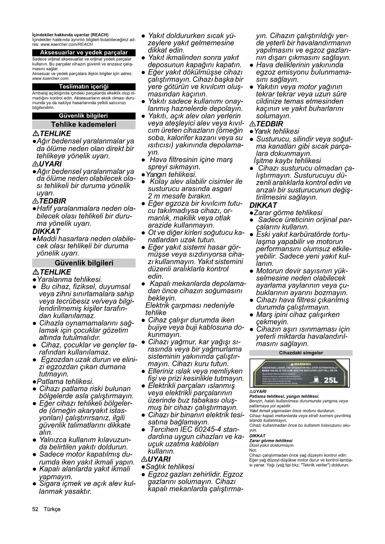 - AB Uygunluk Beyanı Türkçe İçindekiler hakkında uyarılar (REACH) İçindekiler hakkında ayrıntılı bilgileri bulabileceğiniz ad- res: www.kaercher.com/REACH Aksesuarlar ve yedek parçalar Sadece orijinal aksesuarlar ve orijinal yedek parçalar kullanın. Bu parçalar cihazın güvenli ve arızasız çalış- masını sağlar. Aksesuar ve yedek parçalara ilişkin bilgiler için adres: www.kaercher.com. Teslimatın içeriği Ambalaj açıldığında içindeki parçalarda eksiklik olup ol- madığını kontrol edin. Aksesuarların eksik olması duru- munda ya da nakliye hasarlarında yetkili satıcınızı bilgilendirin. Güvenlik bilgileri Tehlike kademeleri TEHLIKE ●Ağır bedensel yaralanmalar ya da ölüme neden olan direkt bir tehlikeye yönelik uyarı. 몇 UYARI ●Ağır bedensel yaralanmalar ya da ölüme neden olabilecek ola- sı tehlikeli bir duruma yönelik uyarı. 몇 TEDBIR ●Hafif yaralanmalara neden ola- bilecek olası tehlikeli bir duru- ma yönelik uyarı. DIKKAT ●Maddi hasarlara neden olabile- cek olası tehlikeli bir duruma yönelik uyarı. Güvenlik bilgileri TEHLIKE ●Yaralanma tehlikesi. ● Bu cihaz, fiziksel, duyumsal veya zihni sınırlamalara sahip veya tecrübesiz ve/veya bilgi- lendirilmemiş kişiler tarafın- dan kullanılamaz. ● Cihazla oynamamalarını sağ- lamak için çocuklar gözetim altında tutulmalıdır. ● Cihaz, çocuklar ve gençler ta- rafından kullanılamaz. ● Egzozdan uzak durun ve elini- zi egzozdan çıkan dumana tutmayın. ●Patlama tehlikesi. ● Cihazı patlama riski bulunan bölgelerde asla çalıştırmayın. ● Eğer cihazı tehlikeli bölgeler- de (örneğin akaryakıt istas- yonları) çalıştırırsanız, ilgili güvenlik talimatlarını dikkate alın. ● Yalnızca kullanım kılavuzun- da belirtilen yakıtı doldurun. ● Sadece motor kapatılmış du- rumda iken yakıt ikmali yapın. ● Kapalı alanlarda yakıt ikmali yapmayın. ● Sigara içmek ve açık alev kul- lanmak yasaktır. ● Yakıt doldururken sıcak yü- zeylere yakıt gelmemesine dikkat edin. ● Yakıt ikmalinden sonra yakıt deposunun kapağını kapatın. ● Eğer yakıt dökülmüşse cihazı çalıştırmayın. Cihazı başka bir yere götürün ve kıvılcım oluş- masından kaçının. ● Yakıtı sadece kullanımı onay- lanmış haznelerde depolayın. ● Yakıtı, açık alev olan yerlerin veya ateşleyici alev veya kıvıl- cım üreten cihazların (örneğin soba, kalorifer kazanı veya su ısıtıcısı) yakınında depolama- yın. ● Hava filtresinin içine marş spreyi sıkmayın. ●Yangın tehlikesi. ● Kolay alev alabilir cisimler ile susturucu arasında asgari 2 m mesafe bırakın. ● Eğer egzoza bir kıvılcım tutu- cu takılmadıysa cihazı, or- manlık, makilik veya otlak arazide kullanmayın. ● Ot ve diğer kirleri soğutucu ka- natlardan uzak tutun. ● Eğer yakıt sistemi hasar gör- müşse veya sızdırıyorsa ciha- zı kullanmayın. Yakıt sistemini düzenli aralıklarla kontrol edin. ● Kapalı mekanlarda depolama- dan önce cihazın soğumasını bekleyin. Elektrik çarpması nedeniyle tehlike ● Cihaz çalışır durumda iken bujiye veya buji kablosuna do- kunmayın. ● Cihazı yağmur, kar yağışı sı- rasında veya bir yağmurlama sisteminin yakınında çalıştır- mayın. Cihazı kuru tutun. ● Elleriniz ıslak veya nemliyken fişi ve prizi kesinlikle tutmayın. ● Elektrikli parçaları ıslanmış veya elektrikli parçalarının üzerinde buz tabakası oluş- muş bir cihazı çalıştırmayın. ● Cihazı bir binanın elektrik tesi- satına bağlamayın. ● Tercihen IEC 60245-4 stan- dardına uygun cihazları ve ka- uçuk uzatma kabloları kullanın. 몇 UYARI ●Sağlık tehlikesi ● Egzoz gazları zehirlidir. Egzoz gazlarını solumayın. Cihazı kapalı mekanlarda çalıştırma- yın. Cihazın çalıştırıldığı yer- de yeterli bir havalandırmanın yapılmasını ve egzoz gazları- nın dışarı çıkmasını sağlayın. ● Hava deliklerinin yakınında egzoz emisyonu bulunmama- sını sağlayın. ● Yakıtın veya motor yağının tekrar tekrar veya uzun süre cildinize temas etmesinden kaçının ve yakıt buharlarını solumayın. 몇 TEDBIR ●Yanık tehlikesi ● Susturucu, silindir veya soğut- ma kanatları gibi sıcak parça- lara dokunmayın. İşitme kaybı tehlikesi ● Cihazı susturucu olmadan ça- lıştırmayın. Susturucuyu dü- zenli aralıklarla kontrol edin ve arızalı bir susturucunun değiş- tirilmesini sağlayın. DIKKAT ●Zarar görme tehlikesi ● Sadece üreticinin orijinal par- çalarını kullanın. ● Eski yakıt karbüratörde tortu- laşma yapabilir ve motorun performansını olumsuz etkile- yebilir. Sadece yeni yakıt kul- lanın. ● Motorun devir sayısının yük- selmesine neden olabilecek ayarlama yaylarının veya çu- buklarının ayarını bozmayın. ● Cihazı hava filtresi çıkarılmış durumda çalıştırmayın. ● Marş ipini cihaz çalışırken çekmeyin. ● Cihazın aşırı ısınmaması için yeterli miktarda havalandırıl- masını sağlayın. Cihazdaki simgeler 몇 UYARI Patlama tehlikesi, yangın tehlikesi. Benzin, hatalı kullanılması durumunda yangına veya patlamaya yol açabilir. Yakıt ikmali yapmadan önce motoru durdurun. Cihazı kapalı mekanlarda veya etrafı kısmen çevrilmiş alanda kullanmayın. Cihazı kullanmadan önce bu kullanım kılavuzunu oku- yun. DIKKAT Zarar görme tehlikesi Dizel yakıt doldurmayın. Not: Cihazı çalıştırmadan önce yağ düzeyini kontrol edin. Eğer yağ düzeyi düşükse motor durur ve kontrol lamba- sı yanar. Yağı (yağ tipi bkz. "Teknik veriler") doldurun.Türkçe 53 몇 UYARI Patlama tehlikesi, yangın tehlikesi. Yakıt ikmali yapmadan önce motoru durdurun. Dökülen yakıtı cihazı çalıştırmadan önce temizleyin. Eğer yakıt sisteminde kaçak varsa cihazı çalıştırmayın. 몇TEDBIR Sıcak yüzeyler Cihazın egzozu işletim sırasında aş