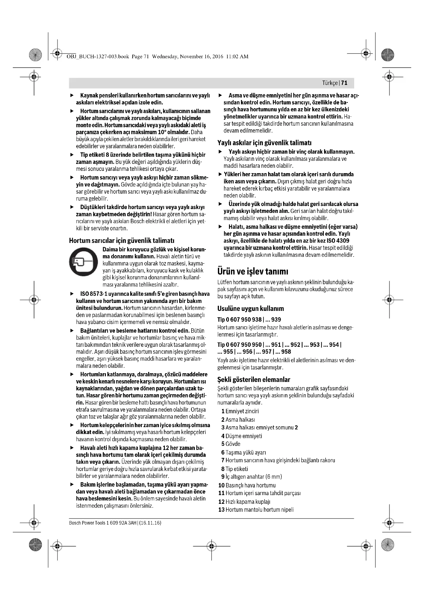 - Yaylı askı işletime hazır elektrikli el aletlerinin asılması ve den- gelenmesi için tasarlanmıştır. Şekli gösterilen elemanlar Şekli gösterilen bileşenlerin numaraları grafik sayfasındaki hortum sarıcı veya yaylı askının şeklinin bulunduğu sayfadaki numaralarla aynıdır. 1 Emniyet zinciri 2 Asma halkası 3 Asma halkası emniyet somunu 2 4 Düşme emniyeti 5 Gövde 6 Taşıma yükü ayarı 7 Hortum sarıcının hava girişindeki bağlantı rakoru 8 Tip etiketi 9 İç altıgen anahtar (6 mm) 10 Basınçlı hava hortumu 11 Hortum içeri sarma tahdit parçası 12 Hızlı kapama kuplajı 13 Hortum mantolu hortum nipeli OBJ_BUCH-1327-003.book Page 71 Wednesday, November 16, 2016 11:02 AM72 | Türkçe 1 609 92A 3AH | (16.11.16) Bosch Power Tools 14 Hortum nipeli 15 Hortum kelepçesi 16 Besleme hortumu 17 Kuplaj nipeli (Hortum mantolu hortum nipeli) 18 Hortum kuplajı (Dış dişli kuplaj parçası) 19 Bakım ünitesindeki hava çıkışı 20 Dişli kuplaj nipeli 21 Hava girişindeki bağlantı rakoru 22 Havalı aletin teslimat kapsamındaki hortum nipeli 23 Hortum kelepçeli hortum ara parçası 24 Taşıma yükü ayarı el çarkı 25 Halat 26 Esnek halat içeri sarma tahdit parçası 27 Yük kancası 28 İç altıgen anahtar (4 mm) 29 Taşıma yükü ayar vidası 30 Halatın boş ucunu emniyete alan pres kıskacı 31 Halat uzunluğu ayar kilidi 32 Halat içeri sarma tahdit parçası için halat kıskacı Şekli gösterilen veya tanımlanan aksesuar standart teslimat kap- samında değildir. Teknik veriler Montaj Hortum sarıcının veya yaylı askının asma halkası 2 veya düşme emniyetinin 4 takıldığı donanım emniyet faktö- rü 5 ile donatılmış olmalıdır. Hortum sarıcı veya yaylı askı ile güvenli biçimde çalışabilmek için, hortum sarıcı veya yaylı askının kendi ağırlığına (Bakınız: “Teknik veriler”) maksimum taşıma yükünü (tespit edilen alet) ekleyiniz ve elde ettiğiniz toplamı 5 ile çarpınız. Düşma halinde hortum sarıcıyı ve yaylı askıyı hemen değiştiriniz! Hasar gören hortum sarıcıyı ve yaylı askıyı Bosch elektrikli el aletleri için yetkili bir servise onarıma gönderin. Hortum sarıcı (geri alıcı) Ürün kodu 0 607 950 Taşıma yükü alanı p. 938