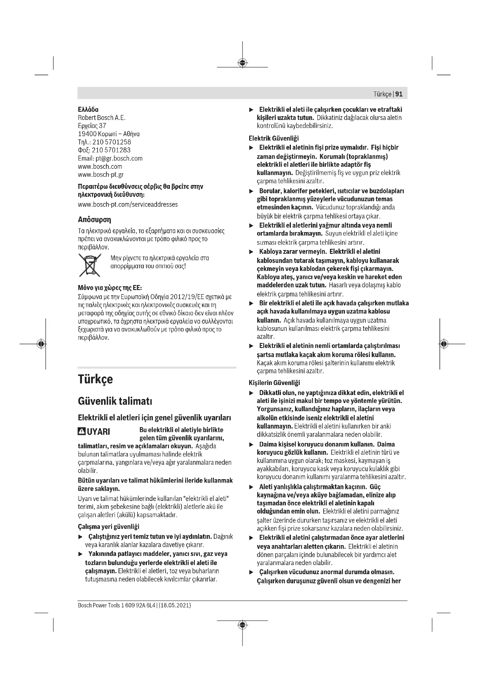 Τα ηλεκτρικά εργαλεία, τα εξαρτήματα και οι συσκευασίες πρέπει να ανακυκλώνονται με τρόπο φιλικό προς το περιβάλλον. Μην ρίχνετε τα ηλεκτρικά εργαλεία στα απορρίμματα του σπιτιού σας! Μόνο για χώρες τηςΕΕ: Σύμφωνα με την Ευρωπαϊκή Οδηγία 2012/19/ΕΕ σχετικά με τις παλιές ηλεκτρικές και ηλεκτρονικές συσκευές και τη μεταφορά της οδηγίας αυτής σε εθνικό δίκαιο δεν είναι πλέον υποχρεωτικό, τα άχρηστα ηλεκτρικά εργαλεία να συλλέγονται ξεχωριστά για να ανακυκλωθούν με τρόπο φιλικό προς το περιβάλλον. Türkçe Güvenlik talimatı Elektrikli el aletleri için genel güvenlik uyarıları UYARI Bu elektrikli el aletiyle birlikte gelen tüm güvenlik uyarılarını, talimatları, resim ve açıklamaları okuyun. Aşağıda bulunan talimatlara uyulmaması halinde elektrik çarpmalarına, yangınlara ve/veya ağır yaralanmalara neden olabilir. Bütün uyarıları ve talimat hükümlerini ileride kullanmak üzere saklayın. Uyarı ve talimat hükümlerinde kullanılan "elektrikli el aleti" terimi, akım şebekesine bağlı (elektrikli) aletlerle akü ile çalışan aletleri (akülü) kapsamaktadır. Çalışma yeri güvenliği u Çalıştığınız yeri temiz tutun ve iyi aydınlatın. Dağınık veya karanlık alanlar kazalara davetiye çıkarır. u Yakınında patlayıcı maddeler, yanıcı sıvı, gaz veya tozların bulunduğu yerlerde elektrikli el aleti ile çalışmayın. Elektrikli el aletleri, toz veya buharların tutuşmasına neden olabilecek kıvılcımlar çıkarırlar. u Elektrikli el aleti ile çalışırken çocukları ve etraftaki kişileri uzakta tutun. Dikkatiniz dağılacak olursa aletin kontrolünü kaybedebilirsiniz. Elektrik Güvenliği u Elektrikli el aletinin fişi prize uymalıdır. Fişi hiçbir zaman değiştirmeyin. Korumalı (topraklanmış) elektrikli el aletleri ile birlikte adaptör fiş kullanmayın. Değiştirilmemiş fiş ve uygun priz elektrik çarpma tehlikesini azaltır. u Borular, kalorifer petekleri, ısıtıcılar ve buzdolapları gibi topraklanmış yüzeylerle vücudunuzun temas etmesinden kaçının. Vücudunuz topraklandığı anda büyük bir elektrik çarpma tehlikesi ortaya çıkar. u Elektrikli el aletlerini yağmur altında veya nemli ortamlarda bırakmayın. Suyun elektrikli el aleti içine sızması elektrik çarpma tehlikesini artırır. u Kabloya zarar vermeyin. Elektrikli el aletini kablosundan tutarak taşımayın, kabloyu kullanarak çekmeyin veya kablodan çekerek fişi çıkarmayın. Kabloyu ateş, yanıcı ve/veya keskin ve hareket eden maddelerden uzak tutun. Hasarlı veya dolaşmış kablo elektrik çarpma tehlikesini artırır. u Bir elektrikli el aleti ile açık havada çalışırken mutlaka açık havada kullanılmaya uygun uzatma kablosu kullanın. Açık havada kullanılmaya uygun uzatma kablosunun kullanılması elektrik çarpma tehlikesini azaltır. u Elektrikli el aletinin nemli ortamlarda çalıştırılması şartsa mutlaka kaçak akım koruma rölesi kullanın. Kaçak akım koruma rölesi şalterinin kullanımı elektrik çarpma tehlikesini azaltır. Kişilerin Güvenliği u Dikkatli olun, ne yaptığınıza dikkat edin, elektrikli el aleti ile işinizi makul bir tempo ve yöntemle yürütün. Yorgunsanız, kullandığınız hapların, ilaçların veya alkolün etkisinde iseniz elektrikli el aletini kullanmayın. Elektrikli el aletini kullanırken bir anki dikkatsizlik önemli yaralanmalara neden olabilir. u Daima kişisel koruyucu donanım kullanın. Daima koruyucu gözlük kullanın. Elektrikli el aletinin türü ve kullanımına uygun olarak; toz maskesi, kaymayan iş ayakkabıları, koruyucu kask veya koruyucu kulaklık gibi koruyucu donanım kullanımı yaralanma tehlikesini azaltır. u Aleti yanlışlıkla çalıştırmaktan kaçının. Güç kaynağına ve/veya aküye bağlamadan, elinize alıp taşımadan önce elektrikli el aletinin kapalı olduğundan emin olun. Elektrikli el aletini parmağınız şalter üzerinde dururken taşırsanız ve elektrikli el aleti açıkken fişi prize sokarsanız kazalara neden olabilirsiniz. u Elektrikli el aletini çalıştırmadan önce ayar aletlerini veya anahtarları aletten çıkarın. Elektrikli el aletinin dönen parçaları içinde bulunabilecek bir yardımcı alet yaralanmalara neden olabilir. u Çalışırken vücudunuz anormal durumda olmasın. Çalışırken duruşunuz güvenli olsun ve dengenizi her Bosch Power Tools 1 609 92A 6L4 | (18.05.2021)92 | Türkçe zaman koruyun. Bu sayede elektrikli el aletini beklenmedik durumlarda daha iyi kontrol edebilirsiniz. u Uygun iş elbiseleri giyin. Geniş giysiler giymeyin ve takı takmayın. Saçlarınızı ve giysileriniz aletin hareketli parçalarından uzak tutun. Bol giysiler, uzun saçlar veya takılar aletin hareketli parçaları tarafından tutulabilir. u Toz emme donanımı veya toz tutma tertibatı kullanırken, bunların bağlı olduğundan ve doğru kullanıldığından emin olun. Toz emme donanımının kullanımı tozdan kaynalanabilecek tehlikeleri azaltır. u Aletleri sık kullanmanız sebebiyle onlara alışmış olmanız, güvenlik prensiplerine uymanızı önlememelidir. Dikkatsiz bir hareket, bir anda ciddi yaralanmalara yol açabilir. Elektrikli el aletlerinin kullanımı ve bakımı u Elektrikli el aletini aşırı ölçüde zorlamayın. Yaptığınız işe uygun elektrikli el aletleri kullanın. Uygun performanslı elektrikli el aleti ile, belirlenen çalışma alanında daha iyi ve güvenli çalışırsınız. u Şalteri bozuk olan elektrikli el aletini kullanmayın. Açılıp kapanamayan bir elektrikli el a