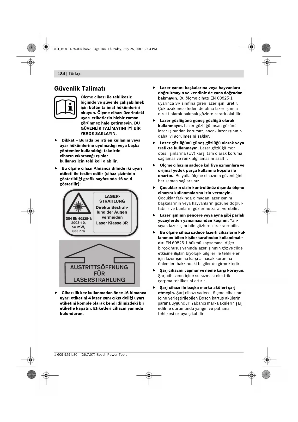 Güvenlik Talimat Ölçme cihaz ile tehlikesiz biçimde ve güvenle çalşabilmek için bütün talimat hükümlerini okuyun. Ölçme cihaz üzerindeki uyar etiketlerin hiçbir zaman görünmez hale getirmeyin. BU GÜVENLİK TALİMATINI İYİ BİR YERDE SAKLAYIN. f Dikkat – Burada belirtilen kullanm veya ayar hükümlerine uyulmadğ veya başka yöntemler kullanldğ takdirde cihazn çkaracağ şnlar kullanc için tehlikeli olabilir. f Bu ölçme cihaz Almanca dilinde iki uyar etiketi ile teslim edilir (cihaz çiziminin gösterildiği grafik sayfasnda 16 ve 4 gösterilir): f Cihaz ilk kez kullanmadan önce 16 Almanca uyar etiketini 4 lazer şn çkş deliği uyar etiketini komple olarak kendi dilinizdeki bir etiketle kapatn. Etiketleri cihazn yannda bulundurun. f Lazer şnn başkalarna veya hayvanlara doğrultmayn ve kendiniz de şna doğrudan bakmayn. Bu ölçme cihaz EN 60825-1 uyarnca 3R snfna giren lazer şn üretir. Çok uzak mesafeden de olma lazer şnna direkt olarak bakmak gözlere zararl olabilir. f Lazer gözlüğünü güneş gözlüğü olarak kullanmayn. Lazer gözlüğü insan gözünü lazer şnndan korumaz, ancak lazer şnnn daha iyi görülmesini sağlar. f Lazer gözlüğünü güneş gözlüğü olarak veya trafikte kullanmayn. Lazer gözlüğü mor ötesi şnlarna (UV) karş tam olarak koruma sağlamaz ve renk alglamasn azaltr. f Ölçme cihazn sadece kalifiye uzmanlara ve orijinal yedek parça kullanma koşulu ile onartn. Bu yolla ölçme cihaznn güvenliğini her zaman sağlarsnz. f Çocuklarn sizin kontrolünüz dşnda ölçme cihazn kullanmalarna izin vermeyin. Çocuklar farknda olmadan lazer şnn başkalarnn veya hayvanlarn gözüne doğrul- tabilir ve bunlarn gözlerine zarar verebilir. f Lazer şnnn pencere veya ayna gibi parlak yüzeylerden yansmasndan kaçnn. Yan- syan lazer şn bile gözlere zarar verebilir. f Bu ölçme cihaz sadece lazerli cihazlarn kul- lanmn bilen kişiler tarafndan kullanlmal- dr. EN 60825-1 hükmü kapsamna, diğer birçok husus yannda lazer şnnn göz ve cilde etkisine ilişkin biyolojik bilgiler ile tehkileler için lazer şnna karş alnacak korunma önlemleri hakkndaki bilgiler de girmektedir. f Şarj cihazn yağmur ve neme karş koruyun. Şarj cihaznn içine su szmas elektrik çarpma tehlikesini artrr. f Şarj cihaz ile başka marka aküleri şarj etmeyin. Şarj cihaz sadece, ölçme cihaznn içine yerleştirilebilen Bosch kartuş akülerin şarjna uygundur. Yabanc marka akülerin şarj edilme durumunda yangn ve patlama tehlikesi ortaya çkabilir. DIN EN 60825-1:2003-10, <5 mW, 635 nm LASER- STRAHLUNG Direkte Bestrah- lung der Augen vermeiden Laser Klasse 3R AUSTRITTSÖFFNUNG FÜR LASERSTRAHLUNG OBJ_BUCH-78-004.book Page 184 Thursday, July 26, 2007 2:04 PMTürkçe | 185 Bosch Power Tools 1 609 929 L80 | (26.7.07) f Şarj cihazn temiz tutun. Kirlenme nedeniyle elektrik çarpma tehlikesi ortaya çkar. f Her kullanmdan önce şarj cihazn, kabloyu ve fişi kontrol edin. Hasar tespit ederseniz şarj cihazn kullanmayn. Şarj cihazn ken- diniz açmayn, sadece kalifiye elemanlara veya uzmanlara açtrn ve sadece orijinal ye- dek parçalar kullann. Hasarl şarj cihaz, kab- lo ve fişler elektrik çarpma tehlikesini artrr. f Şarj cihazn kolay tutuşan zeminlerde kul- lanmayn (örneğin kağt, tekstil malzemesi vb.). Şarj işlemi srasnda şarj cihaznda mey- dana gelen snma yangn tehlikesi doğurur. f Yanlş kullanm durumunda aküden sv dşa- r szabilir. Bu sv ile temasa gelmeyin. Yan- lşlkla temasa gelirseniz su ile iyice ykayn. Eğer sv gözlerinize gelecek olursa hemen bir hekime başvurun. Dşar szan akü svs cilt tahrişlerine ve yanmalara neden olabilir. Fonksiyon tanm Lütfen ölçme cihaznn bulunduğu kapağ açn ve kullanm klavuzunu okuduğunuz sürece bu kapağ açk tutun. Usulüne uygun kullanm Bu ölçme cihaz; kapal mekanlarda ve açk ha- vada hassas yataylklarn, yüksekliklerin, diklik- lerin ve hizalama çizgilerinin tespiti ve kontrolü için geliştirilmiştir. Şekli gösterilen elemanlar Şekli gösterilen cihaz elemanlarnn numaralar ölçme cihaznn şeklinin bulunduğu grafik sayfa- snda bulunmaktadr. 1 Su terazisi 2 Uzaktan kumanda için alglama merceği 3 Şarj fişi soketi 4 Lazer şn çkş deliği uyar etiketi 5 Lazer şn çkş deliği 6 Y-Ekseni işareti 7 X-Ekseni işareti 8 Dik şn 9 Değişken lazer şn 10 X-Ekseni diklik işareti 11 Y-Ekseni diklik işareti 12 Batarya gözü kapak kilidi 13 Batarya gözü kapağ 14 Lastik ayak 15 Kartuş akü 16 Lazer uyar etiketi 17 Sehpa girişi 5/8" (yatay ve dikey) 18 Seri numaras 19 Çizgisel işletim ve çizgi boyu seçme tuşu 20 Yön tuşu, yukar 21 Yön tuşu, sol 22 Rotasyonlu işletim ve rotasyon hz seçme tuşu 23 Yön tuşu, aşağ 24 Yön tuşu, sağ 25 Manuel nivelman göstergesi “man” 26 Otomatik nivelman göstergesi “auto” 27 Batarya şarj durumu göstergesi 28 Nivelman otomatiğini kapatmak için “man/auto” tuşu 29 Açma/kapama tuşu 30 Distomat-Ölçme latas* 31 Lazer gözlüğü 32 Duvar mesnedi/Doğrultma ünitesi* 33 Duvar mesnedinde 5/8"-Vida* 34 Doğrultma ünitesi vidalar* 35 Ayakl ölçme latas 36 Tavan ölçme latas* 37 Eğim kamas* 38 Tutuculu yüksek performansl alglayc 39 Uzaktan kumanda 40 Sehpa* 41 Şarj fişi 42 Şarj cihaz 43 Çanta *Şekli gösterilen veya tanmlanan aksesuar standart teslimat kapsamnda değildir. OBJ_BUCH-78-004.book Page 185 Thursday, July 26, 2007 2:04 PM186 | Türkçe 1 609 929 L80 | (26.7.07) Bosch Power Tools Teknik veriler Distomat BL 200 GC Professional Ürün kodu 3 601 K15 000 Çalşma alan (Yarçap)