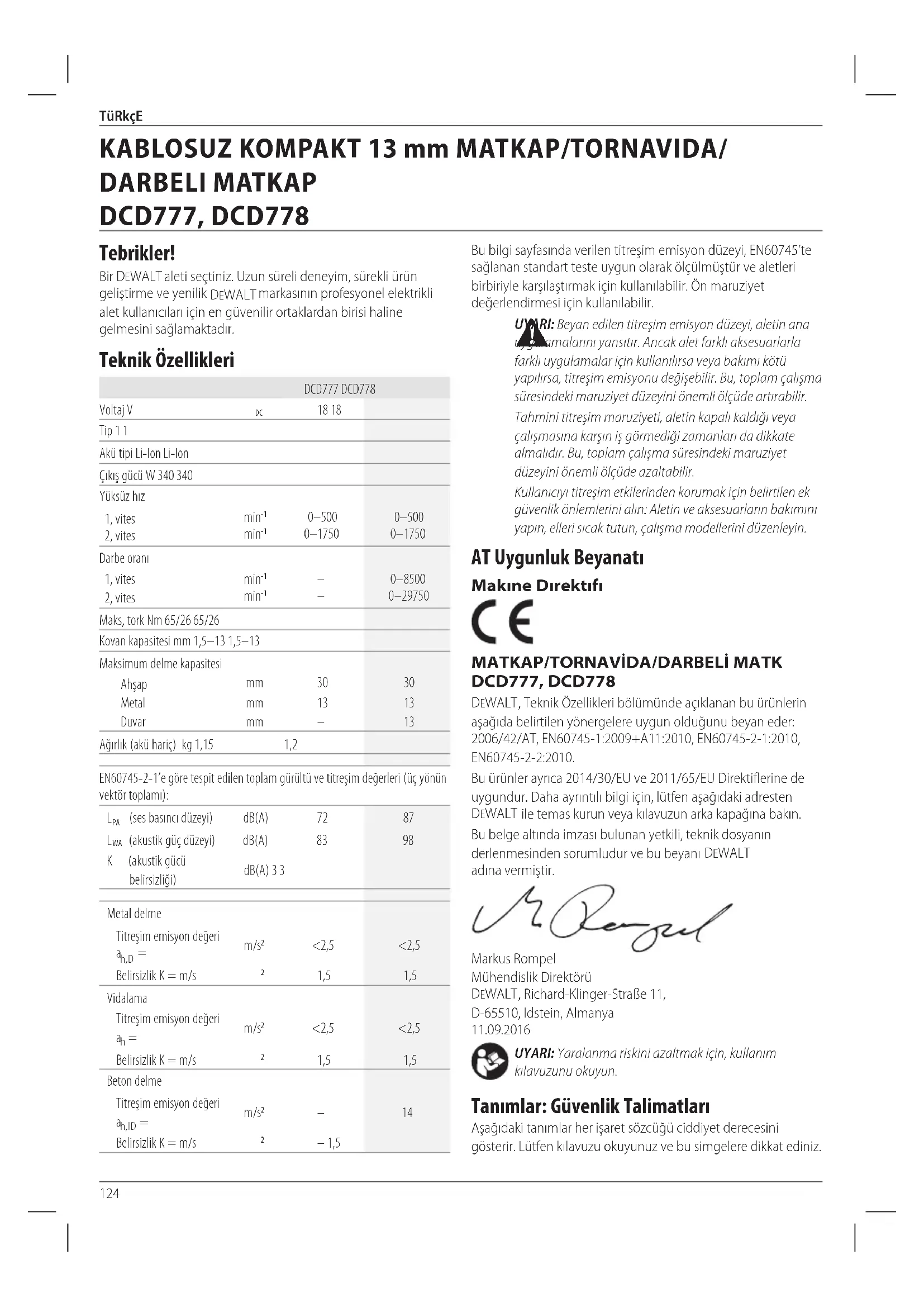 DCD777, DCD778 DeWALT , Teknik Özellikleri bölümünde açıklanan bu ürünlerin aşağıda belirtilen yönergelere uygun olduğunu beyan eder: 2006/42/AT, eN60745-1:2009+A11:2010, EN60745-2-1:2010, EN60745-2-2:2010. Bu ürünler ayrıca 2014/30/EU ve 2011/65/EU Direktiflerine de uygundur. Daha ayrıntılı bilgi için, lütfen aşağıdaki adresten DeWALT ile temas kurun veya kılavuzun arka kapağınabakın. Bu belge altında imzası bulunan yetkili, teknik dosyanın derlenmesinden sorumludur ve bu beyanı DeWALT
