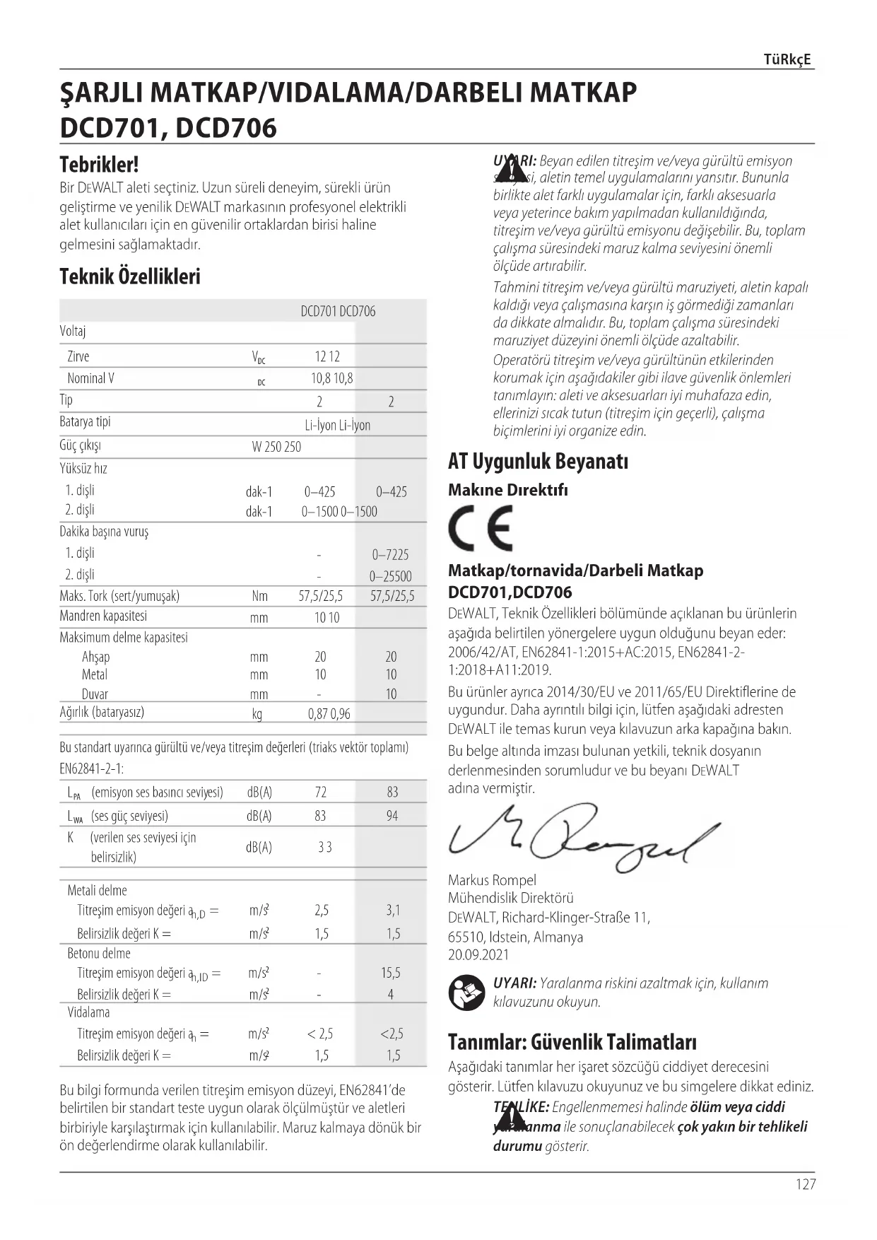 TEHLİKE: Engellenmemesi halinde ölüm veya ciddi yaralanma ile sonuçlanabilecek çok yakın bir tehlikeli durumugösterir. AT Uygunluk Beyanatı Makıne Dırektıfı Matkap/tornavida/Darbeli Matkap DCD701, DCD706 DeWALT, Teknik Özellikleri bölümünde açıklanan bu ürünlerin aşağıda belirtilen yönergelere uygun olduğunu beyan eder: 2006/42/AT, eN62841-1:2015+AC:2015, eN62841-2-1:2018+A11:2019.Bu ürünler ayrıca 2014/30/EU ve 2011/65/EU Direktiflerine de uygundur. Daha ayrıntılı bilgi için, lütfen aşağıdaki adresten DeWALT ile temas kurun veya kılavuzun arka kapağınabakın.Bu belge altında imzası bulunan yetkili, teknik dosyanın derlenmesinden sorumludur ve bu beyanı DeWALT adınavermiştir.Markus Rompel Mühendislik Direktörü DeWALT, Richard-Klinger-Straße 11, 65510, Idstein, Almanya 20.09.2021 UYARI: Beyan edilen titreşim ve/veya gürültü emisyon seviyesi, aletin temel uygulamalarını yansıtır. Bununla birlikte alet farklı uygulamalar için, farklı aksesuarla veya yeterince bakım yapılmadan kullanıldığında, titreşim ve/veya gürültü emisyonu değişebilir. Bu, toplam çalışma süresindeki maruz kalma seviyesini önemli ölçüdeartırabilir.Tahmini titreşim ve/veya gürültü maruziyeti, aletin kapalı kaldığı veya çalışmasına karşın iş görmediği zamanları da dikkate almalıdır. Bu, toplam çalışma süresindeki maruziyet düzeyini önemli ölçüdeazaltabilir.Operatörü titreşim ve/veya gürültünün etkilerinden korumak için aşağıdakiler gibi ilave güvenlik önlemleri tanımlayın: aleti ve aksesuarları iyi muhafaza edin, ellerinizi sıcak tutun (titreşim için geçerli), çalışma biçimlerini iyi organizeedin.Bu bilgi formunda verilen titreşim emisyon düzeyi, EN62841’de