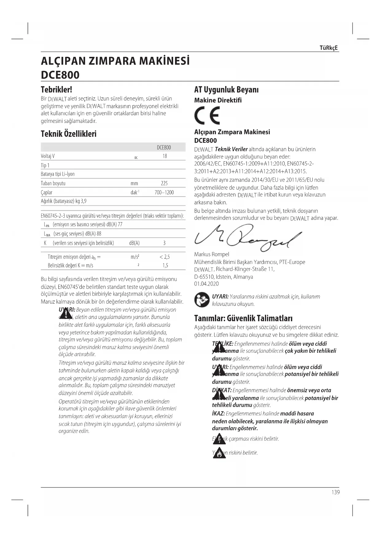Yangın riskinibelirtir. AT Uygunluk Beyanı Makine Direktifi Alçıpan Zımpara Makinesi DCE800 DeWALT Teknik Veriler altında açıklanan bu ürünlerin aşağıdakilere uygun olduğunu beyan eder: 2006/42/EC, EN60745-1:2009+A11:2010, EN60745-2- 3:2011+A2:2013+A11:2014+A12:2014+A13:2015. Bu ürünler aynı zamanda 2014/30/EU ve 2011/65/EU nolu yönetmeliklere de uygundur. Daha fazla bilgi için lütfen aşağıdaki adresten DeWALT ile irtibat kurun veya kılavuzun arkasınabakın. Bu belge altında imzası bulunan yetkili, teknik dosyanın derlenmesinden sorumludur ve bu beyanı DeWALT adınayapar. Markus Rompel Mühendislik Birimi Başkan Yardımcısı, PTE-Europe DeWALT , Richard-Klinger-Straße 11, D-65510, Idstein, Almanya