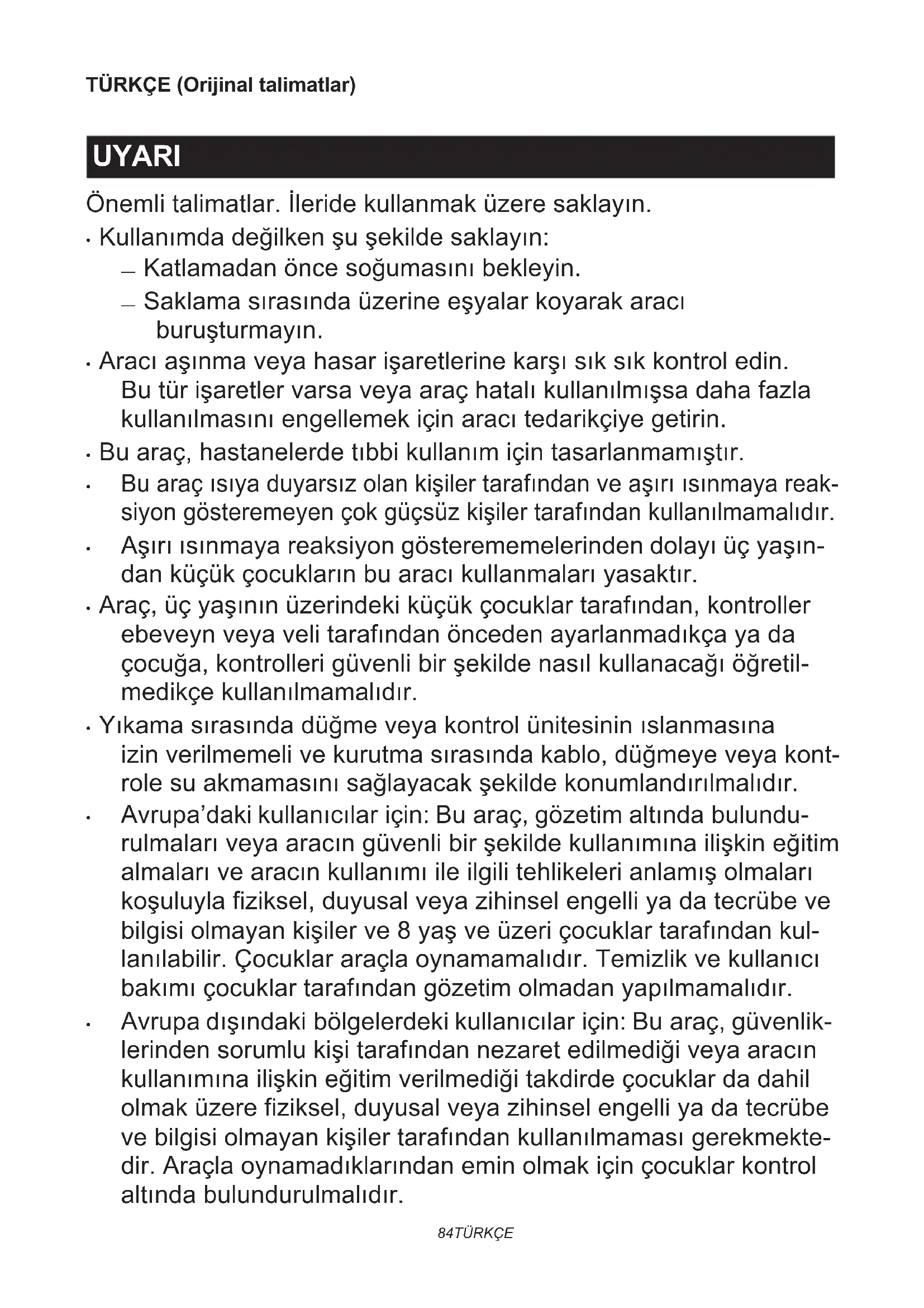 - Çocuklar, engelli kişiler veya örneğin kan dolaşımı zayıf olanlar gibi ısıya duyarsız kişiler bu aracı kullanmaktan kaçınmalıdır.87 TÜRKÇE