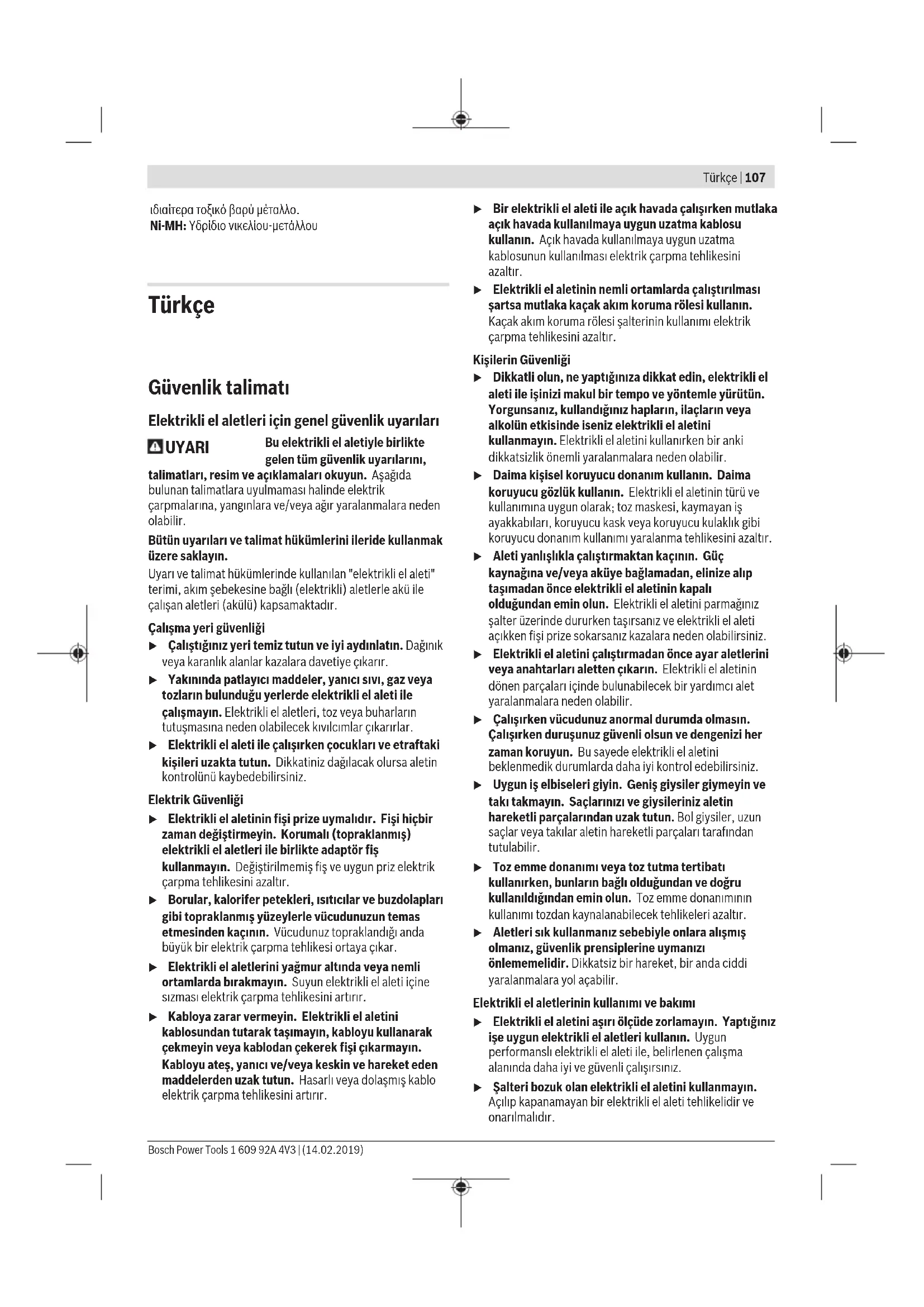 Τα ηλεκτρικά εργαλεία, οι μπαταρίες, τα εξαρτήματα και οι συσκευασίες πρέπει να ανακυκλώνονται με τρόπο φιλικό προς το περιβάλλον. Μην ρίχνετε τα ηλεκτρικά εργαλεία και τις μπαταρίες στα απορρίμματα του σπιτιού σας! Μόνο για χώρες τηςΕΕ: Σύμφωνα με την Ευρωπαϊκή οδηγία 2012/19/ΕΕ τα άχρηστα ηλεκτρικά εργαλεία και σύμφωνα με την Ευρωπαϊκή οδηγία 2006/66/ΕΚ οι χαλασμένες ή χρησιμοποιημένες μπαταρίες πρέπει να συλλέγονται ξεχωριστά για να ανακυκλωθούν με τρόπο φιλικό προς το περιβάλλον. Μπαταρίες/Επαναφορτιζόμενες μπαταρίες: Ni-Cd: Νικελίου-καδμίου Προσοχή: Αυτές οι μπαταρίες περιέχουν κάδμιο, ένα 1 609 92A 4V3 | (14.02.2019) Bosch Power ToolsTürkçe | 107 ιδιαίτερα τοξικό βαρύ μέταλλο. Ni-MH: Υδρίδιο νικελίου-μετάλλου Türkçe Güvenlik talimatı Elektrikli el aletleri için genel güvenlik uyarıları UYARI Bu elektrikli el aletiyle birlikte gelen tüm güvenlik uyarılarını, talimatları, resim ve açıklamaları okuyun. Aşağıda bulunan talimatlara uyulmaması halinde elektrik çarpmalarına, yangınlara ve/veya ağır yaralanmalara neden olabilir. Bütün uyarıları ve talimat hükümlerini ileride kullanmak üzere saklayın. Uyarı ve talimat hükümlerinde kullanılan "elektrikli el aleti" terimi, akım şebekesine bağlı (elektrikli) aletlerle akü ile çalışan aletleri (akülü) kapsamaktadır. Çalışma yeri güvenliği u Çalıştığınız yeri temiz tutun ve iyi aydınlatın. Dağınık veya karanlık alanlar kazalara davetiye çıkarır. u Yakınında patlayıcı maddeler, yanıcı sıvı, gaz veya tozların bulunduğu yerlerde elektrikli el aleti ile çalışmayın. Elektrikli el aletleri, toz veya buharların tutuşmasına neden olabilecek kıvılcımlar çıkarırlar. u Elektrikli el aleti ile çalışırken çocukları ve etraftaki kişileri uzakta tutun. Dikkatiniz dağılacak olursa aletin kontrolünü kaybedebilirsiniz. Elektrik Güvenliği u Elektrikli el aletinin fişi prize uymalıdır. Fişi hiçbir zaman değiştirmeyin. Korumalı (topraklanmış) elektrikli el aletleri ile birlikte adaptör fiş kullanmayın. Değiştirilmemiş fiş ve uygun priz elektrik çarpma tehlikesini azaltır. u Borular, kalorifer petekleri, ısıtıcılar ve buzdolapları gibi topraklanmış yüzeylerle vücudunuzun temas etmesinden kaçının. Vücudunuz topraklandığı anda büyük bir elektrik çarpma tehlikesi ortaya çıkar. u Elektrikli el aletlerini yağmur altında veya nemli ortamlarda bırakmayın. Suyun elektrikli el aleti içine sızması elektrik çarpma tehlikesini artırır. u Kabloya zarar vermeyin. Elektrikli el aletini kablosundan tutarak taşımayın, kabloyu kullanarak çekmeyin veya kablodan çekerek fişi çıkarmayın. Kabloyu ateş, yanıcı ve/veya keskin ve hareket eden maddelerden uzak tutun. Hasarlı veya dolaşmış kablo elektrik çarpma tehlikesini artırır. u Bir elektrikli el aleti ile açık havada çalışırken mutlaka açık havada kullanılmaya uygun uzatma kablosu kullanın. Açık havada kullanılmaya uygun uzatma kablosunun kullanılması elektrik çarpma tehlikesini azaltır. u Elektrikli el aletinin nemli ortamlarda çalıştırılması şartsa mutlaka kaçak akım koruma rölesi kullanın. Kaçak akım koruma rölesi şalterinin kullanımı elektrik çarpma tehlikesini azaltır. Kişilerin Güvenliği u Dikkatli olun, ne yaptığınıza dikkat edin, elektrikli el aleti ile işinizi makul bir tempo ve yöntemle yürütün. Yorgunsanız, kullandığınız hapların, ilaçların veya alkolün etkisinde iseniz elektrikli el aletini kullanmayın. Elektrikli el aletini kullanırken bir anki dikkatsizlik önemli yaralanmalara neden olabilir. u Daima kişisel koruyucu donanım kullanın. Daima koruyucu gözlük kullanın. Elektrikli el aletinin türü ve kullanımına uygun olarak; toz maskesi, kaymayan iş ayakkabıları, koruyucu kask veya koruyucu kulaklık gibi koruyucu donanım kullanımı yaralanma tehlikesini azaltır. u Aleti yanlışlıkla çalıştırmaktan kaçının. Güç kaynağına ve/veya aküye bağlamadan, elinize alıp taşımadan önce elektrikli el aletinin kapalı olduğundan emin olun. Elektrikli el aletini parmağınız şalter üzerinde dururken taşırsanız ve elektrikli el aleti açıkken fişi prize sokarsanız kazalara neden olabilirsiniz. u Elektrikli el aletini çalıştırmadan önce ayar aletlerini veya anahtarları aletten çıkarın. Elektrikli el aletinin dönen parçaları içinde bulunabilecek bir yardımcı alet yaralanmalara neden olabilir. u Çalışırken vücudunuz anormal durumda olmasın. Çalışırken duruşunuz güvenli olsun ve dengenizi her zaman koruyun. Bu sayede elektrikli el aletini beklenmedik durumlarda daha iyi kontrol edebilirsiniz. u Uygun iş elbiseleri giyin. Geniş giysiler giymeyin ve takı takmayın. Saçlarınızı ve giysileriniz aletin hareketli parçalarından uzak tutun. Bol giysiler, uzun saçlar veya takılar aletin hareketli parçaları tarafından tutulabilir. u Toz emme donanımı veya toz tutma tertibatı kullanırken, bunların bağlı olduğundan ve doğru kullanıldığından emin olun. Toz emme donanımının kullanımı tozdan kaynalanabilecek tehlikeleri azaltır. u Aletleri sık kullanmanız sebebiyle onlara alışmış olmanız, güvenlik prensiplerine uymanızı önlememelidir. Dikkatsiz bir hareket, bir anda ciddi yaralanmalara yol açabilir. Elektrikli el aletlerinin kullanımı ve bakımı u Elektrikli el aletini aşırı ölçü