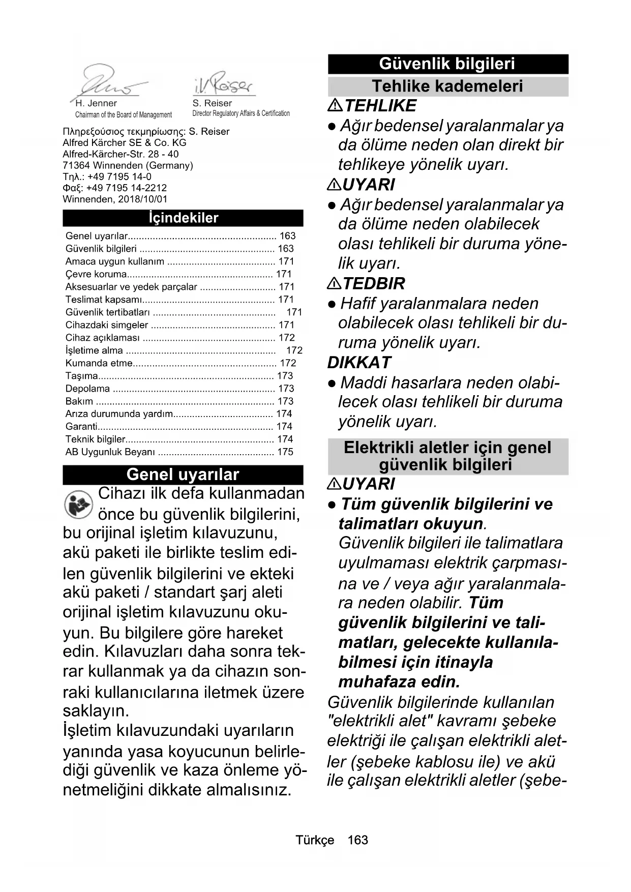 - Βάρος (χωρίς μπαταρίες) kg 4,3Türkçe 163 Πληρεξούσιος τεκμηρίωσης: S. Reiser Alfred Kärcher SE & Co. KG Alfred-Kärcher-Str. 28 - 40 71364 Winnenden (Germany) Τηλ.: +49 7195 14-0 Φαξ: +49 7195 14-2212 Winnenden, 2018/10/01 İçindekiler Genel uyarılar Cihazı ilk defa kullanmadan önce bu güvenlik bilgilerini, bu orijinal işletim kılavuzunu, akü paketi ile birlikte teslim edi- len güvenlik bilgilerini ve ekteki akü paketi / standart şarj aleti orijinal işletim kılavuzunu oku- yun. Bu bilgilere göre hareket edin. Kılavuzları daha sonra tek- rar kullanmak ya da cihazın son- raki kullanıcılarına iletmek üzere saklayın. İşletim kılavuzundaki uyarıların yanında yasa koyucunun belirle- diği güvenlik ve kaza önleme yö- netmeliğini dikkate almalısınız. Güvenlik bilgileri Tehlike kademeleri TEHLIKE ● Ağır bedensel yaralanmalar ya da ölüme neden olan direkt bir tehlikeye yönelik uyarı. 몇 UYARI ● Ağır bedensel yaralanmalar ya da ölüme neden olabilecek olası tehlikeli bir duruma yöne- lik uyarı. 몇 TEDBIR ● Hafif yaralanmalara neden olabilecek olası tehlikeli bir du- ruma yönelik uyarı. DIKKAT ● Maddi hasarlara neden olabi- lecek olası tehlikeli bir duruma yönelik uyarı. Elektrikli aletler için genel güvenlik bilgileri 몇 UYARI ● Tüm güvenlik bilgilerini ve talimatları okuyun. Güvenlik bilgileri ile talimatlara uyulmaması elektrik çarpması- na ve / veya ağır yaralanmala- ra neden olabilir. Tüm güvenlik bilgilerini ve tali- matları, gelecekte kullanıla- bilmesi için itinayla muhafaza edin. Güvenlik bilgilerinde kullanılan "elektrikli alet" kavramı şebeke elektriği ile çalışan elektrikli alet- ler (şebeke kablosu ile) ve akü ile çalışan elektrikli aletler (şebe- Genel uyarılar p. 163