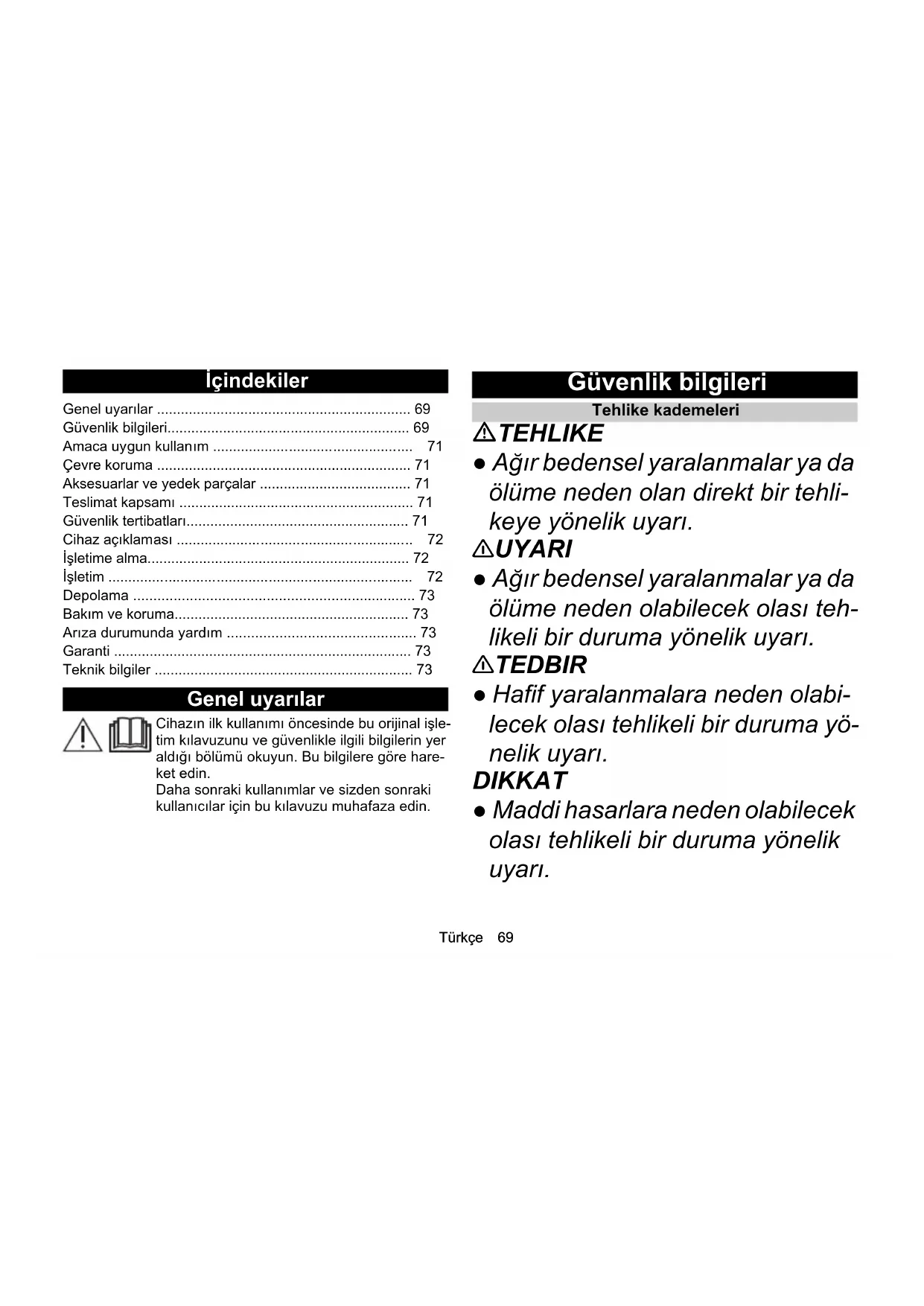 - dB(A) 68Türkçe 69 İçindekiler Genel uyarılar Cihazın ilk kullanımı öncesinde bu orijinal işle- tim kılavuzunu ve güvenlikle ilgili bilgilerin yer aldığı bölümü okuyun. Bu bilgilere göre hare- ket edin. Daha sonraki kullanımlar ve sizden sonraki kullanıcılar için bu kılavuzu muhafaza edin. Güvenlik bilgileri Tehlike kademeleri TEHLIKE ● Ağır bedensel yaralanmalar ya da ölüme neden olan direkt bir tehli- keye yönelik uyarı. 몇 UYARI ● Ağır bedensel yaralanmalar ya da ölüme neden olabilecek olası teh- likeli bir duruma yönelik uyarı. 몇 TEDBIR ● Hafif yaralanmalara neden olabi- lecek olası tehlikeli bir duruma yö- nelik uyarı. DIKKAT ● Maddi hasarlara neden olabilecek olası tehlikeli bir duruma yönelik uyarı. Genel uyarılar p. 69