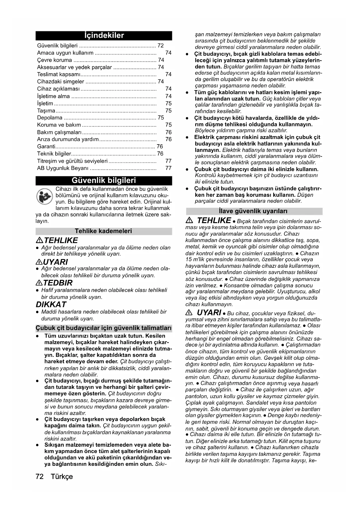 - 1,572 Türkçe İçindekiler Güvenlik bilgileri Cihazı ilk defa kullanmadan önce bu güvenlik bölümünü ve orijinal kullanım kılavuzunu oku- yun. Bu bilgilere göre hareket edin. Orijinal kul- lanım kılavuzunu daha sonra tekrar kullanmak ya da cihazın sonraki kullanıcılarına iletmek üzere sak- layın. Tehlike kademeleri TEHLIKE ● Ağır bedensel yaralanmalar ya da ölüme neden olan direkt bir tehlikeye yönelik uyarı. 몇 UYARI ● Ağır bedensel yaralanmalar ya da ölüme neden ola- bilecek olası tehlikeli bir duruma yönelik uyarı. 몇 TEDBIR ● Hafif yaralanmalara neden olabilecek olası tehlikeli bir duruma yönelik uyarı. DIKKAT ● Maddi hasarlara neden olabilecek olası tehlikeli bir duruma yönelik uyarı. Çubuk çit budayı cılar için güvenlik talimatları ● Tüm uzuvlarınızı bıçaktan uzak tutun. Kesilen malzemeyi, bıçaklar hareket halindeyken çıkar- mayın veya kesilecek malzemeyi elinizde tutma- yın. Bıçaklar, şalter kapatıldıktan sonra da hareket etmeye devam eder. Çit budayıcıyı çalıştı- rırken yapılan bir anlık bir dikkatsizlik, ciddi yaralan- malara neden olabilir. ● Çit budayıcıyı, bıçağı durmuş şekilde tutamağın- dan tutarak taşıyın ve herhangi bir şalteri çevir- memeye özen gösterin. Çit budayıcının doğru şekilde taşınması, bıçakların kazara devreye girme- si ve bunun sonucu meydana gelebilecek yaralan- ma riskini azaltır. ● Çit budayıcıyı taşırken veya depolarken bıçak kapağını daima takın. Çit budayıcının uygun şekil- de kullanılması bıçaklardan kaynaklanan yaralanma riskini azaltır. ● Sıkışan malzemeyi temizlemeden veya alete ba- kım yapmadan önce tüm alet şalterlerinin kapalı olduğundan ve akü paketinin çıkarıldığından ve- ya bağlantısının kesildiğinden emin olun. Sıkı- şan malzemeyi temizlerken veya bakım çalışmaları sırasında çit budayıcının beklenmedik bir şekilde devreye girmesi ciddi yaralanmalara neden olabilir. ● Çit budayıcıyı, bıçak gizli kablolara temas edebi- leceği için yalnızca yalıtımlı tutamak yüzeylerin- den tutun. Bıçaklar gerilim taşıyan bir hatta temas ederse çit budayıcının açıkta kalan metal kısımların- da gerilim oluşabilir ve bu da operatörün elektrik çarpması yaşamasına neden olabilir. ● Tüm güç kablolarını ve hatları kesim işlemi yapı- lan alanından uzak tutun. Güç kabloları çitler veya çalılar tarafından gizlenebilir ve yanl ışlıkla bıçak ta- rafından kesilebilir. ● Çit budayıcıyı kötü havalarda, özellikle de yıldı- rım düşme tehlikesi olduğunda kullanmayın. Böylece yıldırım çarpma riski azaltılır. ● Elektrik çarpması riskini azaltmak için çubuk çit budayıcıyı asla elektrik hatlarının yakınında kul- lanmayın. Elektrik hatlarıyla temas veya bunların yakınında kullanım, ciddi yaralanmalara veya ölüm- le sonuçlanan elektrik çarpmasına neden olabilir. ● Çubuk çit budayıcıyı daima iki elinizle kullanın. Kontrolü kaybetmemek için çit budayıcı uzantısını iki elinizle tutun. ● Çubuk çit budayıcıyı başınızın üstünde çalıştırır- ken her zaman baş koruması kullanın. Düşen parçalar ciddi yaralanmalara neden olabilir. İlave güvenlik uyarıları TEHLIKE ● Bıçak tarafından cisimlerin savrul- ması veya kesme takımına telin veya ipin dolanması so- nucu ağır yaralanmalar söz konusudur. Cihazı kullanmadan önce çalışma alanını dikkatlice taş, sopa, metal, kemik ve oyuncak gibi cisimler olup olmadığına dair kontrol edin ve bu cisimleri uzaklaştırın. ● Cihazın 15 m'lik çevresinde insanların, özellikler çocuk veya hayvanların bulunması halinde cihazı asla kullanmayın, çünkü bıçak tarafından cisimlerin savrulması tehlikesi söz konusudur. ● Cihaz üzerinde değişiklik yapmanıza izin verilmez. ● Konsantre olmadan çalışma sonucu ağır yaralanmalar meydana gelebilir. Uyuşturucu, alkol veya ilaç etkisi altındayken veya yorgun olduğunuzda cihazı kullanmayın. 몇 UYARI ● Bu cihaz, çocuklar veya fiziksel, du- yumsal veya zihni sınırlamalara sahip veya bu talimatla- ra itibar etmeyen kişiler tarafından kullanılamaz. ● Olası tehlikeleri görebilmek için çalışma alanını önünüzde herhangi bir engel olmadan görebilmelisiniz. Cihazı sa- dece iyi bir aydınlatma altında kullanın. ● Çalıştırmadan önce cihazın, tüm kontrol ve güvenlik ekipmanlarının düzgün olduğundan emin olun. Gevşek kilit olup olma- dığını kontrol edin, tüm koruyucu kapakların ve tuta- makların doğru ve güvenli bir şekilde bağlandığından emin olun. Cihazı, durumu kusursuz değilse kullanma- yın. ● Cihazı çalıştırmadan önce aşınm ış veya hasarlı parçaları değiştirin. ● Cihaz ile çalışırken uzun, ağır pantolon, uzun kollu giysiler ve kaymaz çizmeler giyin. Çıplak ayak çalışmayın. Sandalet veya kısa pantolon giymeyin. Sıkı oturmayan giysiler veya ipleri ve bantları olan giysiler giymekten kaçının. ● Denge kaybı nedeniy- le geri tepme riski. Normal olmayan bir duruştan kaçı- nın, sabit, güvenli bir konuma geçin ve dengede durun. ● Cihazı daima iki elle tutun. Bir elinizle ön tutamağı tu- tun. Diğer elinizle arka tutamağı tutun. Kilit açma tuşunu ve cihaz şalterini kullanın. ● Cihazı kullanırken cihazla birlikte verilen taşıma kayışını takmanız gerekir. Taşıma kayışı bir hızlı kilit ile donatılmıştır. Taşıma kayışı, ke- Güvenlik bilgileri p. 72