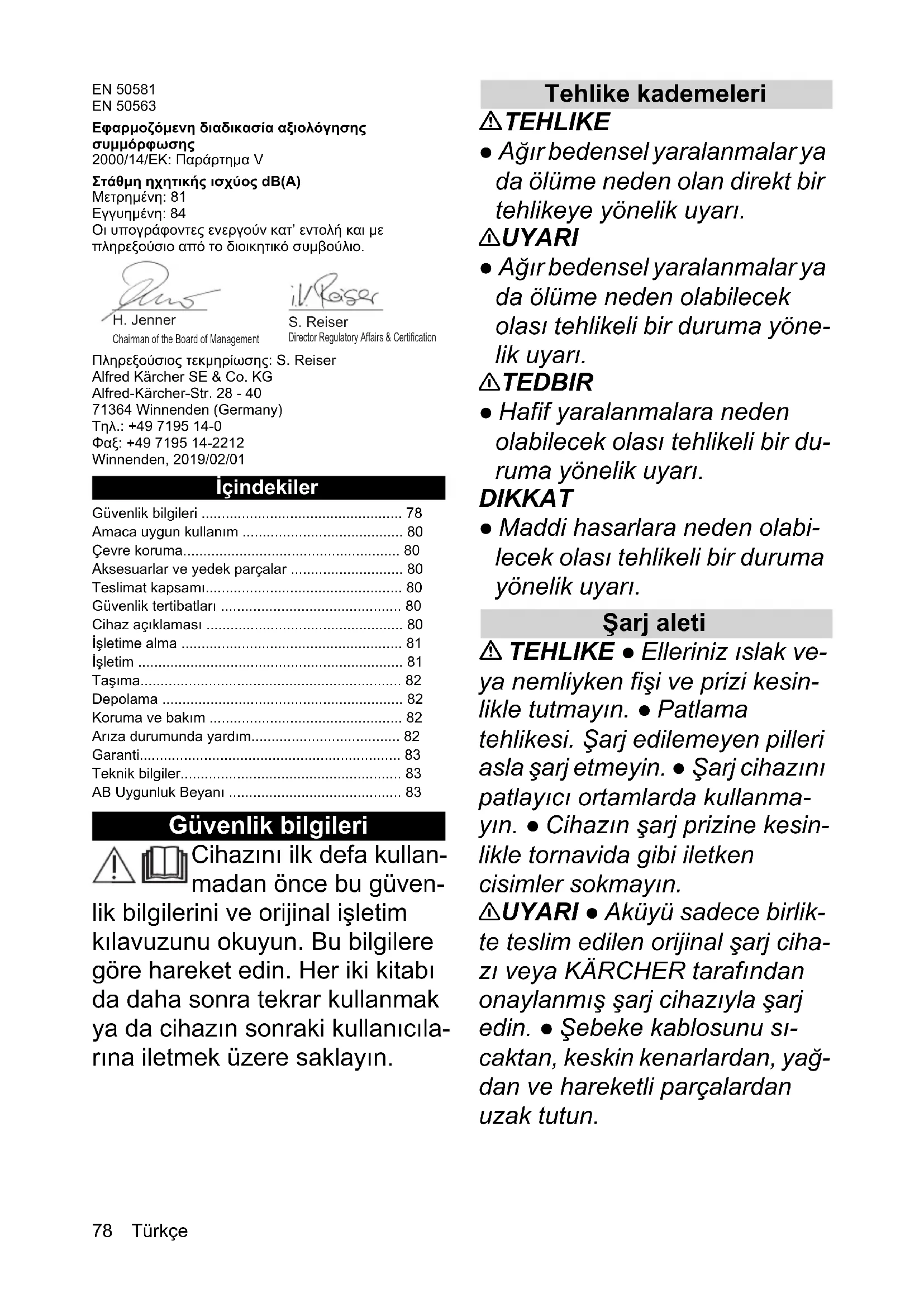 - dB(A) 84 84 OC 3 OC 3 Plus 7¾UN©H EN 50581 EN 50563 Εφαρμοζόμενη διαδικασία αξιολόγησης συμμόρφωσης 2000/14/EΚ: Παράρτημα V Στάθμη ηχητικής ισχύος dB(A) Μετρημένη: 81 Εγγυημένη: 84 Οι υπογράφοντες ενεργούν κατ’ εντολή και με πληρεξούσιο από το διοικητικό συμβούλιο. Πληρεξούσιος τεκμηρίωσης: S. Reiser Alfred Kärcher SE & Co. KG Alfred-Kärcher-Str. 28 - 40 71364 Winnenden (Germany) Τηλ.: +49 7195 14-0 Φαξ: +49 7195 14-2212 Winnenden, 2019/02/01 İçindekiler Güvenlik bilgileri Cihazını ilk defa kullan- madan önce bu güven- lik bilgilerini ve orijinal işletim kılavuzunu okuyun. Bu bilgilere göre hareket edin. Her iki kitabı da daha sonra tekrar kullanmak ya da cihazın sonraki kullanıcıla- rına iletmek üzere saklayın. Tehlike kademeleri TEHLIKE ● Ağır bedensel yaralanmalar ya da ölüme neden olan direkt bir tehlikeye yönelik uyarı. 몇 UYARI ● Ağır bedensel yaralanmalar ya da ölüme neden olabilecek olası tehlikeli bir duruma yöne- lik uyarı. 몇 TEDBIR ● Hafif yaralanmalara neden olabilecek olası tehlikeli bir du- ruma yönelik uyarı. DIKKAT ● Maddi hasarlara neden olabi- lecek olası tehlikeli bir duruma yönelik uyarı. Şarj aleti TEHLIKE ● Elleriniz ıslak ve- ya nemliyken fişi ve prizi kesin- likle tutmayın. ● Patlama tehlikesi. Şarj edilemeyen pilleri asla şarj etmeyin. ● Şarj cihazını patlayıcı ortamlarda kullanma- yın. ● Cihazın şarj prizine kesin- likle tornavida gibi iletken cisimler sokmayın. 몇 UYARI ● Aküyü sadece birlik- te teslim edilen orijinal şarj ciha- zı veya KÄRCHER tarafı ndan onaylanmış şarj cihazıyla şarj edin. ● Şebeke kablosunu sı- caktan, keskin kenarlardan, yağ- dan ve hareketli parçalardan uzak tutun. Güvenlik bilgileri p. 78