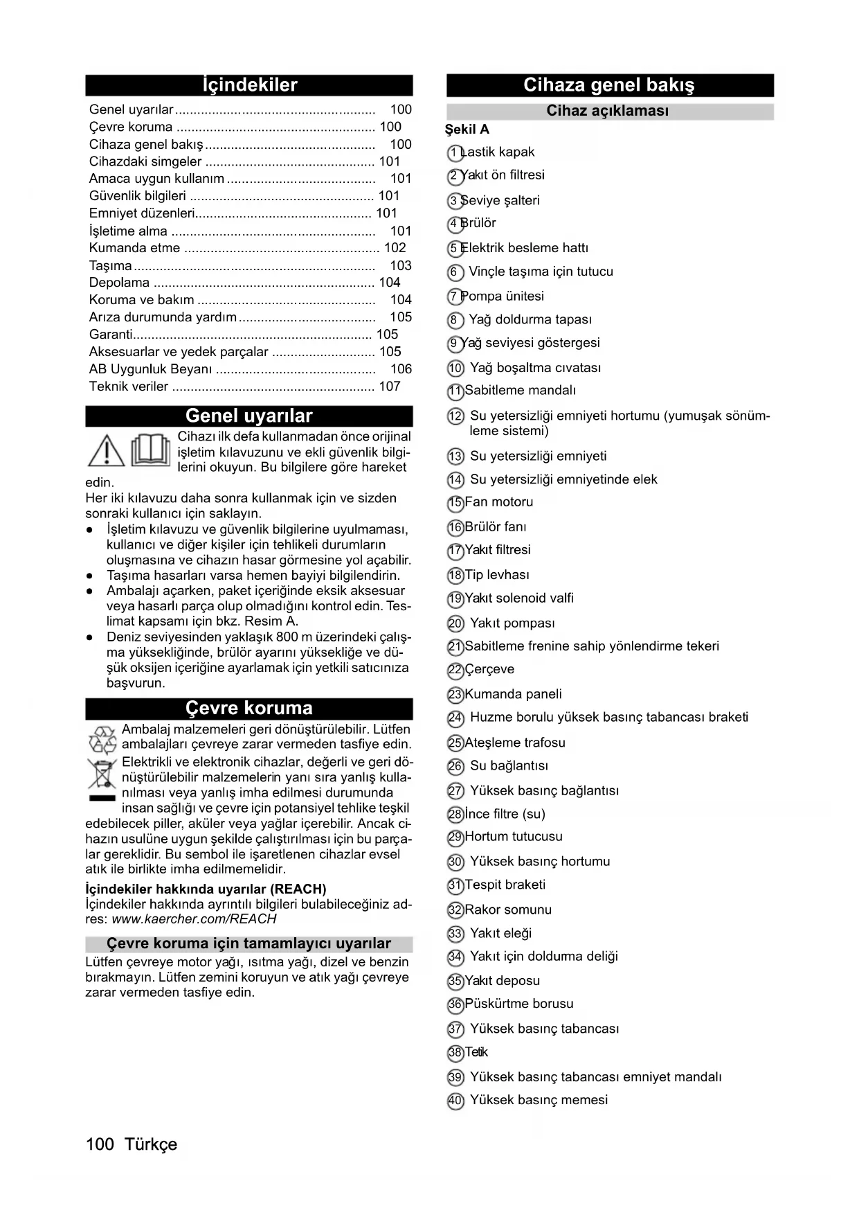 • 1,5100 Türkçe İçindekiler Genel uyarılar Cihazı ilk defa kullanmadan önce orijinal işletim kılavuzunu ve ekli güvenlik bilgi- lerini okuyun. Bu bilgilere göre hareket edin. Her iki kılavuzu daha sonra kullanmak için ve sizden sonraki kullanıcı için saklayın. ●İşletim kılavuzu ve güvenlik bilgilerine uyulmaması, kullanıcı ve diğer kişiler için tehlikeli durumların oluşmasına ve cihazın hasar görmesine yol açabilir. ● Taşıma hasarları varsa hemen bayiyi bilgilendirin. ● Ambalajı açarken, paket içeriğinde eksik aksesuar veya hasarlı parça olup olmadığını kontrol edin. Tes- limat kapsamı için bkz. Resim A. ● Deniz seviyesinden yaklaşık 800 m üzerindeki çalış- ma yüksekliğinde, brülör ayarını yüksekliğe ve dü- şük oksijen içeriğine ayarlamak için yetkili satıcınıza başvurun. Çevre koruma Ambalaj malzemeleri geri dönüştürülebilir. Lütfen ambalajları çevreye zarar vermeden tasfiye edin. Elektrikli ve elektronik cihazlar, değerli ve geri dö- nüştürülebilir malzemelerin yanı sıra yanlış kulla- nılması veya yanlış imha edilmesi durumunda insan sağlığı ve çevre için potansiyel tehlike teşkil edebilecek piller, aküler veya yağlar içerebilir. Ancak ci- hazın usulüne uygun şekilde çalıştırılması için bu parça- lar gereklidir. Bu sembol ile işaretlenen cihazlar evsel atık ile birlikte imha edilmemelidir. İçindekiler hakkında uyarılar (REACH) İçindekiler hakkında ayrıntılı bilgileri bulabileceğiniz ad- res: www.kaercher.com/REACH Çevre koruma için tamamlayıcı uyarılar Lütfen çevreye motor yağı, ısıtma yağı, dizel ve benzin bırakmayın. Lütfen zemini koruyun ve atık yağı çevreye zarar vermeden tasfiye edin. Cihaza genel bakış Cihaz açıklaması Şekil A 1 Lastik kapak 2 Yakıt ön filtresi 3 Seviye şalteri 4 Brülör 5 Elektrik besleme hattı 6 Vinçle taşıma için tutucu 7 Pompa ünitesi 8 Yağ doldurma tapası 9 Yağ seviyesi göstergesi 10 Yağ boşaltma cıvatası 11 Sabitleme mandalı 12 Su yetersizliği emniyeti hortumu (yumuşak sönüm- leme sistemi) 13 Su yetersizliği emniyeti 14 Su yetersizliği emniyetinde elek 15 Fan motoru 16 Brülör fanı 17 Yakıt filtresi 18 Tip levhası 19 Yakıt solenoid valfi 20 Yakıt pompası 21 Sabitleme frenine sahip yönlendirme tekeri 22 Çerçeve 23 Kumanda paneli 24 Huzme borulu yüksek basınç tabancası braketi 25 Ateşleme trafosu 26 Su bağlantısı 27 Yüksek basınç bağlantısı 28 İnce filtre (su) 29 Hortum tutucusu 30 Yüksek basınç hortumu 31 Tespit braketi 32 Rakor somunu 33 Yakıt eleği 34 Yakıt için doldurma deliği 35 Yakıt deposu 36 Püskürtme borusu 37 Yüksek basınç tabancası 38 Tetik 39 Yüksek basınç tabancası emniyet mandalı 40 Yüksek basınç memesi Genel uyarılar p. 100
