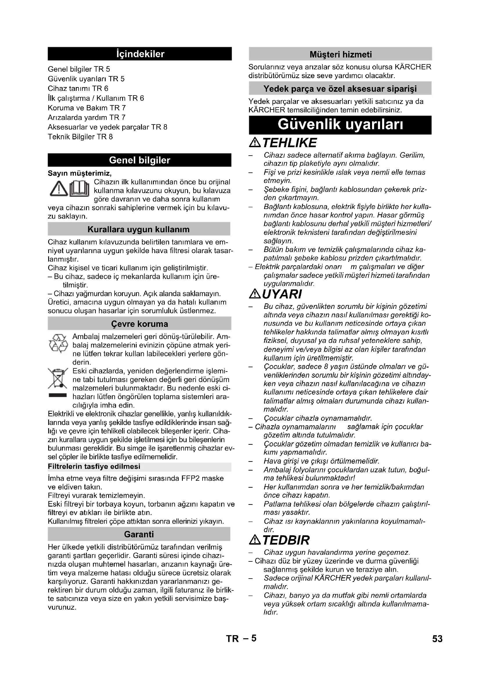 dB(A) dB(A) dB(A) 52 EL– 5 Sayın müşterimiz, Cihazın ilk kullanımından önce bu orijinal kullanma kılavuzunu okuyun, bu kılavuza göre davranın ve daha sonra kullanım veya cihazın sonraki sahiplerine vermek için bu kılavu- zu saklayın. Cihaz kullanım kılavuzunda belirtilen tanımlara ve em- niyet uyarılarına uygun şekilde hava filtresi olarak tasar- lanmıştır. Cihaz kişisel ve ticari kullanım için geliştirilmiştir. – Bu cihaz, sadece iç mekanlarda kullanım için üre- tilmiştir. – Cihazı yağmurdan koruyun. Açık alanda saklamayın. Üretici, amacına uygun olmayan ya da hatalı kullanım sonucu oluşan hasarlar için sorumluluk üstlenmez. Ambalaj malzemeleri geri dönüş-türülebilir. Am- balaj malzemelerini evinizin çöpüne atmak yeri- ne lütfen tekrar kullan labilecekleri yerlere gön- derin. Eski cihazlarda, yeniden değerlendirme işlemi- ne tabi tutulması gereken değerli geri dönüşüm malzemeleri bulunmaktadır. Bu nedenle eski ci- hazları lütfen öngörülen toplama sistemleri ara- cılığıyla imha edin. Elektrikli ve elektronik cihazlar genellikle, yanlış kullanıldık- larında veya yanlış şekilde tasfiye edildiklerinde insan sağ- lığı ve çevre için tehlikeli olabilecek bileşenler içerir. Ciha- zın kurallara uygun şekilde işletilmesi için bu bileşenlerin bulunması gereklidir. Bu simge ile işaretlenmiş cihazlar ev- sel çöpler ile birlikte tasfiye edilmemelidir. İmha etme veya filtre değişimi sırasında FFP2 maske ve eldiven takın. Filtreyi vurarak temizlemeyin. Eski filtreyi bir torbaya koyun, torbanın ağzını kapatın ve filtreyi ev atıkları ile birlikte atın. Kullanılmış filtreleri çöpe attıktan sonra ellerinizi yıkayın. Her ülkede yetkili distribütörümüz tarafından verilmiş garanti şartları geçerlidir. Garanti süresi içinde cihazı- nızda oluşan muhtemel hasarları, arızanın kaynağı üre- tim veya malzeme hatası olduğu sürece ücretsiz olarak karşılıyoruz. Garanti hakkınızdan yararlanmanızı ge- rektiren bir durum olduğu zaman, ilgili faturanız ile birlik- te satıcınıza veya size en yakın yetkili servisimize baş- vurunuz. Sorularınız veya arızalar söz konusu olursa KÄRCHER distribütörümüz size seve yardımcı olacaktır. Yedek parçalar ve aksesuarları yetkili satıcınız ya da KÄRCHER temsilciliğinden temin edebilirsiniz. TEHLIKE – Cihazı sadece alternatif akıma bağlayın. Gerilim, cihazın tip plaketiyle aynı olmalıdır. – Fişi ve prizi kesinlikle ıslak veya nemli elle temas etmeyin. – Şebeke fişini, bağlantı kablosundan çekerek priz- den çıkartmayın. – Bağlantı kablosuna, elektrik fişiyle birlikte her kulla- nımdan önce hasar kontrol yapın. Hasar görmüş bağlantı kablosunu derhal yetkili müşteri hizmetleri/ elektronik teknisteni tarafından değiştirilmesini sağlayın. – Bütün bakım ve temizlik çalışmalarında cihaz ka- patılmalı şebeke kablosu prizden çıkartılmalıdır. – Elektrik parçalardaki onarı m çalışmaları ve diğer çalışmalar sadece yetkili müşteri hizmeti tarafından uygulanmalıdır. UYARI – Bu cihaz, güvenlikten sorumlu bir kişinin gözetimi altında veya cihazın nasıl kullanılması gerektiği ko- nusunda ve bu kullanım neticesinde ortaya çıkan tehlikeler hakkında talimatlar almış olmayan kısıtlı fiziksel, duyusal ya da ruhsal yeteneklere sahip, deneyimi ve/veya bilgisi az olan kişiler tarafından kullanım için üretilmemiştir. – Çocuklar, sadece 8 yaşın üstünde olmaları ve gü- venliklerinden sorumlu bir kişinin gözetimi altınday- ken veya cihazın nasıl kullanılacağına ve cihazın kullanımı neticesinde ortaya çıkan tehlikelere dair talimatlar almış olmaları durumunda cihazı kullan- malıdır. – Çocuklar cihazla oynamamalıdır. – Cihazla oynamamalarını sağlamak için çocuklar gözetim altında tutulmalıdır. – Çocuklar gözetim olmadan temizlik ve kullanıcı ba- kımı yapmamalıdır. – Hava girişi ve çıkışı örtülmemelidir. – Ambalaj folyolarını çocuklardan uzak tutun, boğul- ma tehlikesi bulunmaktadır! – Her kullanımdan sonra ve her temizlik/bakımdan önce cihazı kapatın. – Patlama tehlikesi olan bölgelerde cihazın çalıştırıl- ması yasaktır. – Cihaz ısı kaynaklarının yakınlarına koyulmamalı- dır. TEDBIR – Cihaz uygun havalandırma yerine geçemez. – Cihazı düz bir yüzey üzerinde ve durma güvenliği sağlanmış şekilde kurun ve teraziye alın. – Sadece orijinal KÄRCHER yedek parçaları kullanıl- malıdır. – Cihazı, banyo ya da mutfak gibi nemli ortamlarda veya yüksek ortam sıcaklığı altında kullanılmama- lıdır. İçindekiler Genel bilgiler TR 5 Güvenlik uyarıları TR 5 Cihaz tanımı TR 6 İlk çalıştırma / Kullanım TR 6 Koruma ve Bakım TR 7 Arızalarda yardım TR 7 Aksesuarlar ve yedek parçalar TR 8 Teknik Bilgiler TR 8 Genel bilgiler Kurallara uygun kullanım Çevre koruma Filtrelerin tasfiye edilmesi Garanti Müşteri hizmeti Yedek parça ve özel aksesuar siparişi Güvenlik uyarıları 53TR– 6 TEHLIKE Ağır bedensel yaralanmalar ya da ölüme neden olan di- rekt bir tehlikeye yönelik uyarı. 몇 UYARI Ağır bedensel yaralanmalar ya da ölüme neden olabile- cek olası tehlikeli bir duruma yönelik uyarı. 몇 TEDBIR Hafif yaralanmalara neden olabilecek olası tehlikeli bir duruma yönelik uyarı. DIKKAT Maddi hasarlara neden olabilecek olası tehlikeli bir du- ruma yönelik uyarı. Ambalajı çıkartırken, ambalajın içinde bulunan malze- melerde eksik aksesuar ya da hasar olup olmadığını kontrol edin. Nakliye hasarlarında yetkili satıcınızı bilgi- lendirin. Şekiller Bkz. Katlanır sayfa! 1 Filtre kapağı ön 2 Ön filtre 3 Ana filtre 4 Filtre kapağı arka 5 Hava çıkışı 6 Dijital gösterge 7 Kumanda alanı 8 Hava kalite göstergesi 9 Filtre kapağı tutamağı 10 Hava kalite sensör kapağı 11