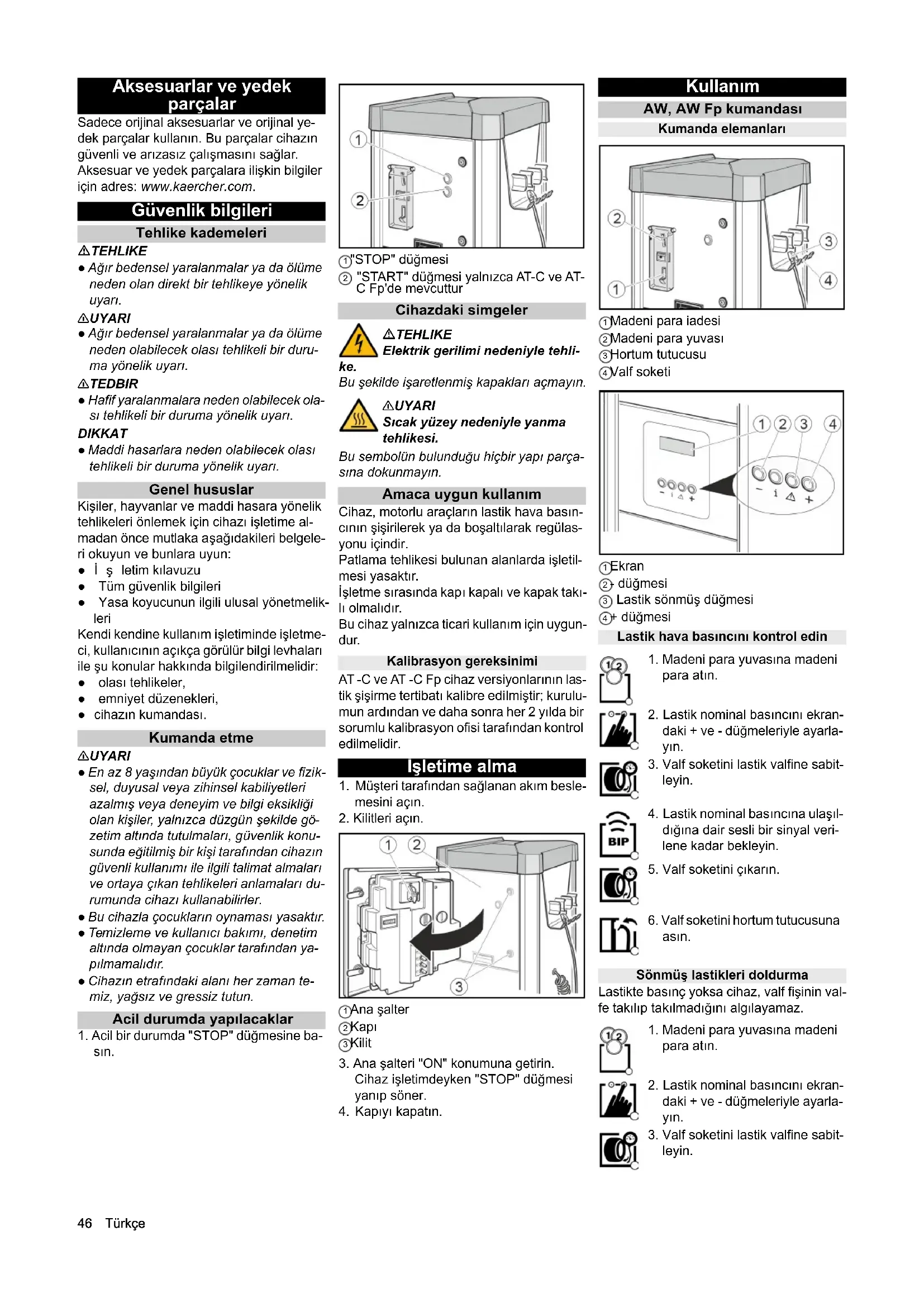 sın. 1 "STOP" düğmesi 2 "START" düğmesi yalnızca AT-C ve AT- C Fp'de mevcuttur Cihazdaki simgeler TEHLIKE Elektrik gerilimi nedeniyle tehli- ke. Bu şekilde işaretlenmiş kapakları açmayın. 몇UYARI Sıcak yüzey nedeniyle yanma tehlikesi. Bu sembolün bulunduğu hiçbir yapı parça- sına dokunmayın. Amaca uygun kullanım Cihaz, motorlu araçların lastik hava basın- cının şişirilerek ya da boşaltılarak regülas- yonu içindir. Patlama tehlikesi bulunan alanlarda işletil- mesi yasaktır. İşletme sırasında kapı kapalı ve kapak takı- lı olmalıdır. Bu cihaz yalnızca ticari kullanım için uygun- dur. Kalibrasyon gereksinimi AT -C ve AT -C Fp cihaz versiyonlarının las- tik şişirme tertibatı kalibre edilmiştir; kurulu- mun ardından ve daha sonra her 2 yılda bir sorumlu kalibrasyon ofisi tarafından kontrol edilmelidir. İşletime alma