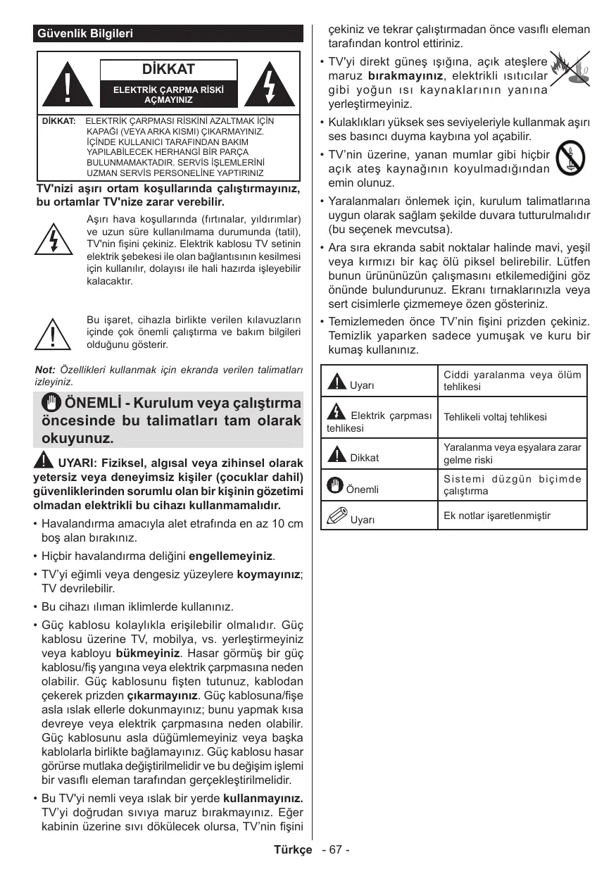 UZMAN SERVİS PERSONELİNE YAPTIRINIZ TV'nizi aşırı ortam koşullarında çalıştırmayınız, bu ortamlar TV'nize zarar verebilir. Aşırı hava koşullarında (fırtınalar, yıldırımlar) ve uzun süre kullanılmama durumunda (tatil), TV'nin fişini çekiniz. Elektrik kablosu TV setinin elektrik şebekesi ile olan bağlantısının kesilmesi için kullanılır, dolayısı ile hali hazırda işleyebilir kalacaktır. Bu işaret, cihazla birlikte verilen kılavuzların içinde çok önemli çalıştırma ve bakım bilgileri olduğunu gösterir.