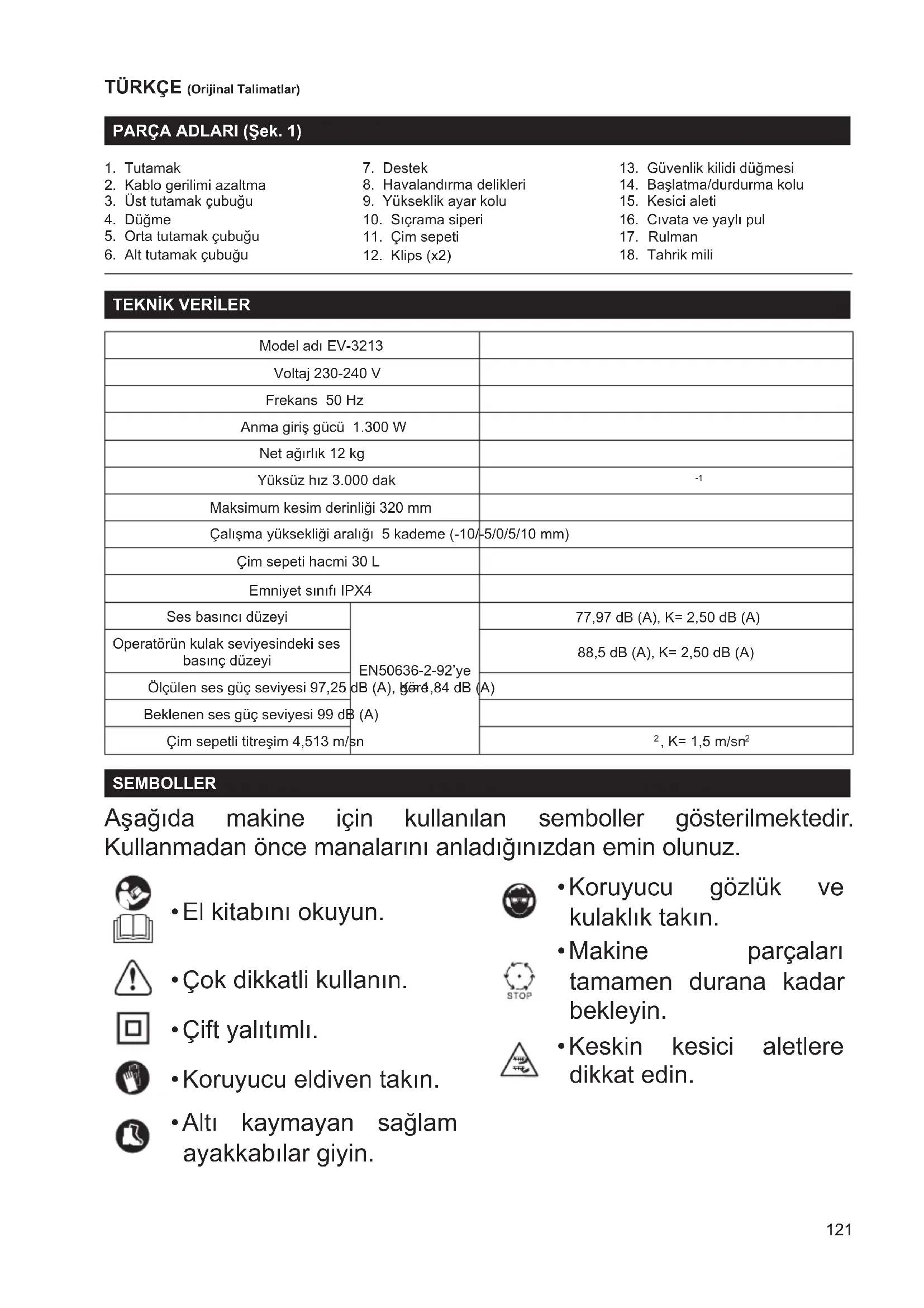 Model adı EV-3213 Voltaj 230-240 V Frekans 50 Hz Anma giriş gücü 1.300 W Net ağırlık 12 kg Yüksüz hız 3.000 dak