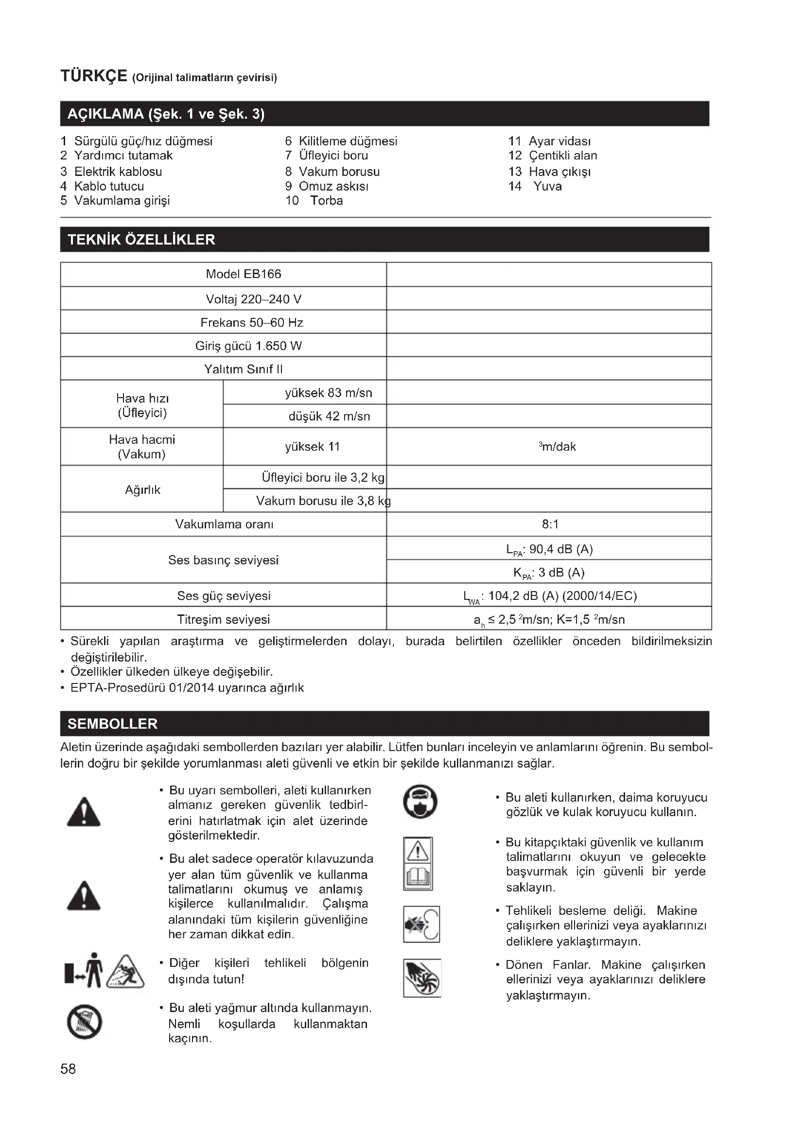 Model EB166 Voltaj 220–240 V Frekans 50–60 Hz Giriş gücü 1.650 W Yalıtım Sınıf II Hava hızı (Üeyici) yüksek 83 m/sn düşük 42 m/sn Hava hacmi (Vakum) yüksek 11