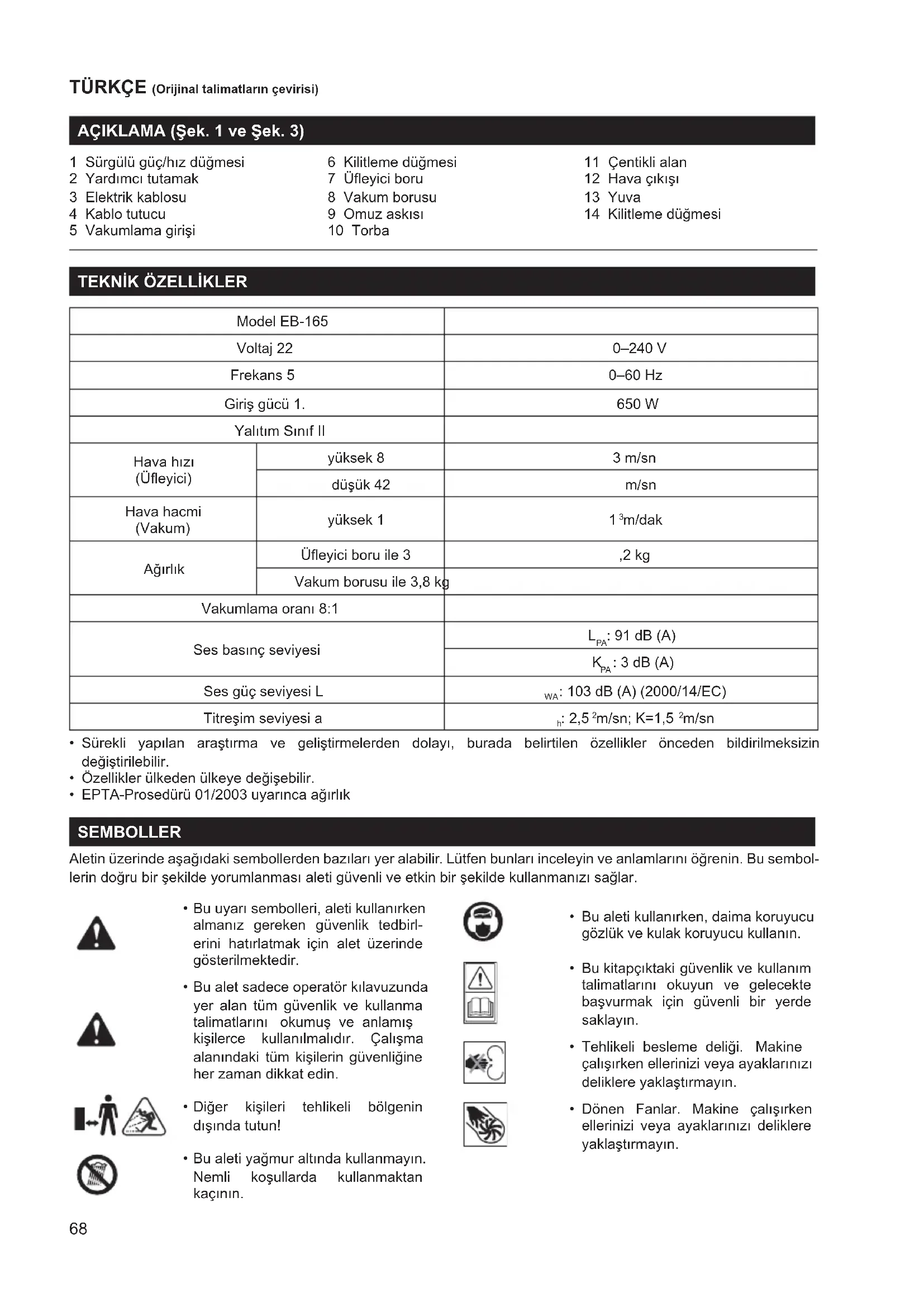 Model EB-165 Voltaj 22 0–240 V Frekans 5 0–60 Hz Giriş gücü 1. 650 W Yalıtım Sınıf II Hava hızı (Üeyici) yüksek 8 3 m/sn düşük 42 m/sn Hava hacmi (Vakum) yüksek 1