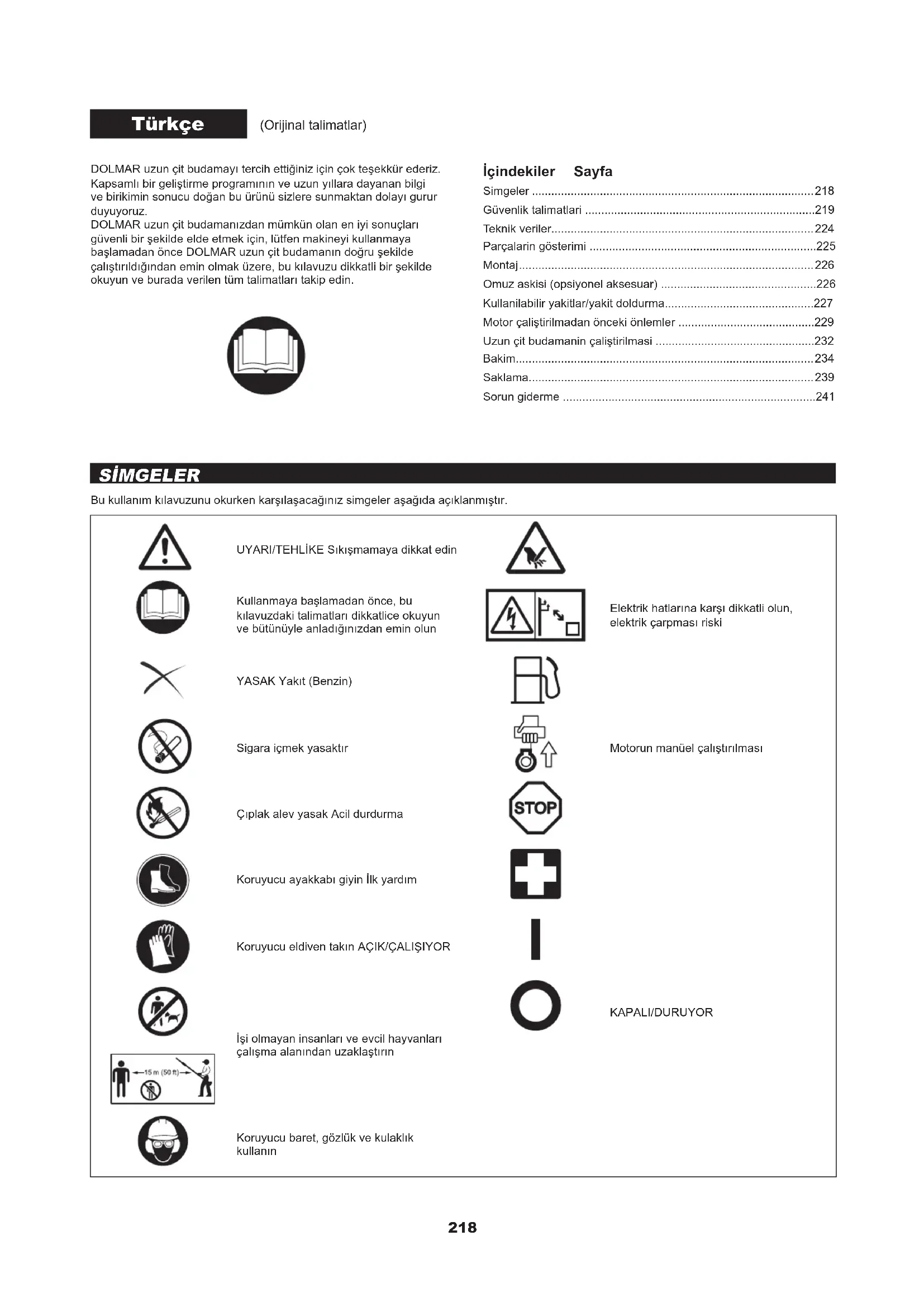 - Αποκολλημένος συνδετήρας Συνδέστε το καλά Μη φυσιολογικό ηλεκτρικό σύστημα Ζητήστε την επιθεώρηση και συντήρηση. Όταν ο κινητήρας δεν ξεκινά μετά τη λειτουργία προθέρμανσης: Εάν δεν υπάρχει καμιά ανωμαλία στα σημεία ελέγχου, ανοίξτε το γκάζι περίπου στο 1/3 και ξεκινήστε τον κινητήρα. ΕΠΙΛΥΣΗ ΠΡΟΒΛΗΜΑΤΩΝ218 DOLMAR uzun çit budamayı tercih ettiğiniz için çok teşekkür ederiz. Kapsamlı bir geliştirme programının ve uzun yıllara dayanan bilgi ve birikimin sonucu doğan bu ürünü sizlere sunmaktan dolayı gurur duyuyoruz. DOLMAR uzun çit budamanızdan mümkün olan en iyi sonuçları güvenli bir şekilde elde etmek için, lütfen makineyi kullanmaya başlamadan önce DOLMAR uzun çit budamanın doğru şekilde çalıştırıldığından emin olmak üzere, bu kılavuzu dikkatli bir şekilde okuyun ve burada verilen tüm talimatları takip edin. Türkçe (Orijinal talimatlar) İçindekiler Sayfa Simgeler p. 218