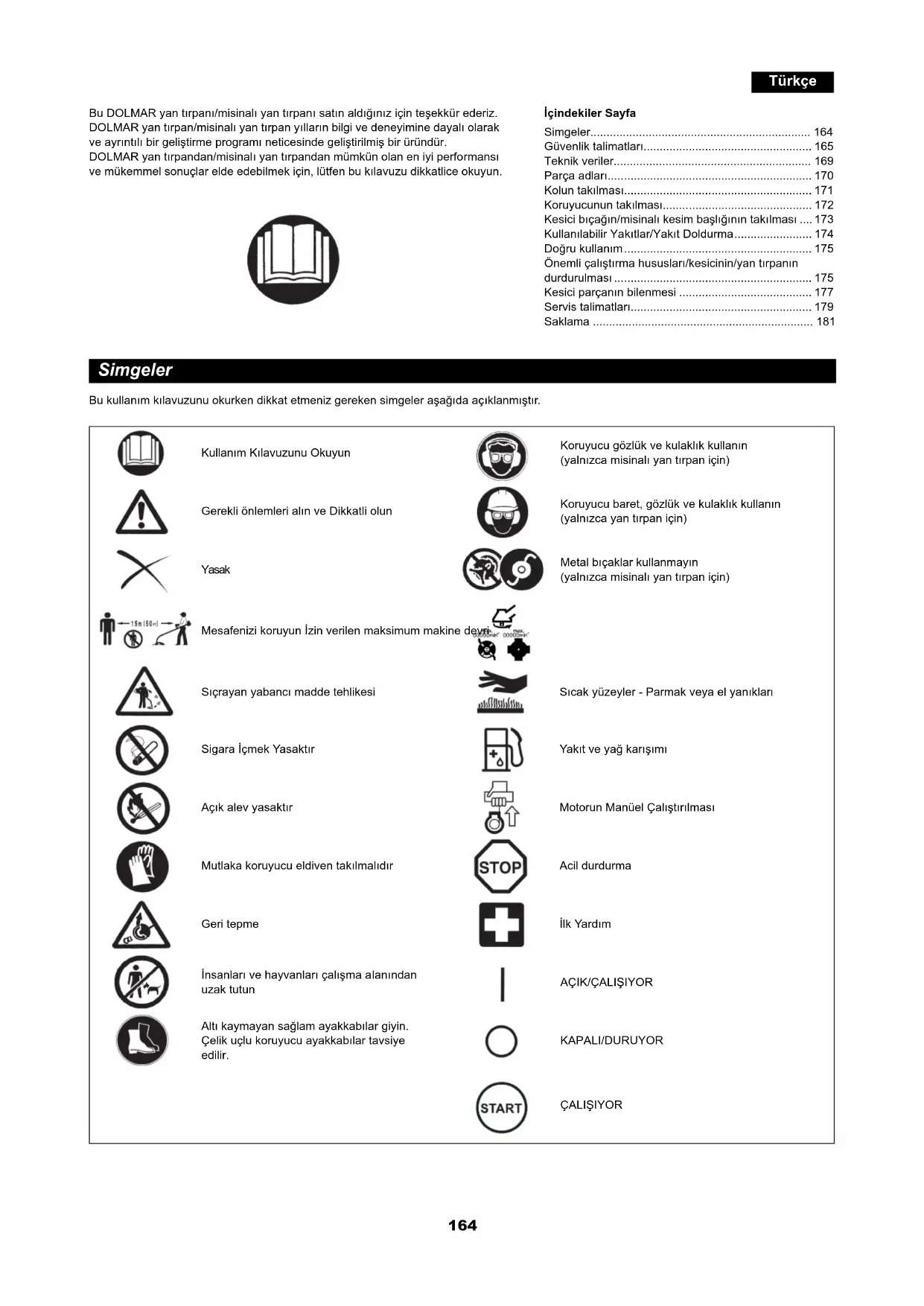 Υγρασία164 Bu DOLMAR yan tırpanı/misinalı yan tırpanı satın aldığınız için teşekkür ederiz. DOLMAR yan tırpan/misinalı yan tırpan yılların bilgi ve deneyimine dayalı olarak ve ayrıntılı bir geliştirme programı neticesinde geliştirilmiş bir üründür. DOLMAR yan tırpandan/misinalı yan tırpandan mümkün olan en iyi performansı ve mükemmel sonuçlar elde edebilmek için, lütfen bu kılavuzu dikkatlice okuyun. Bu kullanım kılavuzunu okurken dikkat etmeniz gereken simgeler aşağıda açıklanmıştır. Simgeler Kullanım Kılavuzunu Okuyun Koruyucu gözlük ve kulaklık kullanın (yalnızca misinalı yan tırpan için) Gerekli önlemleri alın ve Dikkatli olun Koruyucu baret, gözlük ve kulaklık kullanın (yalnızca yan tırpan için) Yasak Metal bıçaklar kullanmayın (yalnızca misinalı yan tırpan için) Mesafenizi koruyun İzin verilen maksimum makine devri Sıçrayan yabancı madde tehlikesi Sıcak yüzeyler - Parmak veya el yanıkları Sigara İçmek YasaktırYakıt ve yağ karışımı Açık alev yasaktır Motorun Manüel Çalıştırılması Mutlaka koruyucu eldiven takılmalıdır Acil durdurma Geri tepme İlk Yardım İnsanları ve hayvanları çalışma a lanı ndan uzak tutun