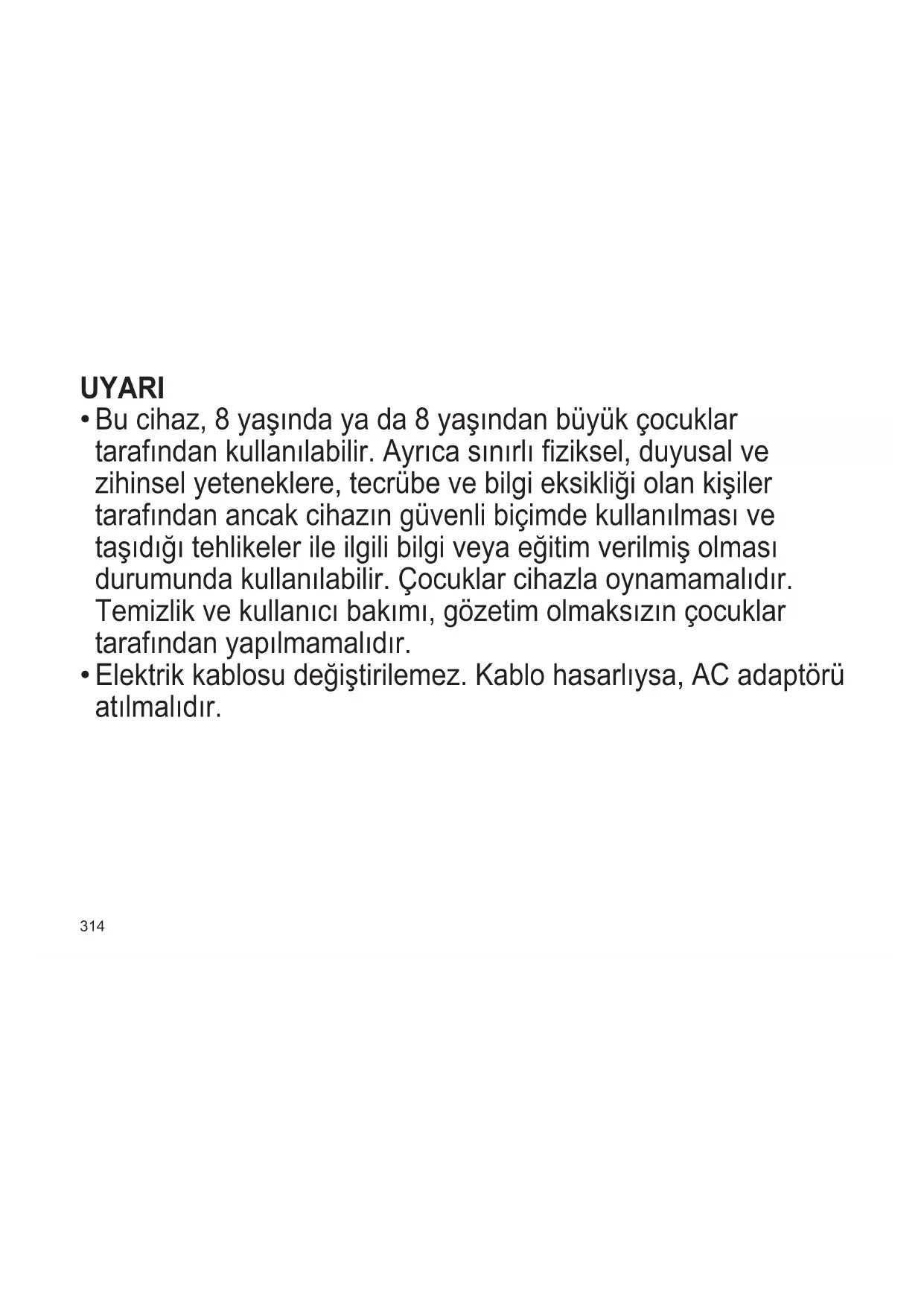 Bu cihaz, 8 yaşında ya da 8 yaşından büyük çocuklar tarafından kullanılabilir. Ayrıca sınırlı fiziksel, duyusal ve zihinsel yeteneklere, tecrübe ve bilgi eksikliği olan kişiler tarafından ancak cihazın güvenli biçimde kullanılması ve taşıdığı tehlikeler ile ilgili bilgi veya eğitim verilmiş olması durumunda kullanılabilir. Çocuklar cihazla oynamamalıdır. Temizlik ve kullanıcı bakımı, gözetim olmaksızın çocuklar tarafından yapılmamalıdır.