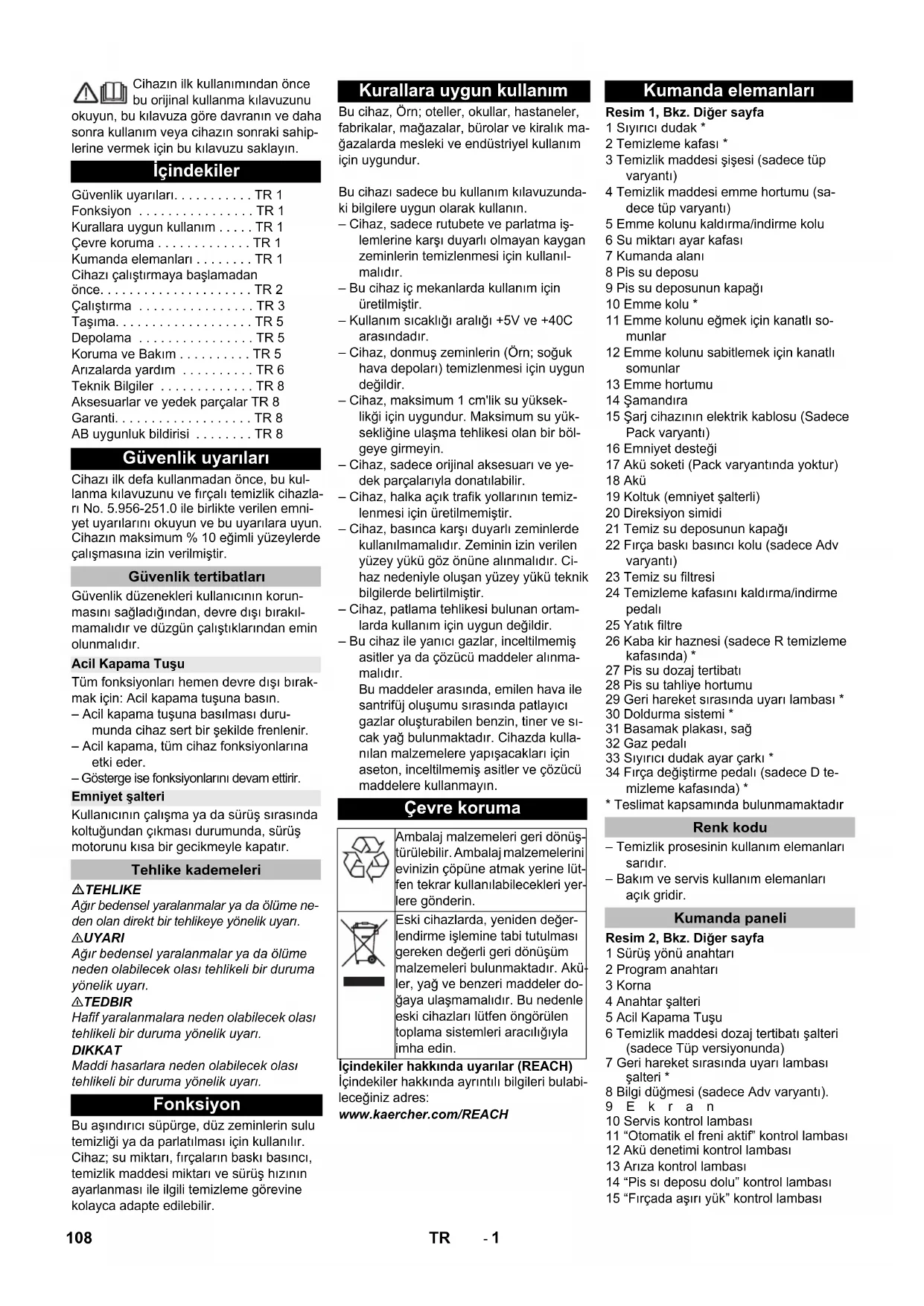 Chairman of the Board of Management Director Regulatory Affairs & Certification 107EL- 1 Cihazın ilk kullanımından önce bu orijinal kullanma kılavuzunu okuyun, bu kılavuza göre davranın ve daha sonra kullanım veya cihazın sonraki sahip- lerine vermek için bu kılavuzu saklayın. Cihazı ilk defa kullanmadan önce, bu kul- lanma kılavuzunu ve fırçalı temizlik cihazla- rı No. 5.956-251.0 ile birlikte verilen emni- yet uyarılarını okuyun ve bu uyarılara uyun. Cihazın maksimum % 10 eğimli yüzeylerde çalışmasına izin verilmiştir. Güvenlik düzenekleri kullanıcının korun- masını sağladığından, devre dışı bırakıl- mamalıdır ve düzgün çalıştıklarından emin olunmalıdır. Tüm fonksiyonları hemen devre dışı bırak- mak için: Acil kapama tuşuna basın. – Acil kapama tuşuna basılması duru- munda cihaz sert bir şekilde frenlenir. – Acil kapama, tüm cihaz fonksiyonlarına etki eder. – Gösterge ise fonksiyonlarını devam ettirir. Kullanıcının çalışma ya da sürüş sırasında koltuğundan çıkması durumunda, sürüş motorunu kısa bir gecikmeyle kapatır. TEHLIKE Ağır bedensel yaralanmalar ya da ölüme ne- den olan direkt bir tehlikeye yönelik uyarı. 몇 UYARI Ağır bedensel yaralanmalar ya da ölüme neden olabilecek olası tehlikeli bir duruma yönelik uyarı. 몇 TEDBIR Hafif yaralanmalara neden olabilecek olası tehlikeli bir duruma yönelik uyarı. DIKKAT Maddi hasarlara neden olabilecek olası tehlikeli bir duruma yönelik uyarı. Bu aşındırıcı süpürge, düz zeminlerin sulu temizliği ya da parlatılması için kullanılır. Cihaz; su miktarı, fırçaların baskı basıncı, temizlik maddesi miktarı ve sürüş hızının ayarlanması ile ilgili temizleme görevine kolayca adapte edilebilir. Bu cihaz, Örn; oteller, okullar, hastaneler, fabrikalar, mağazalar, bürolar ve kiralık ma- ğazalarda mesleki ve endüstriyel kullanım için uygundur. Bu cihazı sadece bu kullanım kılavuzunda- ki bilgilere uygun olarak kullanın. – Cihaz, sadece rutubete ve parlatma iş- lemlerine karşı duyarlı olmayan kaygan zeminlerin temizlenmesi için kullanıl- malıdır. – Bu cihaz iç mekanlarda kullanım için üretilmiştir. – Kullanım sıcaklığı aralığı +5V ve +40C arasındadır. – Cihaz, donmuş zeminlerin (Örn; soğuk hava depoları) temizlenmesi için uygun değildir. – Cihaz, maksimum 1 cm'lik su yüksek- likği için uygundur. Maksimum su yük- sekliğine ulaşma tehlikesi olan bir böl- geye girmeyin. – Cihaz, sadece orijinal aksesuarı ve ye- dek parçalarıyla donatılabilir. – Cihaz, halka açık trafik yollarının temiz- lenmesi için üretilmemiştir. – Cihaz, basınca karşı duyarlı zeminlerde kullanılmamalıdır. Zeminin izin verilen yüzey yükü göz önüne alınmalıdır. Ci- haz nedeniyle oluşan yüzey yükü teknik bilgilerde belirtilmiştir. – Cihaz, patlama tehlikesi bulunan ortam- larda kullanım için uygun değildir. – Bu cihaz ile yanıcı gazlar, inceltilmemiş asitler ya da çözücü maddeler alınma- malıdır. Bu maddeler arasında, emilen hava ile santrifüj oluşumu sırasında patlayıcı gazlar oluşturabilen benzin, tiner ve sı- cak yağ bulunmaktadır. Cihazda kulla- nılan malzemelere yapışacakları için aseton, inceltilmemiş asitler ve çözücü maddelere kullanmayın. İçindekiler hakkında uyarılar (REACH) İçindekiler hakkında ayrıntılı bilgileri bulabi- leceğiniz adres: www.kaercher.com/REACH Resim 1, Bkz. Diğer sayfa 1 Sıyırıcı dudak * 2 Temizleme kafası * 3 Temizlik maddesi şişesi (sadece tüp varyantı) 4 Temizlik maddesi emme hortumu (sa- dece tüp varyantı) 5 Emme kolunu kaldırma/indirme kolu 6 Su miktarı ayar kafası 7 Kumanda alanı 8 Pis su deposu 9 Pis su deposunun kapağı 10 Emme kolu * 11 Emme kolunu eğmek için kanatlı so- munlar 12 Emme kolunu sabitlemek için kanatlı somunlar 13 Emme hortumu 14 Şamandıra 15 Şarj cihazının elektrik kablosu (Sadece Pack varyantı) 16 Emniyet desteği 17 Akü soketi (Pack varyantında yoktur) 18 Akü 19 Koltuk (emniyet şalterli) 20 Direksiyon simidi 21 Temiz su deposunun kapağı 22 Fırça baskı basıncı kolu (sadece Adv varyantı) 23 Temiz su filtresi 24 Temizleme kafasını kaldırma/indirme pedalı 25 Yatık filtre 26 Kaba kir haznesi (sadece R temizleme kafasında) * 27 Pis su dozaj tertibatı 28 Pis su tahliye hortumu 29 Geri hareket sırasında uyarı lambası * 30 Doldurma sistemi * 31 Basamak plakası, sağ 32 Gaz pedalı 33 Sıyırıcı dudak ayar çarkı * 34 Fırça değiştirme pedalı (sadece D te- mizleme kafasında) *