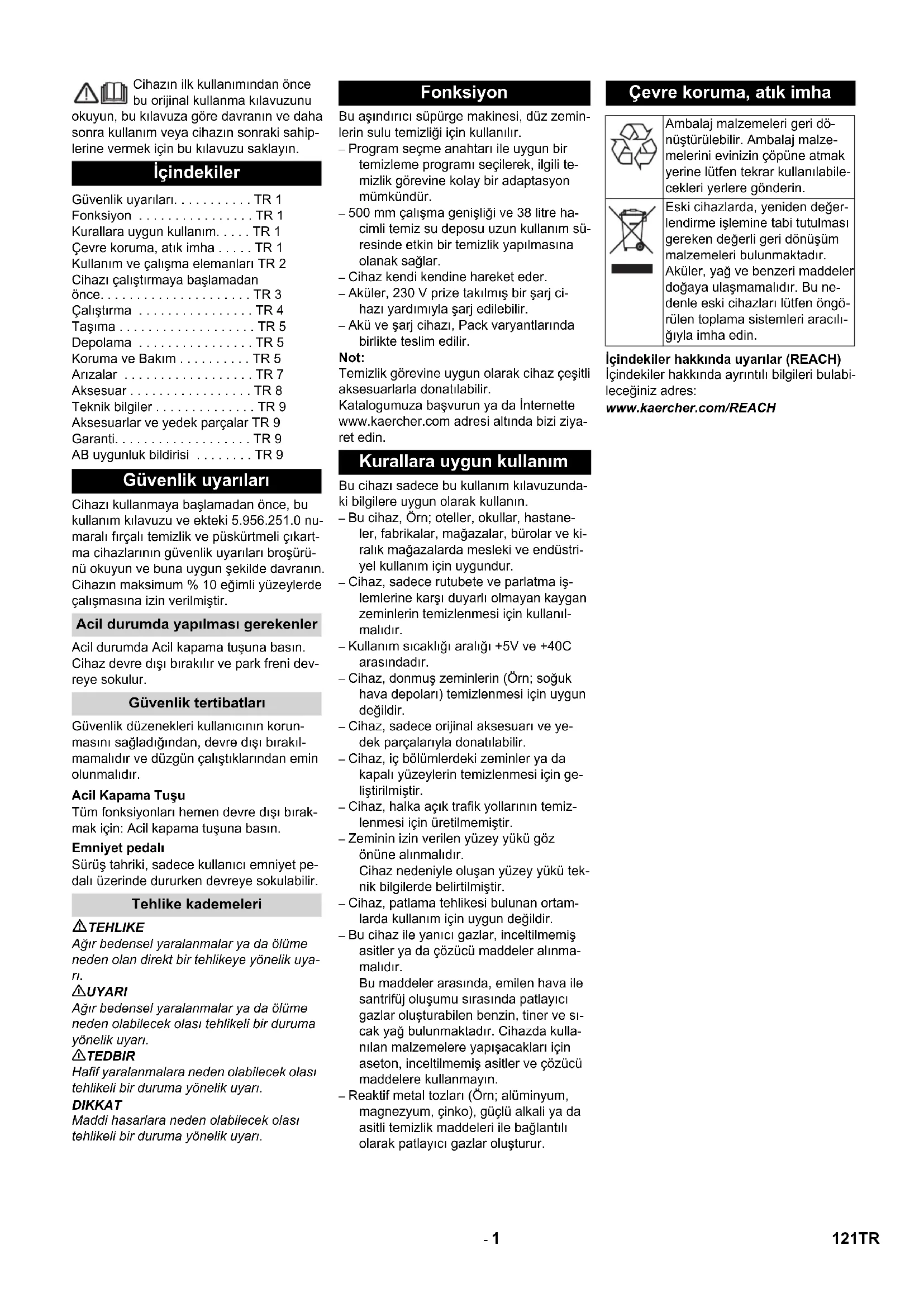 Chairman of the Board of Management Director Regulatory Affairs & Certification 120 EL- 1 Cihazın ilk kullanımından önce bu orijinal kullanma kılavuzunu okuyun, bu kılavuza göre davranın ve daha sonra kullanım veya cihazın sonraki sahip- lerine vermek için bu kılavuzu saklayın. Cihazı kullanmaya başlamadan önce, bu kullanım kılavuzu ve ekteki 5.956.251.0 nu- maralı fırçalı temizlik ve püskürtmeli çıkart- ma cihazlarının güvenlik uyarıları broşürü- nü okuyun ve buna uygun şekilde davranın. Cihazın maksimum % 10 eğimli yüzeylerde çalışmasına izin verilmiştir. Acil durumda Acil kapama tuşuna basın. Cihaz devre dışı bırakılır ve park freni dev- reye sokulur. Güvenlik düzenekleri kullanıcının korun- masını sağladığından, devre dışı bırakıl- mamalıdır ve düzgün çalıştıklarından emin olunmalıdır. Tüm fonksiyonları hemen devre dışı bırak- mak için: Acil kapama tuşuna basın. Sürüş tahriki, sadece kullanıcı emniyet pe- dalı üzerinde dururken devreye sokulabilir. TEHLIKE Ağır bedensel yaralanmalar ya da ölüme neden olan direkt bir tehlikeye yönelik uya- rı. 몇 UYARI Ağır bedensel yaralanmalar ya da ölüme neden olabilecek olası tehlikeli bir duruma yönelik uyarı. 몇 TEDBIR Hafif yaralanmalara neden olabilecek olası tehlikeli bir duruma yönelik uyarı. DIKKAT Maddi hasarlara neden olabilecek olası tehlikeli bir duruma yönelik uyarı. Bu aşındırıcı süpürge makinesi, düz zemin- lerin sulu temizliği için kullanılır. – Program seçme anahtarı ile uygun bir temizleme programı seçilerek, ilgili te- mizlik görevine kolay bir adaptasyon mümkündür. – 500 mm çalışma genişliği ve 38 litre ha- cimli temiz su deposu uzun kullanım sü- resinde etkin bir temizlik yapılmasına olanak sağlar. – Cihaz kendi kendine hareket eder. – Aküler, 230 V prize takılmış bir şarj ci- hazı yardımıyla şarj edilebilir. – Akü ve şarj cihazı, Pack varyantlarında birlikte teslim edilir. Not: Temizlik görevine uygun olarak cihaz çeşitli aksesuarlarla donatılabilir. Katalogumuza başvurun ya da İnternette www.kaercher.com adresi altında bizi ziya- ret edin. Bu cihazı sadece bu kullanım kılavuzunda- ki bilgilere uygun olarak kullanın. – Bu cihaz, Örn; oteller, okullar, hastane- ler, fabrikalar, mağazalar, bürolar ve ki- ralık mağazalarda mesleki ve endüstri- yel kullanım için uygundur. – Cihaz, sadece rutubete ve parlatma iş- lemlerine karşı duyarlı olmayan kaygan zeminlerin temizlenmesi için kullanıl- malıdır. – Kullanım sıcaklığı aralığı +5V ve +40C arasındadır. – Cihaz, donmuş zeminlerin (Örn; soğuk hava depoları) temizlenmesi için uygun değildir. – Cihaz, sadece orijinal aksesuarı ve ye- dek parçalarıyla donatılabilir. – Cihaz, iç bölümlerdeki zeminler ya da kapalı yüzeylerin temizlenmesi için ge- liştirilmiştir. – Cihaz, halka açık trafik yollarının temiz- lenmesi için üretilmemiştir. – Zeminin izin verilen yüzey yükü göz önüne alınmalıdır. Cihaz nedeniyle oluşan yüzey yükü tek- nik bilgilerde belirtilmiştir. – Cihaz, patlama tehlikesi bulunan ortam- larda kullanım için uygun değildir. – Bu cihaz ile yanıcı gazlar, inceltilmemiş asitler ya da çözücü maddeler alınma- malıdır. Bu maddeler arasında, emilen hava ile santrifüj oluşumu sırasında patlayıcı gazlar oluşturabilen benzin, tiner ve sı- cak yağ bulunmaktadır. Cihazda kulla- nılan malzemelere yapışacakları için aseton, inceltilmemiş asitler ve çözücü maddelere kullanmayın. – Reaktif metal tozları (Örn; alüminyum, magnezyum, çinko), güçlü alkali ya da asitli temizlik maddeleri ile bağlantılı olarak patlayıcı gazlar oluşturur. İçindekiler hakkında uyarılar (REACH) İçindekiler hakkında ayrıntılı bilgileri bulabi- leceğiniz adres: www.kaercher.com/REACH İçindekiler Güvenlik uyarıları. . . . . . . . . . . TR 1 Fonksiyon . . . . . . . . . . . . . . . . TR 1 Kurallara uygun kullanım. . . . . TR 1 Çevre koruma, atık imha . . . . . TR 1 Kullanım ve çalışma elemanları TR 2 Cihazı çalıştırmaya başlamadan önce. . . . . . . . . . . . . . . . . . . . . TR 3 Çalıştırma . . . . . . . . . . . . . . . . TR 4 Taşıma . . . . . . . . . . . . . . . . . . . TR 5 Depolama . . . . . . . . . . . . . . . . TR 5 Koruma ve Bakım . . . . . . . . . . TR 5 Arızalar . . . . . . . . . . . . . . . . . . TR 7 Aksesuar . . . . . . . . . . . . . . . . . TR 8 Teknik bilgiler . . . . . . . . . . . . . . TR 9 Aksesuarlar ve yedek parçalar TR 9 Garanti. . . . . . . . . . . . . . . . . . . TR 9 AB uygunluk bildirisi . . . . . . . . TR 9 Güvenlik uyarıları Acil durumda yapılması gerekenler Güvenlik tertibatları Acil Kapama Tuşu Emniyet pedalı Tehlike kademeleri Fonksiyon Kurallara uygun kullanım Çevre koruma, atık imha Ambalaj malzemeleri geri dö- nüştürülebilir. Ambalaj malze- melerini evinizin çöpüne atmak yerine lütfen tekrar kullanılabile- cekleri yerlere gönderin. Eski cihazlarda, yeniden değer- lendirme işlemine tabi tutulması gereken değerli geri dönüşüm malzemeleri bulunmaktadır. Aküler, yağ ve benzeri maddeler doğaya ulaşmamalıdır. Bu ne- denle eski cihazları lütfen öngö- rülen toplama sistemleri aracılı- ğıyla imha edin. 121TR- 2 1 Hortum bağlantısı, doldurma otomatiği 2 Temiz su deposu 3 Şarj durumu göstergesi (Sadece Bp Pack varyantında) 4 Pis su deposu 5 Şamandıra 6 Pis su tahliye hortumu 7 Cihaz fişi 8 Akü soketi 9 Akü 10 Şarj cihazının elektrik fişi (Sadece Bp Pack varyantında) 11 Emme kolu 12 Temiz su valfı 13 Temiz su süzgeci 14 Temiz su deposunun kapağı 15 Temizleme kafası 16 Aşırı kirler için emme kolu askısı (iki adımlı yöntem) 17 Temiz su doluluk seviyesi göstergesi Temiz su tahliye hortumu 18 Gaz pedalı 19 Kullanıcının durma yüzeyi 20 Emniyet pedalı 21 Kilit 22 Kumanda paneli
