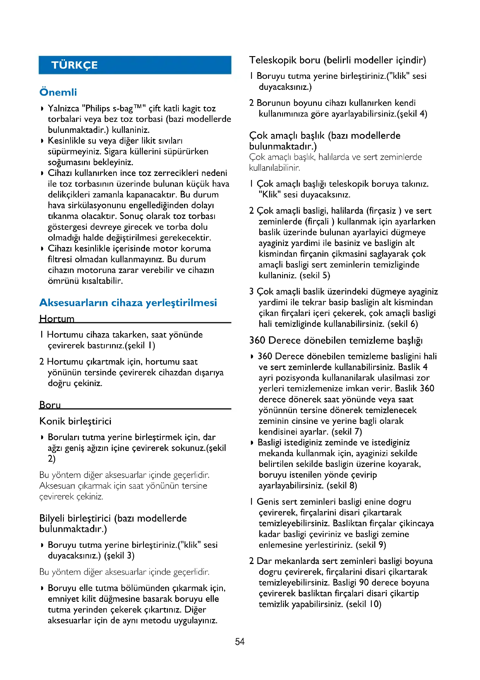 Bu yöntem diğer aksesuarlar içinde geçerlidir. Aksesuarı çıkarmak için saat yönünün tersine çevirerek çekiniz. Bilyeli birleştirici (bazı modellerde bulunmaktadır.) ◗ Boruyu tutma yerine birleştiriniz.("klik" sesi duyacaksınız.) (şekil 3) Bu yöntem diğer aksesuarlar içinde geçerlidir. ◗ Boruyu elle tutma bölümünden çıkarmak için, emniyet kilit düğmesine basarak boruyu elle tutma yerinden çekerek çıkartınız. Diğer aksesuarlar için de aynı metodu uygulayınız. Teleskopik boru (belirli modeller içindir) 1 Boruyu tutma yerine birleştiriniz.("klik" sesi duyacaksınız.) 2 Borunun boyunu cihazı kullanırken kendi kullanımınıza göre ayarlayabilirsiniz.(şekil 4) Çok amaçlı başlık (bazı modellerde bulunmaktadır.) Çok amaçlı başlık, halılarda ve sert zeminlerde kullanılabilinir. 1 Çok amaçlı başlığı teleskopik boruya takınız. "Klik" sesi duyacaksınız. 2 Çok amaçli basligi, halilarda (firçasiz ) ve sert zeminlerde (firçali ) kullanmak için ayarlarken baslik üzerinde bulunan ayarlayici dügmeye ayaginiz yardimi ile basiniz ve basligin alt kismindan firçanin çikmasini saglayarak çok amaçli basligi sert zeminlerin temizliginde kullaniniz. (sekil 5) 3 Çok amaçli baslik üzerindeki dügmeye ayaginiz yardimi ile tekrar basip basligin alt kismindan çikan firçalari içeri çekerek, çok amaçli basligi hali temizliginde kullanabilirsiniz. (sekil 6) 360 Derece dönebilen temizleme başlığı ◗ 360 Derece dönebilen temizleme basligini hali ve sert zeminlerde kullanabilirsiniz. Baslik 4 ayri pozisyonda kullananilarak ulasilmasi zor yerleri temizlemenize imkan verir. Baslik 360 derece dönerek saat yönünde veya saat yönünnün tersine dönerek temizlenecek zeminin cinsine ve yerine bagli olarak kendisinei ayarlar. (sekil 7) ◗ Basligi istediginiz zeminde ve istediginiz mekanda kullanmak için, ayaginizi sekilde belirtilen sekilde basligin üzerine koyarak, boruyu istenilen yönde çevirip ayarlayabilirsiniz. (sekil 8) 1 Genis sert zeminleri basligi enine dogru çevirerek, firçalarini disari çikartarak temizleyebilirsiniz. Basliktan firçalar çikincaya kadar basligi çeviriniz ve basligi zemine enlemesine yerlestiriniz. (sekil 9) 2 Dar mekanlarda sert zeminleri basligi boyuna dogru çevirerek, firçalarini disari çikartarak temizleyebilirsiniz. Basligi 90 derece boyuna çevirerek basliktan firçalari disari çikartip temizlik yapabilirsiniz. (sekil 10)