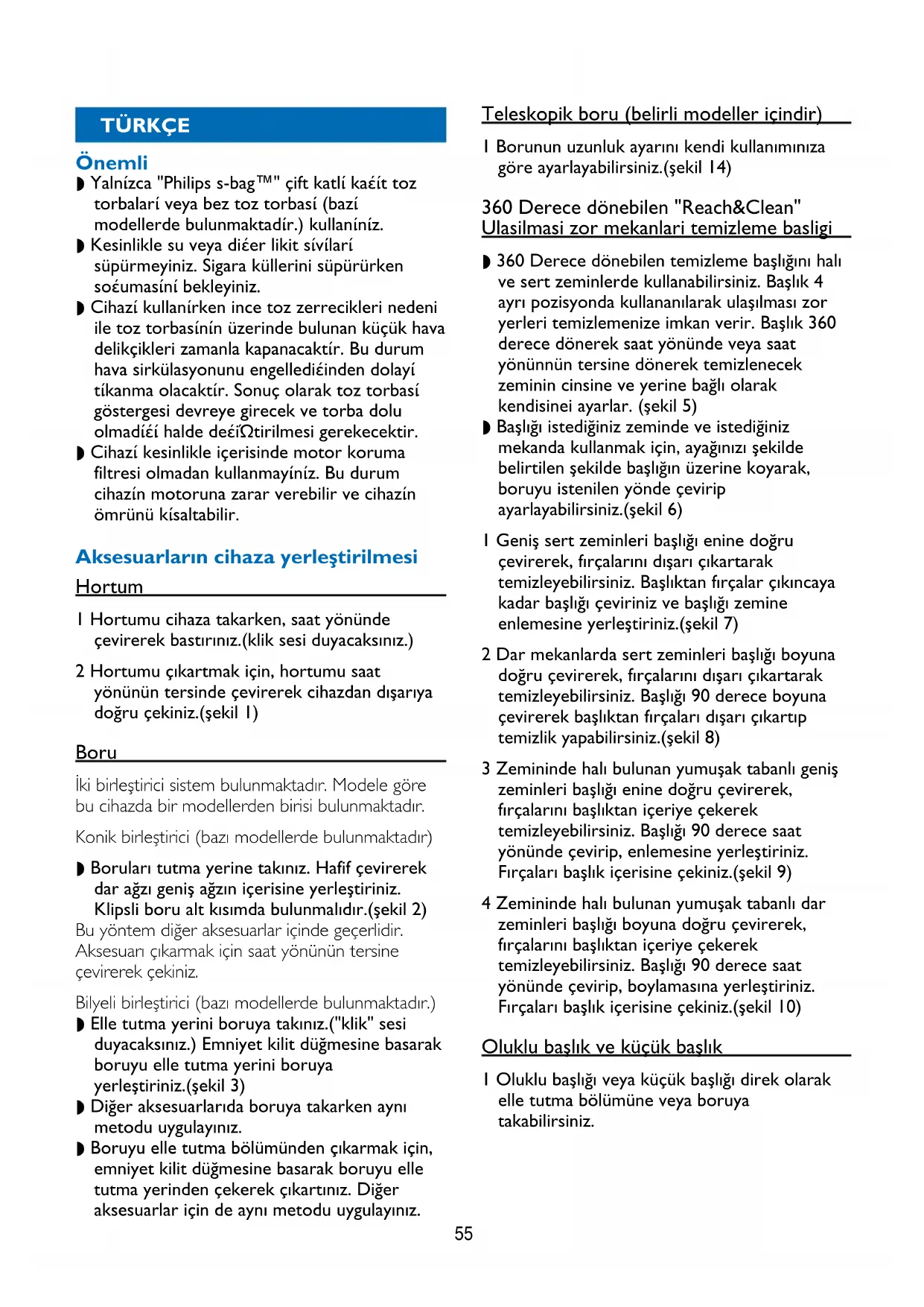 Philips.55 Önemli ◗ Yalnzca "Philips s-bag™" çift katl kat toz torbalar veya bez toz torbas (baz modellerde bulunmaktadr.) kullannz. ◗ Kesinlikle su veya dier likit svlar süpürmeyiniz. Sigara küllerini süpürürken soumasn bekleyiniz. ◗ Cihaz kullanrken ince toz zerrecikleri nedeni ile toz torbasnn üzerinde bulunan küçük hava delikçikleri zamanla kapanacaktr. Bu durum hava sirkülasyonunu engellediinden dolay tkanma olacaktr. Sonuç olarak toz torbas göstergesi devreye girecek ve torba dolu olmad halde deitirilmesi gerekecektir. ◗ Cihaz kesinlikle içerisinde motor koruma filtresi olmadan kullanmaynz. Bu durum cihazn motoruna zarar verebilir ve cihazn ömrünü ksaltabilir. Aksesuarların cihaza yerleştirilmesi Hortum 1 Hortumu cihaza takarken, saat yönünde çevirerek bastırınız.(klik sesi duyacaksınız.) 2 Hortumu çıkartmak için, hortumu saat yönünün tersinde çevirerek cihazdan dışarıya doğru çekiniz.(şekil 1) Boru İki birleştirici sistem bulunmaktadır. Modele göre bu cihazda bir modellerden birisi bulunmaktadır. Konik birleştirici (bazı modellerde bulunmaktadır) ◗ Boruları tutma yerine takınız. Hafif çevirerek dar ağzı geniş ağzın içerisine yerleştiriniz. Klipsli boru alt kısımda bulunmalıdır.(şekil 2) Bu yöntem diğer aksesuarlar içinde geçerlidir. Aksesuarı çıkarmak için saat yönünün tersine çevirerek çekiniz. Bilyeli birleştirici (bazı modellerde bulunmaktadır.) ◗ Elle tutma yerini boruya takınız.("klik" sesi duyacaksınız.) Emniyet kilit düğmesine basarak boruyu elle tutma yerini boruya yerleştiriniz.(şekil 3) ◗ Diğer aksesuarlarıda boruya takarken aynı metodu uygulayınız. ◗ Boruyu elle tutma bölümünden çıkarmak için, emniyet kilit düğmesine basarak boruyu elle tutma yerinden çekerek çıkartınız. Diğer aksesuarlar için de aynı metodu uygulayınız. Teleskopik boru (belirli modeller içindir) 1 Borunun uzunluk ayarını kendi kullanımınıza göre ayarlayabilirsiniz.(şekil 14) 360 Derece dönebilen "Reach&Clean" Ulasilmasi zor mekanlari temizleme basligi ◗ 360 Derece dönebilen temizleme başlığını halı ve sert zeminlerde kullanabilirsiniz. Başlık 4 ayrı pozisyonda kullananılarak ulaşılması zor yerleri temizlemenize imkan verir. Başlık 360 derece dönerek saat yönünde veya saat yönünnün tersine dönerek temizlenecek zeminin cinsine ve yerine bağlı olarak kendisinei ayarlar. (şekil 5) ◗ Başlığı istediğiniz zeminde ve istediğiniz mekanda kullanmak için, ayağınızı şekilde belirtilen şekilde başlığın üzerine koyarak, boruyu istenilen yönde çevirip ayarlayabilirsiniz.(şekil 6) 1 Geniş sert zeminleri başlığı enine doğru çevirerek, fırçalarını dışarı çıkartarak temizleyebilirsiniz. Başlıktan fırçalar çıkıncaya kadar başlığı çeviriniz ve başlığı zemine enlemesine yerleştiriniz.(şekil 7) 2 Dar mekanlarda sert zeminleri başlığı boyuna doğru çevirerek, fırçalarını dışarı çıkartarak temizleyebilirsiniz. Başlığı 90 derece boyuna çevirerek başlıktan fırçaları dışarı çıkartıp temizlik yapabilirsiniz.(şekil 8) 3 Zemininde halı bulunan yumuşak tabanlı geniş zeminleri başlığı enine doğru çevirerek, fırçalarını başlıktan içeriye çekerek temizleyebilirsiniz. Başlığı 90 derece saat yönünde çevirip, enlemesine yerleştiriniz. Fırçaları başlık içerisine çekiniz.(şekil 9) 4 Zemininde halı bulunan yumuşak tabanlı dar zeminleri başlığı boyuna doğru çevirerek, fırçalarını başlıktan içeriye çekerek temizleyebilirsiniz. Başlığı 90 derece saat yönünde çevirip, boylamasına yerleştiriniz. Fırçaları başlık içerisine çekiniz.(şekil 10) Oluklu başlık ve küçük başlık 1 Oluklu başlığı veya küçük başlığı direk olarak elle tutma bölümüne veya boruya takabilirsiniz.