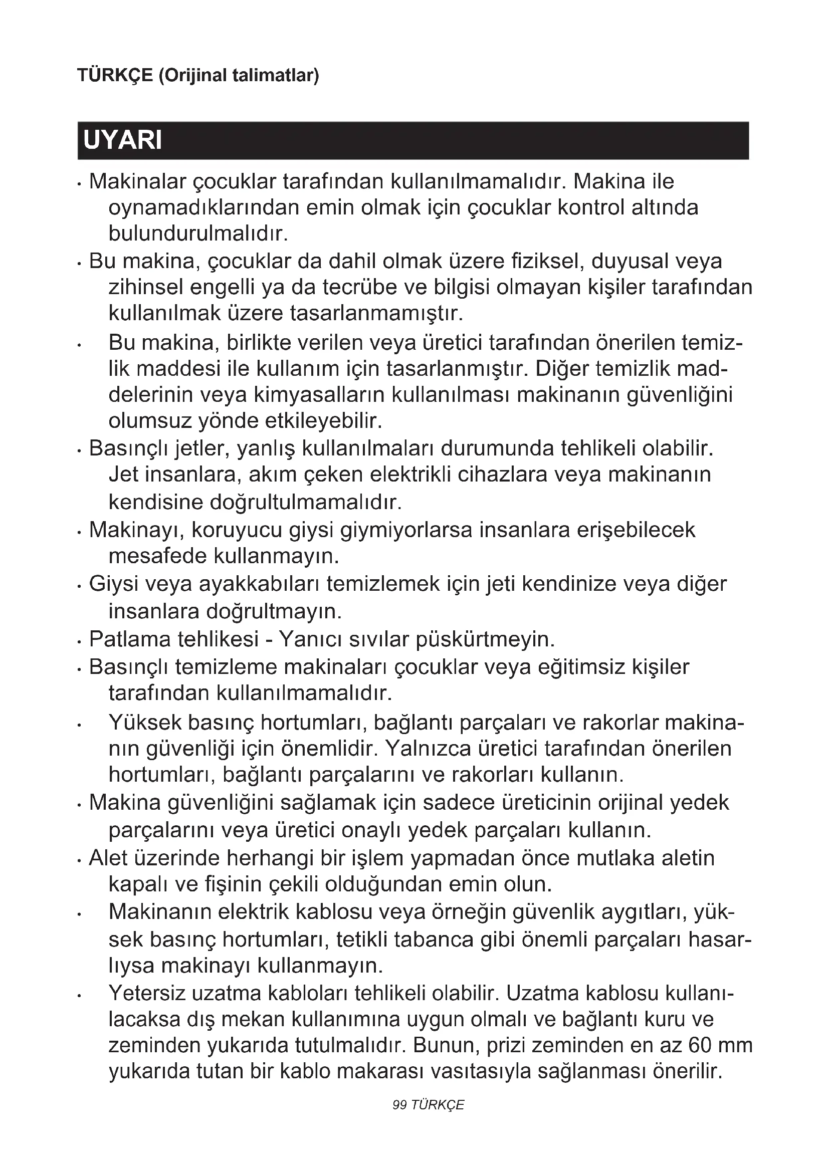 - Basınçlı temizleme makinaları çocuklar veya eğitimsiz kişiler tarafından kullanılmamalıdır.