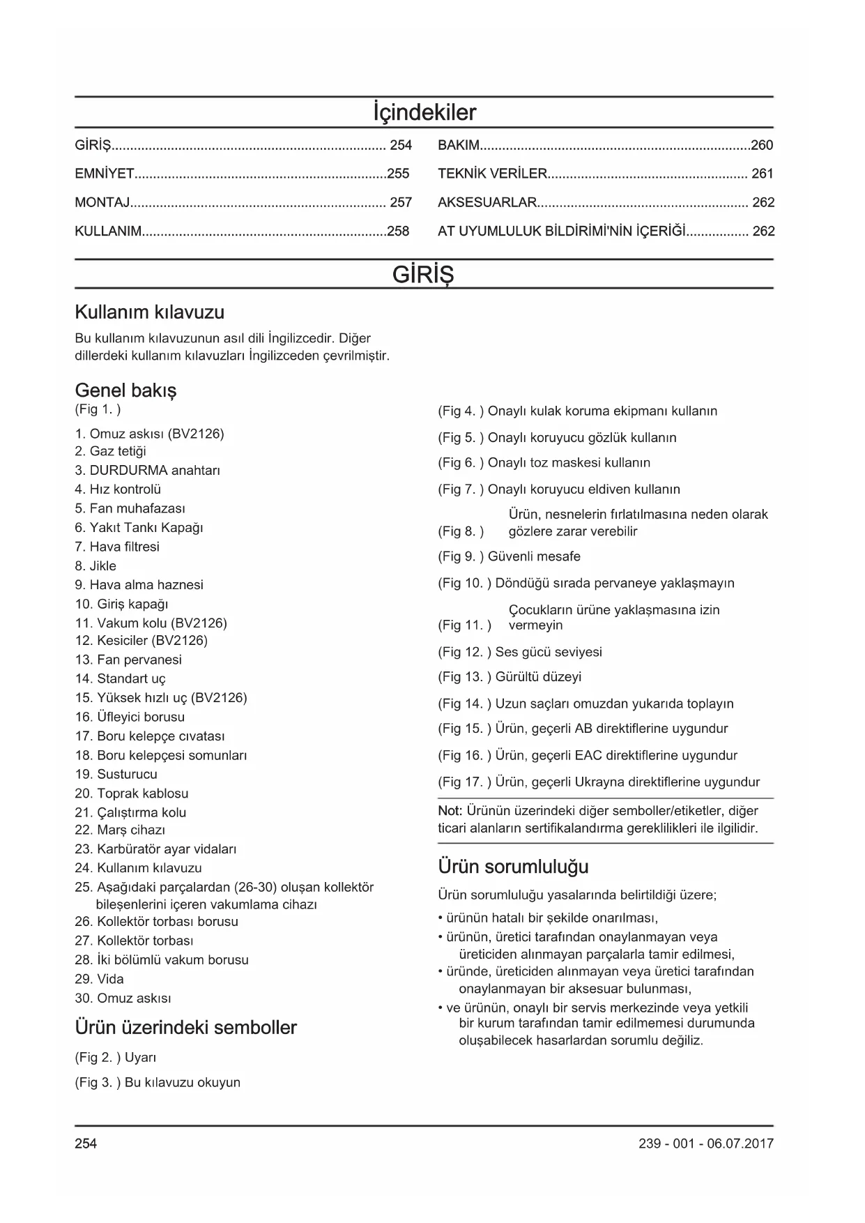 Ürün üzerindeki semboller (Fig 2. ) Uyarı (Fig 3. ) Bu kılavuzu okuyun (Fig 4. ) Onaylı kulak koruma ekipmanı kullanın (Fig 5. ) Onaylı koruyucu gözlük kullanın (Fig 6. ) Onaylı toz maskesi kullanın (Fig 7. ) Onaylı koruyucu eldiven kullanın (Fig 8. ) Ürün, nesnelerin fırlatılmasına neden olarak gözlere zarar verebilir (Fig 9. ) Güvenli mesafe (Fig 10. ) Döndüğü sırada pervaneye yaklaşmayın (Fig 11. ) Çocukların ürüne yaklaşmasına izin vermeyin (Fig 12. ) Ses gücü seviyesi (Fig 13. ) Gürültü düzeyi (Fig 14. ) Uzun saçları omuzdan yukarıda toplayın (Fig 15. ) Ürün, geçerli AB direktiflerine uygundur (Fig 16. ) Ürün, geçerli EAC direktiflerine uygundur (Fig 17. ) Ürün, geçerli Ukrayna direktiflerine uygundur Not: Ürünün üzerindeki diğer semboller/etiketler, diğer ticari alanların sertifikalandırma gereklilikleri ile ilgilidir. Ürün sorumluluğu Ürün sorumluluğu yasalarında belirtildiği üzere;