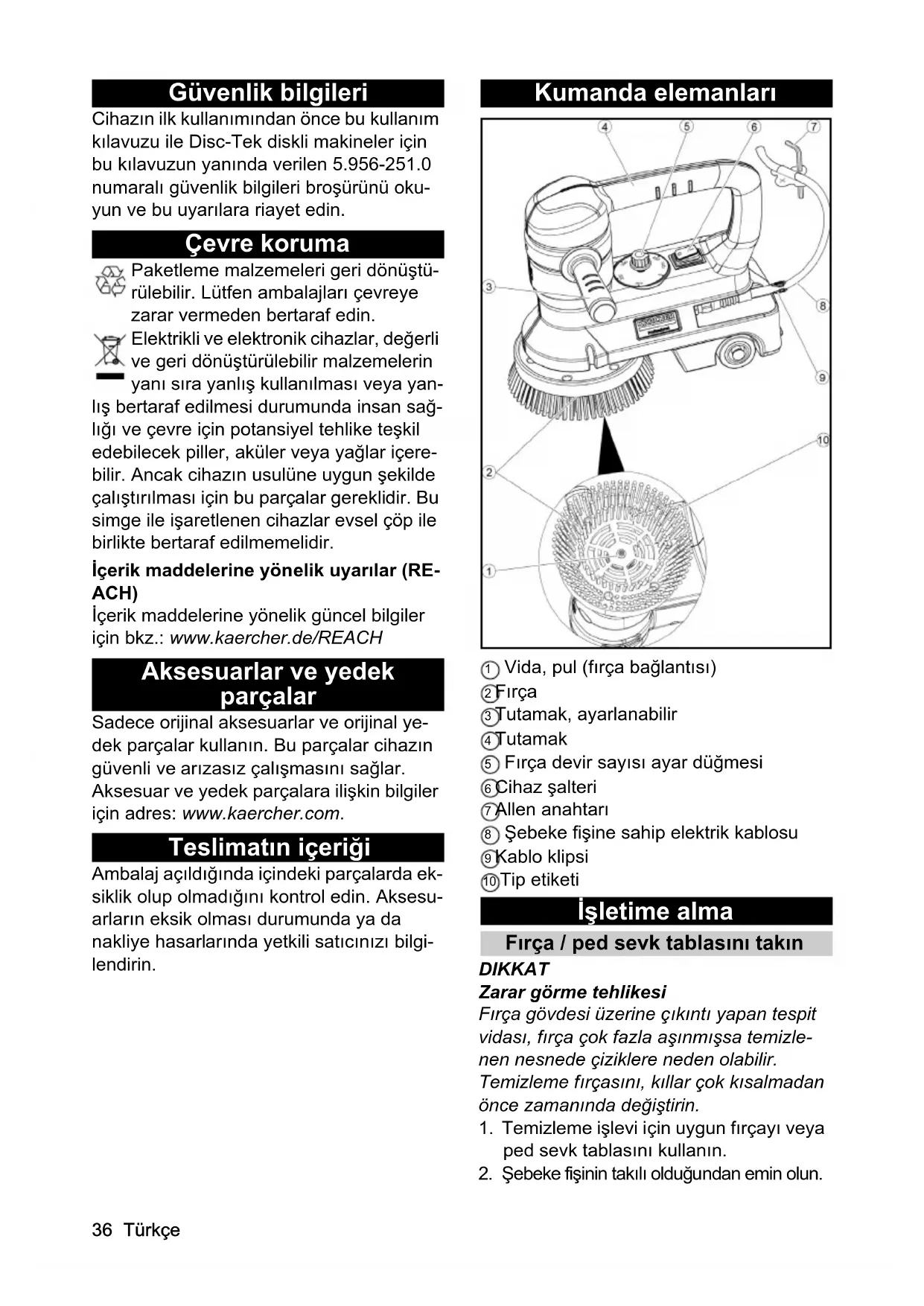 • AB Uygunluk Beyanı Türkçe Güvenlik bilgileri Cihazın ilk kullanımından önce bu kullanım kılavuzu ile Disc-Tek diskli makineler için bu kılavuzun yanında verilen 5.956-251.0 numaralı güvenlik bilgileri broşürünü oku- yun ve bu uyarılara riayet edin. Çevre koruma Paketleme malzemeleri geri dönüştü- rülebilir. Lütfen ambalajları çevreye zarar vermeden bertaraf edin. Elektrikli ve elektronik cihazlar, değerli ve geri dönüştürülebilir malzemelerin yanı sıra yanlış kullanılması veya yan- lış bertaraf edilmesi durumunda insan sağ- lığı ve çevre için potansiyel tehlike teşkil edebilecek piller, aküler veya yağlar içere- bilir. Ancak cihazın usulüne uygun şekilde çalıştırılması için bu parçalar gereklidir. Bu simge ile işaretlenen cihazlar evsel çöp ile birlikte bertaraf edilmemelidir. İçerik maddelerine yönelik uyarılar (RE- ACH) İçerik maddelerine yönelik güncel bilgiler için bkz.: www.kaercher.de/REACH Aksesuarlar ve yedek parçalar Sadece orijinal aksesuarlar ve orijinal ye- dek parçalar kullanın. Bu parçalar cihazın güvenli ve arızasız çalışmasını sağlar. Aksesuar ve yedek parçalara ilişkin bilgiler için adres: www.kaercher.com. Teslimatın içeriği Ambalaj açıldığında içindeki parçalarda ek- siklik olup olmadığını kontrol edin. Aksesu- arların eksik olması durumunda ya da nakliye hasarlarında yetkili satıcınızı bilgi- lendirin. Kumanda elemanları 1 Vida, pul (fırça bağlantısı) 2 Fırça 3 Tutamak, ayarlanabilir 4 Tutamak 5 Fırça devir sayısı ayar düğmesi 6 Cihaz şalteri 7 Allen anahtarı 8 Şebeke fişine sahip elektrik kablosu 9 Kablo klipsi 10 Tip etiketi İşletime alma Fırça / ped sevk tablasını takın DIKKAT Zarar görme tehlikesi Fırça gövdesi üzerine çıkıntı yapan tespit vidası, fırça çok fazla aşınmışsa temizle- nen nesnede çiziklere neden olabilir. Temizleme fırçasını, kıllar çok kısalmadan önce zamanında değiştirin. p. 3936