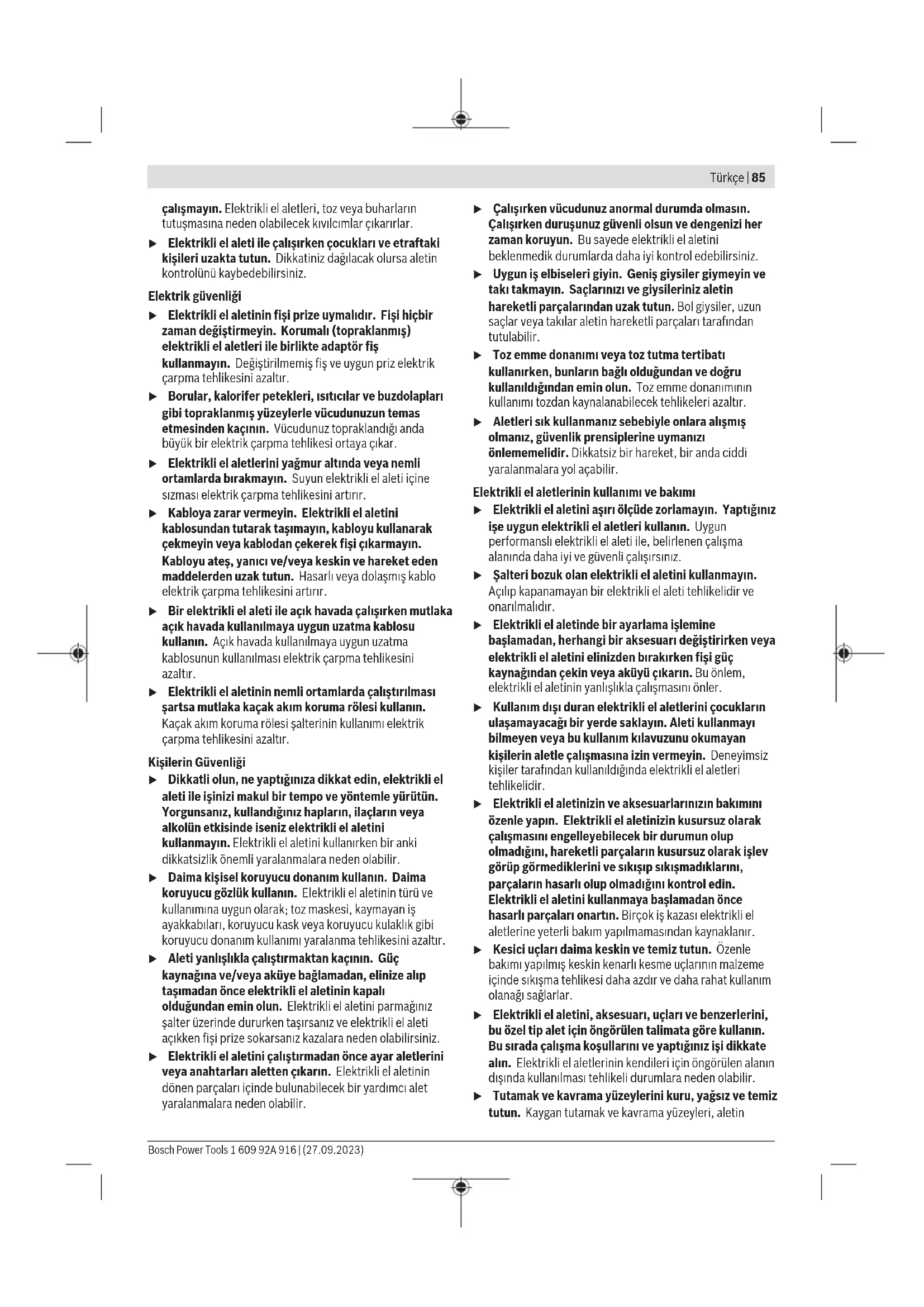 Τα ηλεκτρικά εργαλεία, οι μπαταρίες, τα εξαρτή- ματα και οι συσκευασίες πρέπει να ανακυκλώνο- νται με τρόπο φιλικό προς το περιβάλλον. Μην ρίχνετε τα ηλεκτρικά εργαλεία και τις μπατα- ρίες στα απορρίμματα του σπιτιού σας! Μόνο για χώρες τηςΕΕ: Σύμφωνα με την Ευρωπαϊκή οδηγία 2012/19/ΕΕ σχετικά με τις παλιές ηλεκτρικές και ηλεκτρονικές συσκευές και τη μετα- φορά της οδηγίας αυτής σε εθνικό δίκαιο τα άχρηστα ηλεκτρι- κά εργαλεία και σύμφωνα με την Ευρωπαϊκή οδηγία 2006/66/ΕΚ οι χαλασμένες ή χρησιμοποιημένες μπαταρίες πρέπει να συλλέγονται ξεχωριστά, για να ανακυκλωθούν με τρόπο φιλικό προς το περιβάλλον. Σε περίπτωση μη ενδεδειγμένης απόσυρσης οι ηλεκτρικές και ηλεκτρονικές συσκευές λόγω ενδεχομένης παρουσίας επικίν- δυνων ουσιών μπορούν να έχουν επιβλαβείς επιπτώσεις στο περιβάλλον και στην ανθρώπινη υγεία. Μπαταρίες/Επαναφορτιζόμενες μπαταρίες: Li-Ion: Προσέξτε παρακαλώ τις υποδείξεις στην ενότητα Μεταφορά (βλέπε «Μεταφορά», Σελίδα84). Türkçe Güvenlik talimatı Elektrikli el aletleri için genel güvenlik uyarıları UYARI Bu elektrikli el aletiyle birlikte gelen tüm güvenlik uyarılarını, talimatları, resim ve açıklamaları okuyun. Aşağıda bulunan talimatlara uyulmaması halinde elektrik çarpmalarına, yangınlara ve/veya ağır yaralanmalara neden olabilir. Bütün uyarıları ve talimat hükümlerini ileride kullanmak üzere saklayın. Uyarı ve talimat hükümlerinde kullanılan "elektrikli el aleti" terimi, akım şebekesine bağlı (elektrikli) aletlerle akü ile çalışan aletleri (akülü) kapsamaktadır. Çalışma yeri güvenliği u Çalıştığınız yeri temiz tutun ve iyi aydınlatın. Dağınık veya karanlık alanlar kazalara davetiye çıkarır. u Yakınında patlayıcı maddeler, yanıcı sıvı, gaz veya tozların bulunduğu yerlerde elektrikli el aleti ile 1 609 92A 916 | (27.09.2023) Bosch Power ToolsTürkçe | 85 çalışmayın. Elektrikli el aletleri, toz veya buharların tutuşmasına neden olabilecek kıvılcımlar çıkarırlar. u Elektrikli el aleti ile çalışırken çocukları ve etraftaki kişileri uzakta tutun. Dikkatiniz dağılacak olursa aletin kontrolünü kaybedebilirsiniz. Elektrik güvenliği u Elektrikli el aletinin fişi prize uymalıdır. Fişi hiçbir zaman değiştirmeyin. Korumalı (topraklanmış) elektrikli el aletleri ile birlikte adaptör fiş kullanmayın. Değiştirilmemiş fiş ve uygun priz elektrik çarpma tehlikesini azaltır. u Borular, kalorifer petekleri, ısıtıcılar ve buzdolapları gibi topraklanmış yüzeylerle vücudunuzun temas etmesinden kaçının. Vücudunuz topraklandığı anda büyük bir elektrik çarpma tehlikesi ortaya çıkar. u Elektrikli el aletlerini yağmur altında veya nemli ortamlarda bırakmayın. Suyun elektrikli el aleti içine sızması elektrik çarpma tehlikesini artırır. u Kabloya zarar vermeyin. Elektrikli el aletini kablosundan tutarak taşımayın, kabloyu kullanarak çekmeyin veya kablodan çekerek fişi çıkarmayın. Kabloyu ateş, yanıcı ve/veya keskin ve hareket eden maddelerden uzak tutun. Hasarlı veya dolaşmış kablo elektrik çarpma tehlikesini artırır. u Bir elektrikli el aleti ile açık havada çalışırken mutlaka açık havada kullanılmaya uygun uzatma kablosu kullanın. Açık havada kullanılmaya uygun uzatma kablosunun kullanılması elektrik çarpma tehlikesini azaltır. u Elektrikli el aletinin nemli ortamlarda çalıştırılması şartsa mutlaka kaçak akım koruma rölesi kullanın. Kaçak akım koruma rölesi şalterinin kullanımı elektrik çarpma tehlikesini azaltır. Kişilerin Güvenliği u Dikkatli olun, ne yaptığınıza dikkat edin, elektrikli el aleti ile işinizi makul bir tempo ve yöntemle yürütün. Yorgunsanız, kullandığınız hapların, ilaçların veya alkolün etkisinde iseniz elektrikli el aletini kullanmayın. Elektrikli el aletini kullanırken bir anki dikkatsizlik önemli yaralanmalara neden olabilir. u Daima kişisel koruyucu donanım kullanın. Daima koruyucu gözlük kullanın. Elektrikli el aletinin türü ve kullanımına uygun olarak; toz maskesi, kaymayan iş ayakkabıları, koruyucu kask veya koruyucu kulaklık gibi koruyucu donanım kullanımı yaralanma tehlikesini azaltır. u Aleti yanlışlıkla çalıştırmaktan kaçının. Güç kaynağına ve/veya aküye bağlamadan, elinize alıp taşımadan önce elektrikli el aletinin kapalı olduğundan emin olun. Elektrikli el aletini parmağınız şalter üzerinde dururken taşırsanız ve elektrikli el aleti açıkken fişi prize sokarsanız kazalara neden olabilirsiniz. u Elektrikli el aletini çalıştırmadan önce ayar aletlerini veya anahtarları aletten çıkarın. Elektrikli el aletinin dönen parçaları içinde bulunabilecek bir yardımcı alet yaralanmalara neden olabilir. u Çalışırken vücudunuz anormal durumda olmasın. Çalışırken duruşunuz güvenli olsun ve dengenizi her zaman koruyun. Bu sayede elektrikli el aletini beklenmedik durumlarda daha iyi kontrol edebilirsiniz. u Uygun iş elbiseleri giyin. Geniş giysiler giymeyin ve takı takmayın. Saçlarınızı ve giysileriniz aletin hareketli parçalarından uzak tutun. Bol giysiler, uzun saçlar veya takılar aletin hareketli parçalar