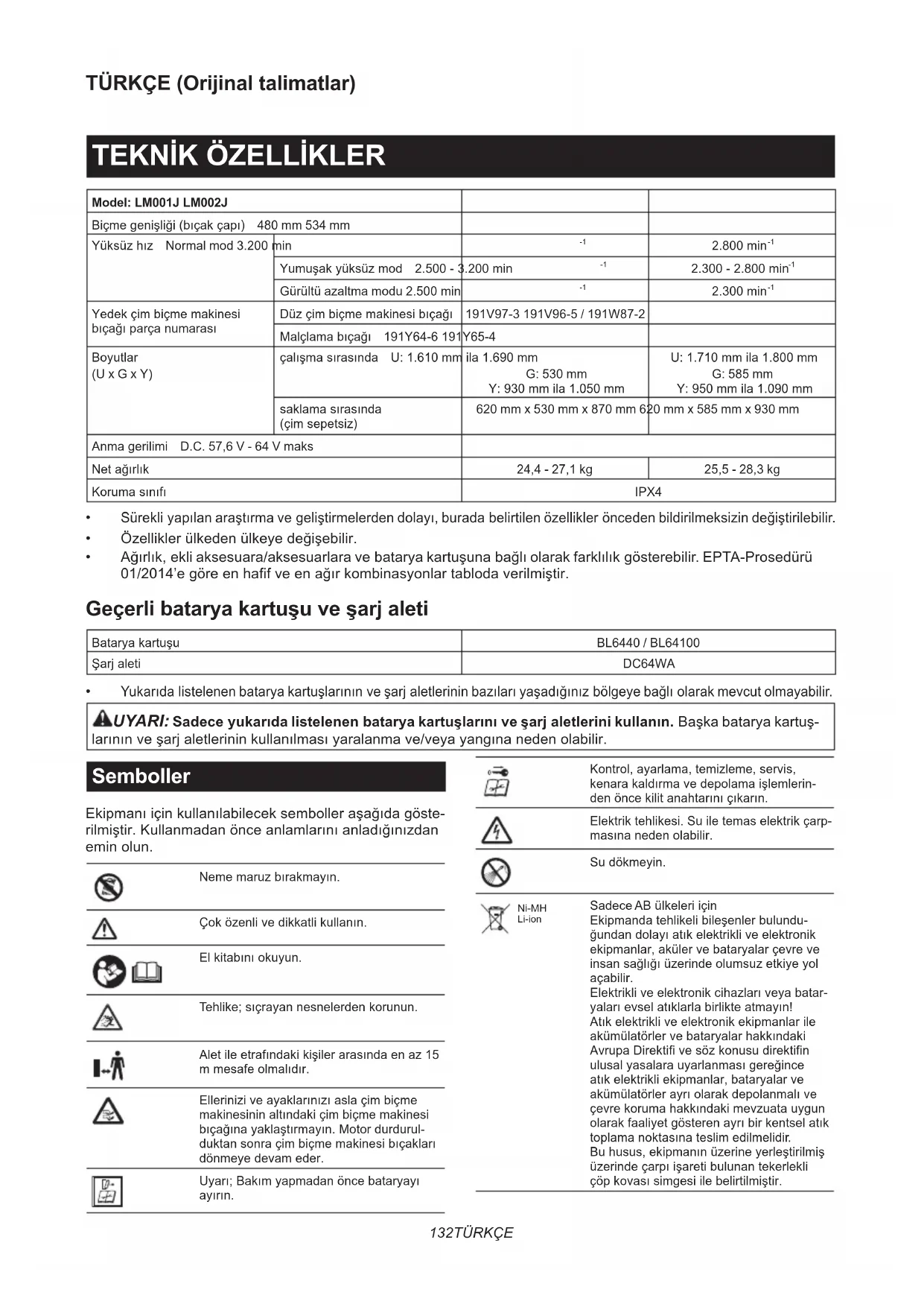 Yedekçimbiçmemakinesi bıçağıparçanumarası Düzçimbiçmemakinesibıçağı 191V97-3 191V96-5 / 191W87-2 Malçlamabıçağı 191Y64-6 191Y65-4 Boyutlar (U x G x Y) çalışmasırasında U:1.610mmila1.690mm G: 530 mm Y:930mmila1.050mm U:1.710mmila1.800mm G: 585 mm Y:950mmila1.090mm saklamasırasında (çimsepetsiz) 620 mm x 530 mm x 870 mm 620 mm x 585 mm x 930 mm Anmagerilimi D.C. 57,6 V - 64 V maks Netağırlık 24,4 - 27,1 kg 25,5 - 28,3 kg Korumasınıfı IPX4