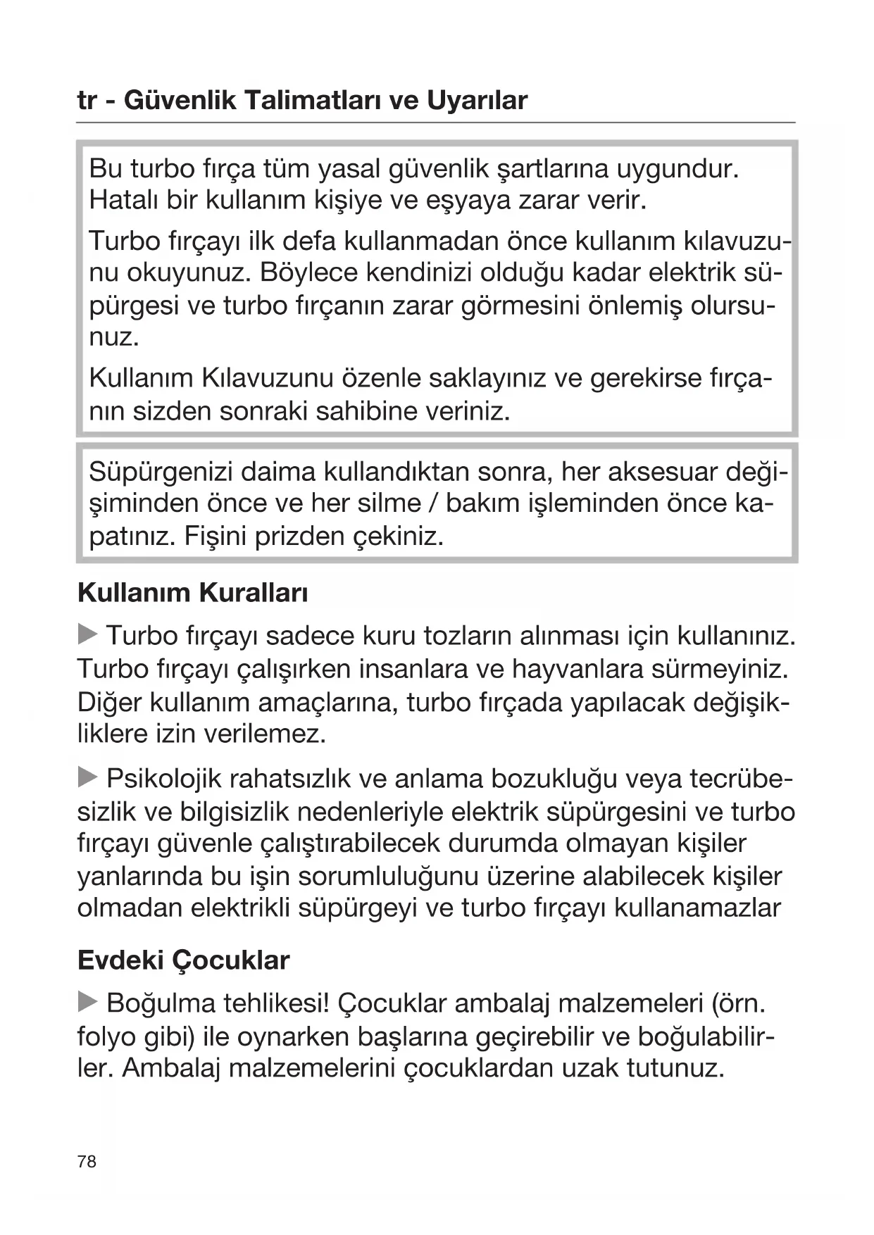 Bu turbo fırça tüm yasal güvenlik şartlarına uygundur. Hatalı bir kullanım kişiye ve eşyaya zarar verir. Turbo fırçayı ilk defa kullanmadan önce kullanım kılavuzu- nu okuyunuz. Böylece kendinizi olduğu kadar elektrik sü- pürgesi ve turbo fırçanın zarar görmesini önlemiş olursu- nuz. Kullanım Kılavuzunu özenle saklayınız ve gerekirse fırça- nın sizden sonraki sahibine veriniz. Süpürgenizi daima kullandıktan sonra, her aksesuar deği- şiminden önce ve her silme / bakım işleminden önce ka- patınız. Fişini prizden çekiniz. Kullanım Kuralları Turbo fırçayı sadece kuru tozların alınması için kullanınız. Turbo fırçayı çalışırken insanlara ve hayvanlara sürmeyiniz. Diğer kullanım amaçlarına, turbo fırçada yapılacak değişik- liklere izin verilemez. Psikolojik rahatsızlık ve anlama bozukluğu veya tecrübe- sizlik ve bilgisizlik nedenleriyle elektrik süpürgesini ve turbo fırçayı güvenle çalıştırabilecek durumda olmayan kişiler yanlarında bu işin sorumluluğunu üzerine alabilecek kişiler olmadan elektrikli süpürgeyi ve turbo fırçayı kullanamazlar Evdeki Çocuklar Boğulma tehlikesi! Çocuklar ambalaj malzemeleri (örn. folyo gibi) ile oynarken başlarına geçirebilir ve boğulabilir- ler. Ambalaj malzemelerini çocuklardan uzak tutunuz.tr - Güvenlik Talimatları ve Uyarılar