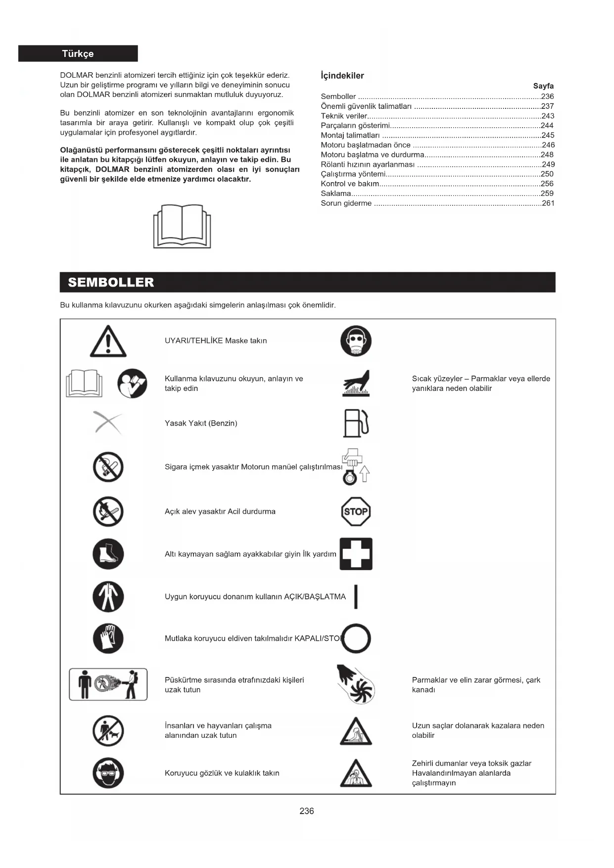 - DOLMAR benzinli atomizeri tercih ettiğiniz için çok teşekkür ederiz. Uzun bir geliştirme programı ve yılların bilgi ve deneyiminin sonucu olan DOLMAR benzinli atomizeri sunmaktan mutluluk duyuyoruz. Bu benzinli atomizer en son teknolojinin avantajlarını ergonomik tasarımla bir araya getirir. Kullanışlı ve kompakt olup çok çeşitli uygulamalar için profesyonel aygıtlardır. Olağanüstü performansını gösterecek çeşitli noktaları ayrıntısı ile anlatan bu kitapçığı lütfen okuyun, anlayın ve takip edin. Bu kitapçık, DOLMAR benzinli atomizerden olası en iyi sonuçları güvenli bir şekilde elde etmenize yardımcı olacaktır. Türkçe SEMBOLLER Bu kullanma kılavuzunu okurken aşağıdaki simgelerin anlaşılması çok önemlidir. UYARI/TEHLİKE Maske takın Kullanma kılavuzunu okuyun, anlayın ve takip edin Sıcak yüzeyler – Parmaklar veya ellerde yanıklara neden olabilir Yasak Yakıt (Benzin) Sigara içmek yasaktır Motorun manüel çalıştırılması Açık alev yasaktır Acil durdurma Altı kaymayan sağlam ayakkabılar giyin İlk yardım Uygun koruyucu donanım kullanın AÇIK/BAŞLATMA Mutlaka koruyucu eldiven takılmalıdır KAPALI/STOP Püskürtme sırasında etrafınızdaki kişileri uzak tutun Parmaklar ve elin zarar görmesi, çark kanadı İnsanları ve hayvanları çalışma alanından uzak tutun Uzun saçlar dolanarak kazalara neden olabilir Koruyucu gözlük ve kulaklık takın Zehirli dumanlar veya toksik gazlar Havalandırılmayan alanlarda çalıştırmayın İçindekiler Sayfa Semboller p. 236