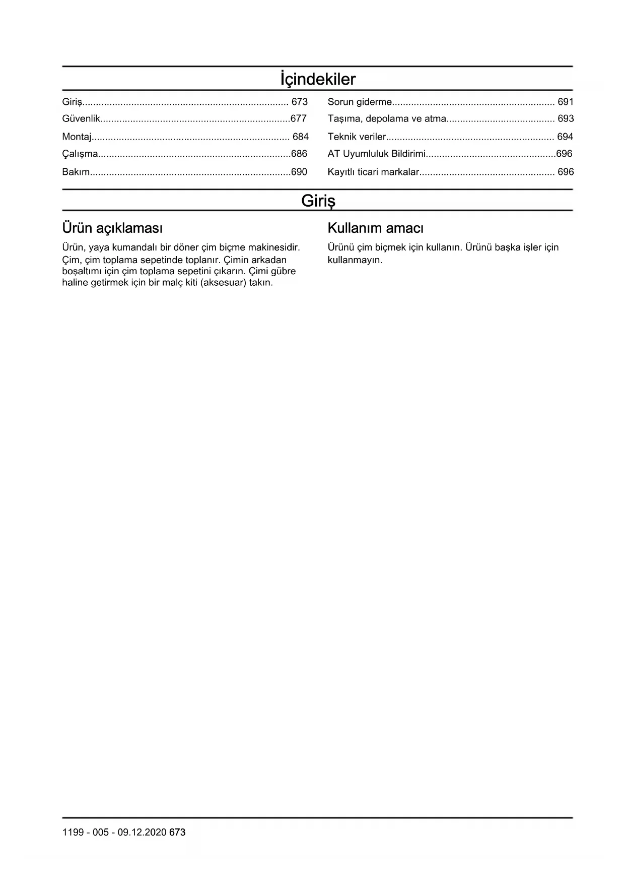 - Kayıtlı ticari markalar Giriş Ürün açıklaması Ürün, yaya kumandalı bir döner çim biçme makinesidir. Çim, çim toplama sepetinde toplanır. Çimin arkadan boşaltımı için çim toplama sepetini çıkarın. Çimi gübre haline getirmek için bir malç kiti (aksesuar) takın. Kullanım amacı Ürünü çim biçmek için kullanın. Ürünü başka işler için kullanmayın. 1199 - 005 - 09.12.2020 673Ürüne genel bakış p. 696