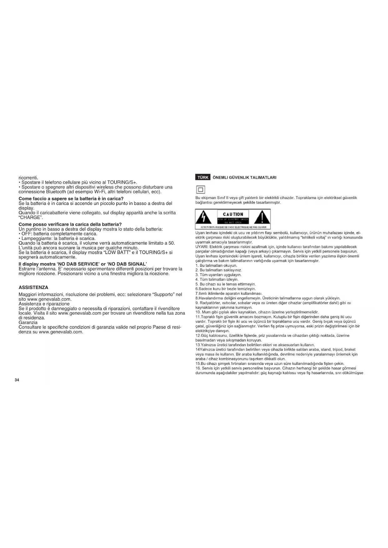 - Yanıp Sönüyor: Pil zayıf. Batarya düşük olduğunda, ses otomatik olarak 50 ile sınırlandırılır. Cihaz hala birkaç dakika müzik çalabilir. Pil boşsa, ekranda “DÜŞÜK BATT” görünecek ve TOURING / S + otomatik olarak kapanacaktır. Ekranda ‘NO DAB SERVICE’ veya ‘NO DAB SIGNAL’ görüntülenir Anteni uzat. En iyi alımı bulmak için farklı pozisyonları denemek zorunda kalabilirsiniz. Yukarı ya da daha yakın pencerelerin bulunduğu pozisyonlar, alımı iyileştirebilir. Daha fazla bilgi, sorun giderme, vb. www.genevalab.com adresinden “SUPPORT” i seçin Servis ve tamir Ürün hasar görmüşse ve tamir gerekiyorsa, lütfen satıcınıza başvurun. Bölge- nizde bir satıcı bulmak için www.genevalab.com adresini ziyaret edin. garanti Ülkenizin www.genevalab.com adresindeki spesik şartlarına bakın.