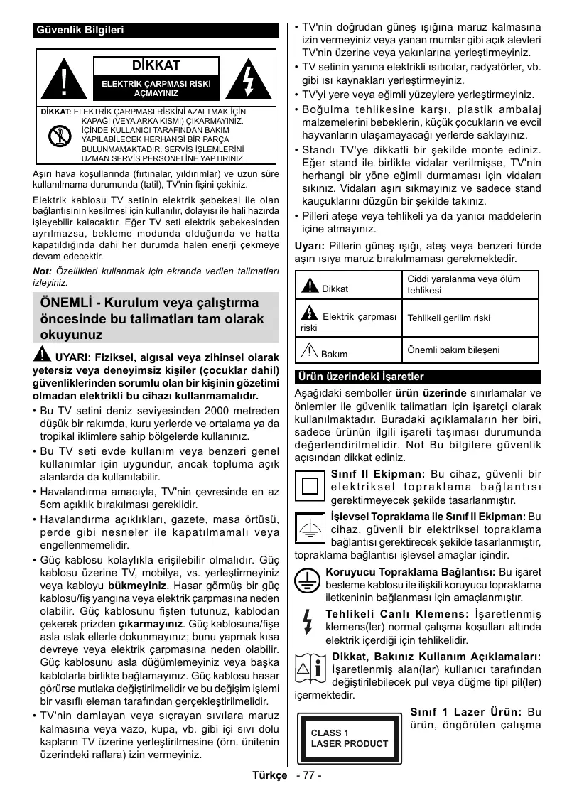 Symboles sur le produit26 Entretien27 Fixation / Retrait du Piédestal28 Lors de l'utilisation de l’applique de suspension au mur28 Informations sur l'environnement28 Fonctions29 Accessoires Inclus29 Mise en Veille29 Commutateur de commande et fonctionnement de la TV29 Insertion des piles dans la télécommande30 Branchement à l'alimentation 30 Branchement de l’antenne30 Notification30 Spécifications32 Télécommande33 Utilisation de la Liste de Chaînes42 Configuration des Paramètres Parentaux42 Guide des Programmes Électroniques (EPG)42 Services Télétexte43 Mise à Jour du Logiciel43 Résolution des Problèmes et Astuces44 Modes d’affichage Typiques d’une Entrée de PC.. 44 Compatibilité des Signaux AV et HDMI45 Formats de fichiers vidéo pris en charge pour le mode USB46 Formats de fichiers image pris en charge pour le mode USB46 Formats de fichiers audio pris en charge pour le mode USB47 Formats de fichiers de sous-titrage pris en charge pour le mode USB48 Résolutions DVI prises en charge49