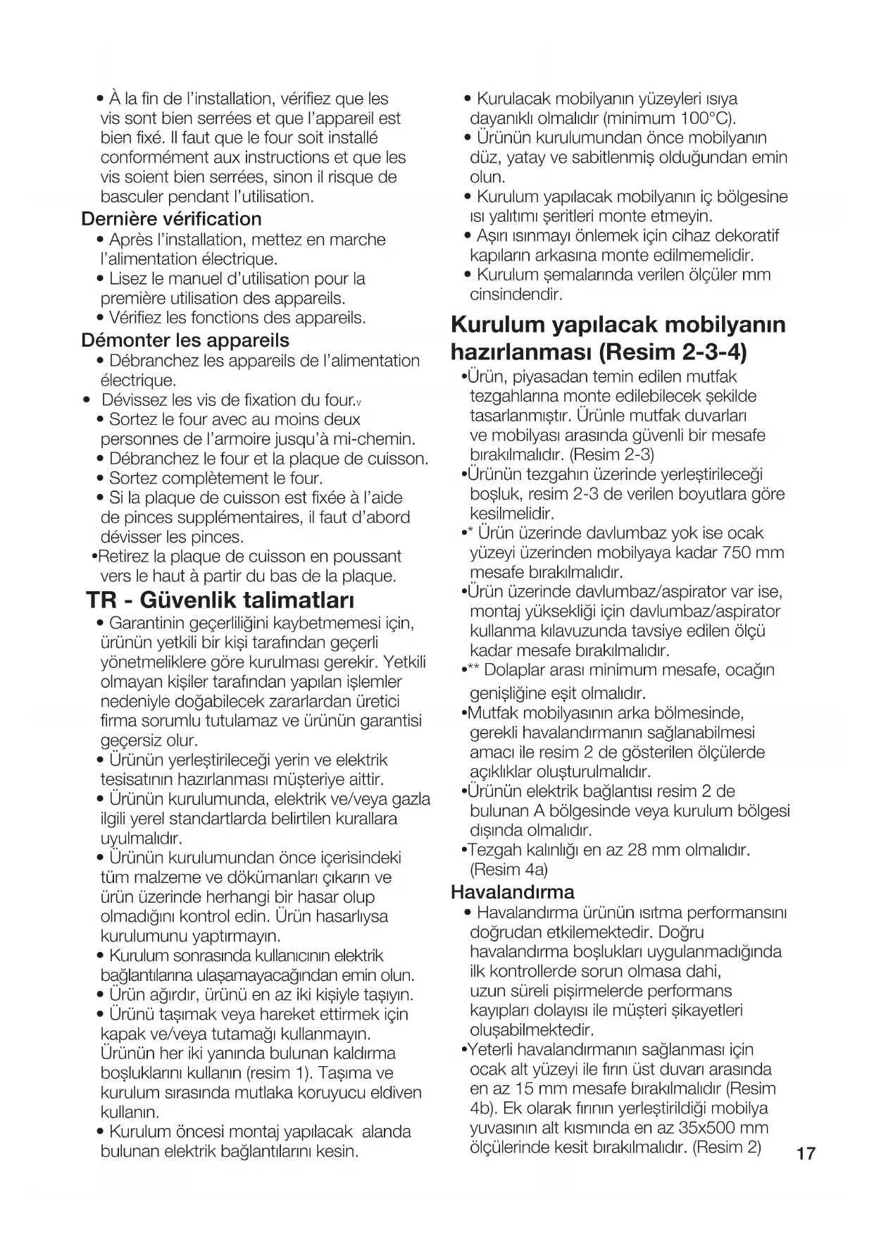 - Kurulum şemalarında verilen ölçüler mm cinsindendir. Kurulum yapılacak mobilyanın hazırlanması (Resim 2-3-4)