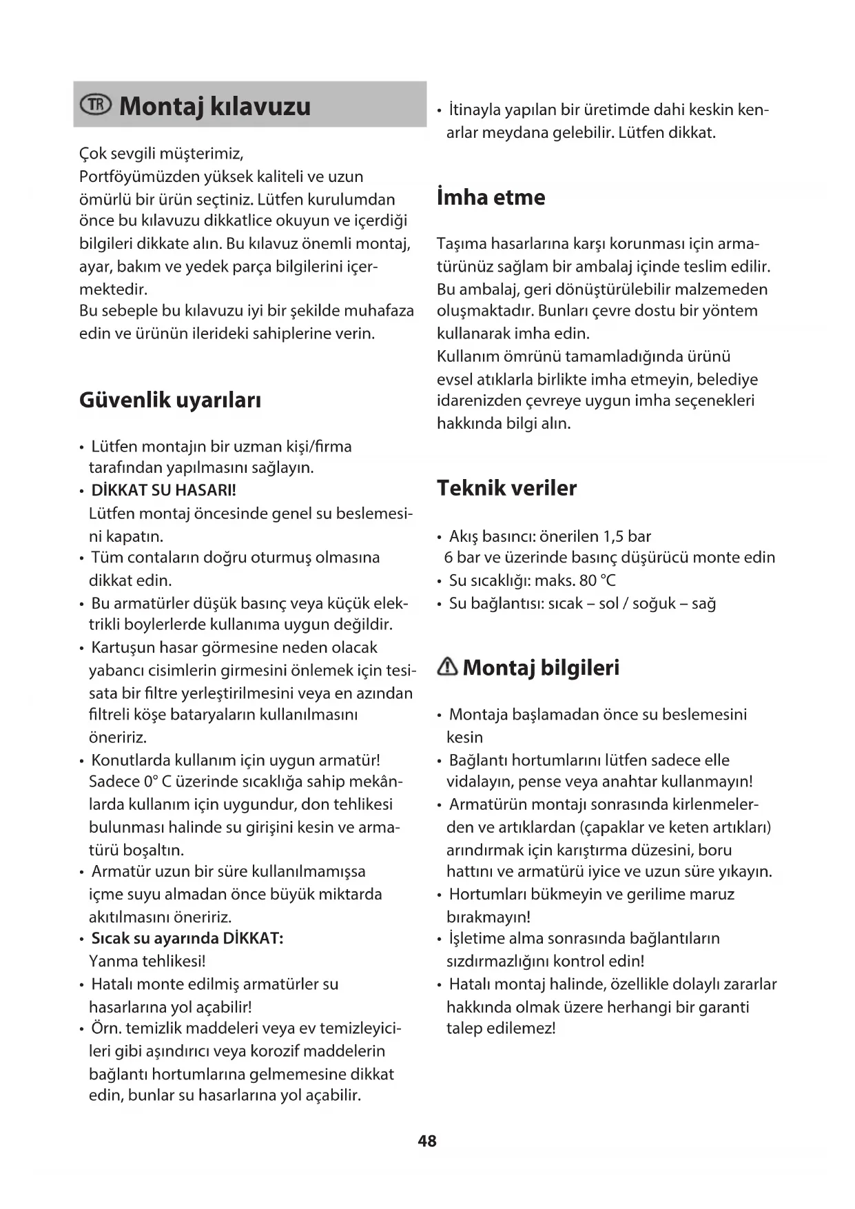 • Hatalı monte edilmiş armatürler su hasarlarına yol açabilir!