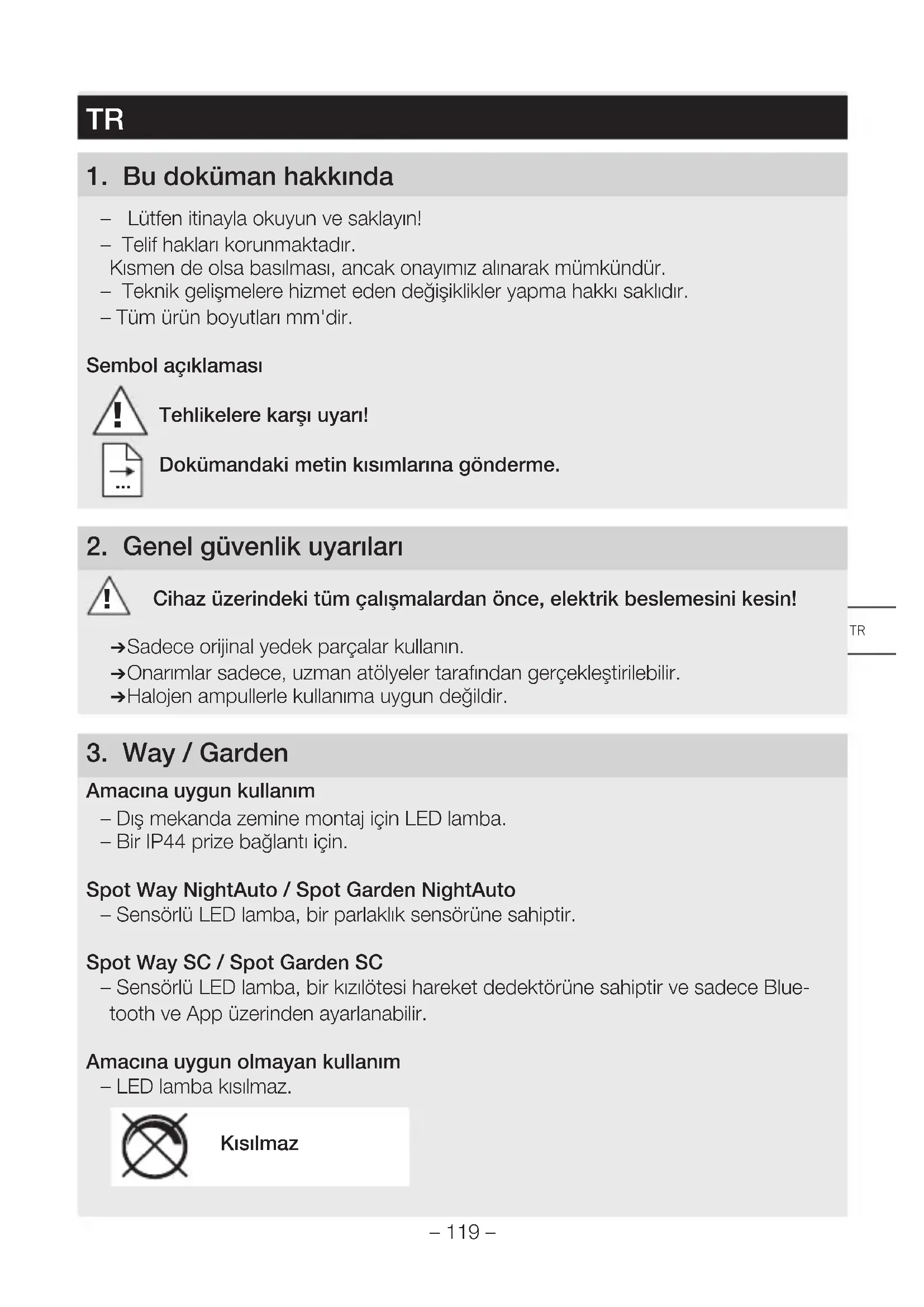 Amacına uygun kullanım – Dış mekanda zemine montaj için LED lamba. – Bir IP44 prize bağlantı için. Spot Way NightAuto/Spot Garden NightAuto – Sensörlü LED lamba, bir parlaklık sensörüne sahiptir. Spot Way SC/Spot Garden SC – Sensörlü LED lamba, bir kızılötesi hareket dedektörüne sahiptir ve sadece Blue- tooth ve App üzerinden ayarlanabilir. Amacına uygun olmayan kullanım – LED lamba kısılmaz. Kısılmaz TR– 120 – Spot Way teslimat kapsamı (Şek. 3.1) – Direk, zemin plakası ve elektrik fişli bağlantı kablosu dahil lamba – Üç vida – Üç dübel Spot Garden teslimat kapsamı (Şek. 3.2) – Elektrik fişli bağlantı kablosu dahil lamba – Çakma çubuğu – Iki vida Spot Way ürün boyutları (Şek. 3.3) Spot Garden ürün boyutları (Şek. 3.4) Ürüne genel bakış (Şek. 3.5 – 3.10) A Lamba gövdesi B Hareket sensörü (sadece Spot Way / Spot Garden SC) C Parlaklık sensörü (sadece Spot Way/Garden NightAuto) D Alacakaranlık ayarı (sadece Spot Way/Garden NightAuto) E Zemin plakası ile direk (sadece Spot Way) F Çakma çubuğu (sadece Spot Garden) G Fişli elektrik bağlantı kablosu Kapsama alanı Spot Way / Spot Garden SC (Şek. 3.11 – 3.16) Işık şiddeti dağılımı (Şek. 3.17)
