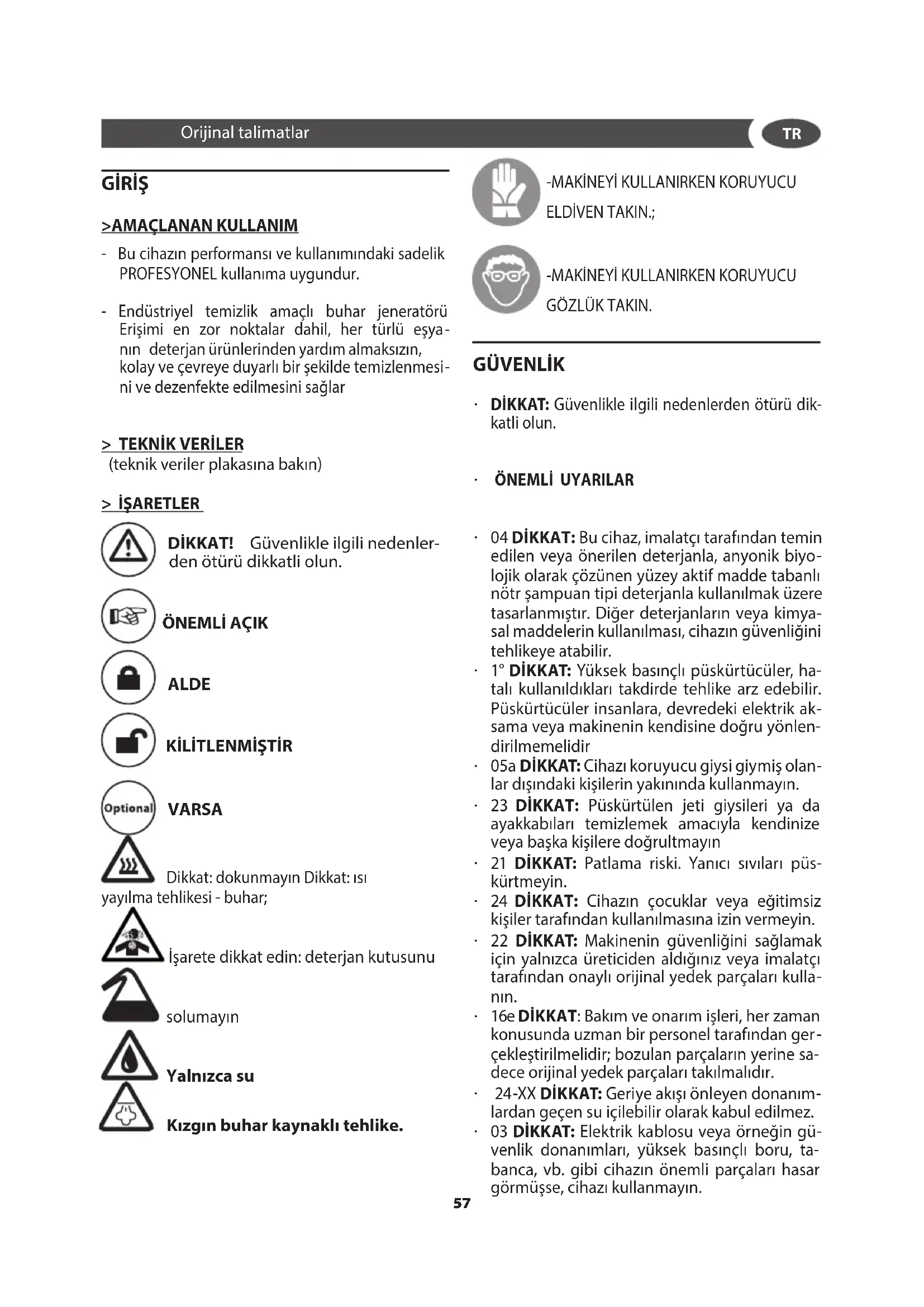 DİKKAT: V15 Operatörün sağlığının korunması amacıyla İma- latçı tarafından yerleştirilmiş korumaların makine çalışırken çıkarılması kesinlikle yasaktır. - Makinenin uzman ve ehil bir personel tarafından kullanılmasına izin verilir. - Buhar tabancasını insanlara veya plastik, kristal ya da 180°C sıcaklıkta buharla teması erimesine veya bozulmasına neden olabilecek diğer malzemeler