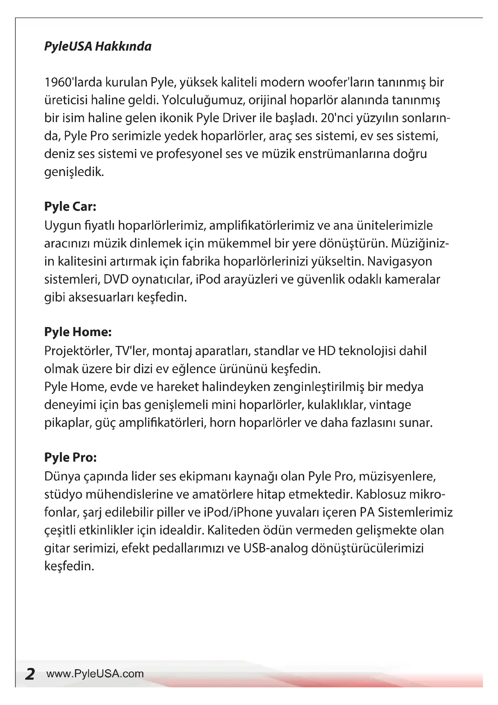 TURPyleUSA Hakkında 1960'larda kurulan Pyle, yüksek kaliteli modern woofer'ların tanınmış bir üreticisi haline geldi. Yolculuğumuz, orijinal hoparlör alanında tanınmış bir isim haline gelen ikonik Pyle Driver ile başladı. 20'nci yüzyılın sonların- da, Pyle Pro serimizle yedek hoparlörler, araç ses sistemi, ev ses sistemi, deniz ses sistemi ve profesyonel ses ve müzik enstrümanlarına doğru genişledik. Pyle Car: Uygun yatlı hoparlörlerimiz, amplikatörlerimiz ve ana ünitelerimizle aracınızı müzik dinlemek için mükemmel bir yere dönüştürün. Müziğiniz- in kalitesini artırmak için fabrika hoparlörlerinizi yükseltin. Navigasyon sistemleri, DVD oynatıcılar, iPod arayüzleri ve güvenlik odaklı kameralar gibi aksesuarları keşfedin. Pyle Home: Projektörler, TV'ler, montaj aparatları, standlar ve HD teknolojisi dahil olmak üzere bir dizi ev eğlence ürününü keşfedin. Pyle Home, evde ve hareket halindeyken zenginleştirilmiş bir medya deneyimi için bas genişlemeli mini hoparlörler, kulaklıklar, vintage pikaplar, güç amplikatörleri, horn hoparlörler ve daha fazlasını sunar. Pyle Pro: Dünya çapında lider ses ekipmanı kaynağı olan Pyle Pro, müzisyenlere, stüdyo mühendislerine ve amatörlere hitap etmektedir. Kablosuz mikro- fonlar, şarj edilebilir piller ve iPod/iPhone yuvaları içeren PA Sistemlerimiz çeşitli etkinlikler için idealdir. Kaliteden ödün vermeden gelişmekte olan gitar serimizi, efekt pedallarımızı ve USB-analog dönüştürücülerimizi keşfedin. www.PyleUSA.com 2Kullanıcıyı, ürünün muhafazası içinde bir kişiye elektrik çarpması riski yaratacak kadar güçlü olabilecek yalıtılmamış "Tehlikeli Gerilim" varlığı konusunda uyarmak için tasarlanmıştır. Kullanıcıyı, ürünle birlikte verilen literatürde önemli açma ve bakım (servis) talimatlarının varlığına karşı uyarma amaçlıdır.