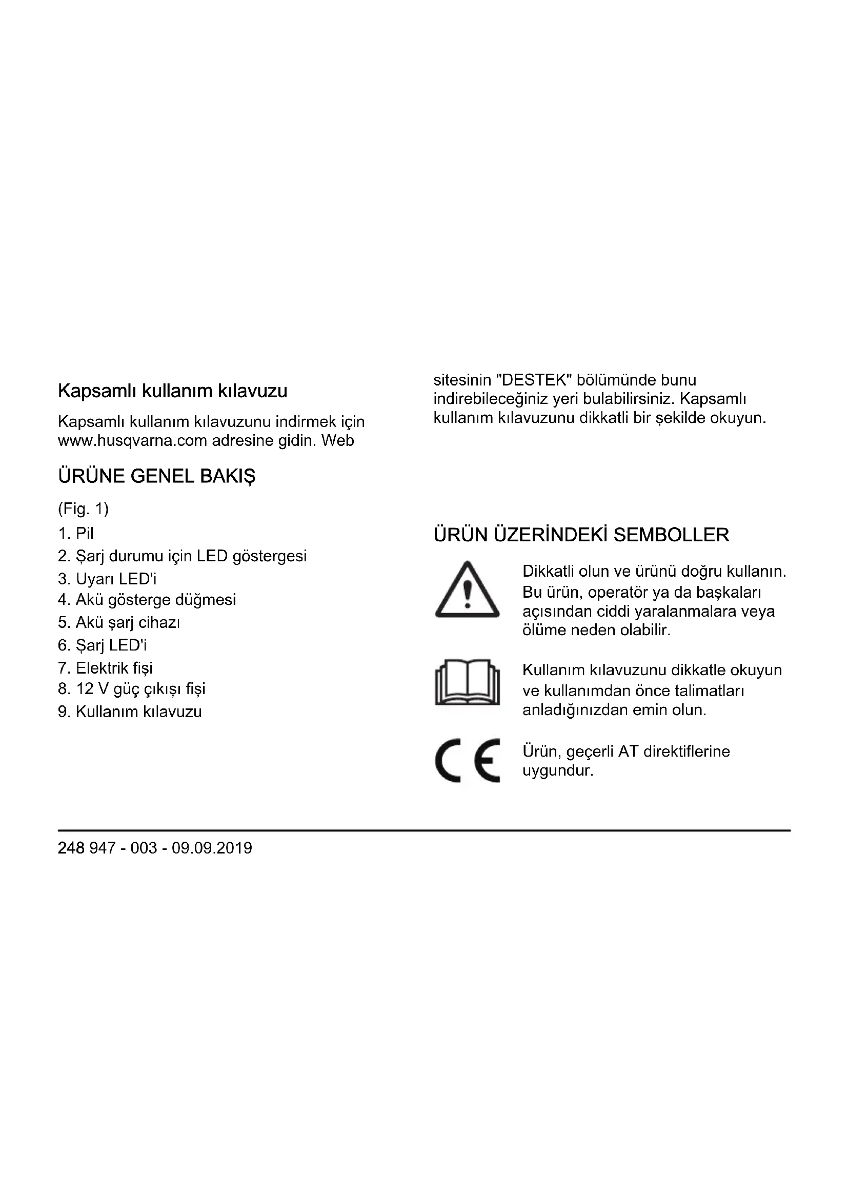 Dikkatli olun ve ürünü doğru kullanın. Bu ürün, operatör ya da başkaları açısından ciddi yaralanmalara veya ölüme neden olabilir. Kullanım kılavuzunu dikkatle okuyun ve kullanımdan önce talimatları anladığınızdan emin olun. Ürün, geçerli AT direktiflerine uygundur. 248 947 - 003 - 09.09.2019Ürün ya da ürünün ambalajı evsel atık değildir. Ürünü elektrikli ve elektronik ekipmanlara özel uygun bir atık tesisinde geri dönüştürün. Üniteyi su ve yağmurdan uzak tutun. Akü şarj cihazını sadece kapalı mekanlarda kullanın ve saklayın. Not: Ürünün üzerindeki diğer semboller/etiketler, bazı ticari alanların sertifikalandırma gereklilikleri ile ilgilidir.