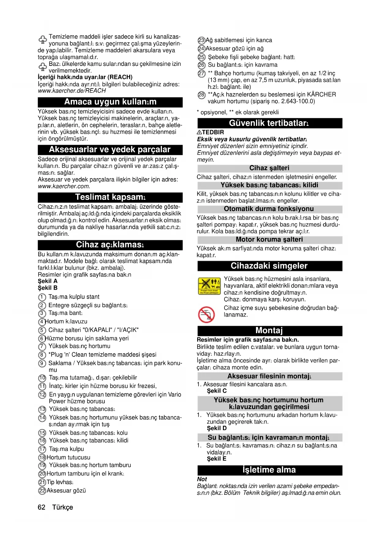- opsiyonel, ** ek olarak gerekli Güvenlik tertibatları 몇 TEDBIR Eksik veya kusurlu güvenlik tertibatları Emniyet düzenleri sizin emniyetiniz içindir. Emniyet düzenlerini asla değiştirmeyin veya baypas et- meyin. Cihaz şalteri Cihaz şalteri, cihazın istenmeden işletmesini engeller. Yüksek basınç tabancası kilidi Kilit, yüksek basınç tabancasının kolunu kilitler ve ciha- zın istenmeden başlatılmasını engeller. Otomatik durma fonksiyonu Yüksek basınç tabancasının kolu bırakılırsa bir basınç şalteri pompayı kapatır, yüksek basınç huzmesi durdu- rulur. Kola basıldığında pompa tekrar açılır. Motor koruma şalteri Yüksek akım sarfiyatında motor koruma şalteri cihazı kapatır. Cihazdaki simgeler Montaj Resimler için grafik sayfasına bakın. Birlikte teslim edilen cıvataları ve bunlara uygun torna- vidayı hazırlayın. İşletime alma öncesinde ayrı olarak birlikte verilen par- çaları cihaza monte edin. Aksesuar filesinin montajı